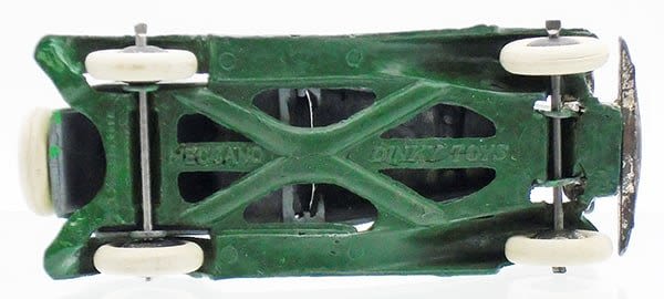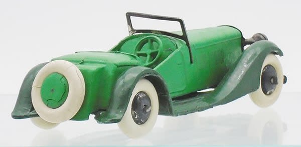 2-tone green, open chassis & windscreen, white rubber tires, metal hubs, ca 1940s, C7.