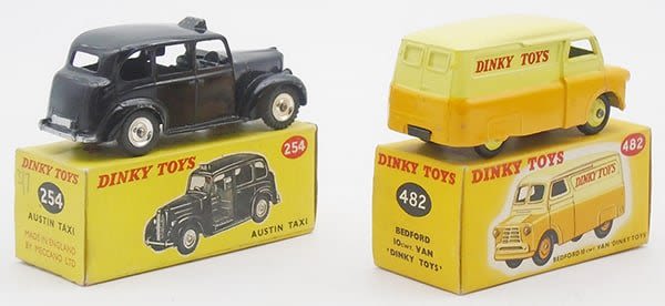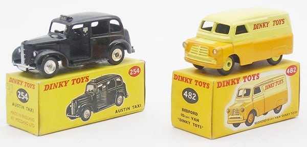 254 Austin Taxi, black, 482 Dinky Toys Bedford Van, orange & yellow, orig boxes minor wear, C8.