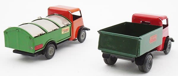 handpainted tin, 32M Dust Cart, red, black & green, 86M Tip Lorry, red, black & green, decal wear on 1 side, both are friction working, C7-8.