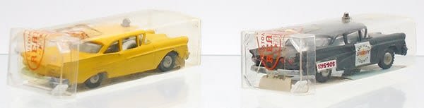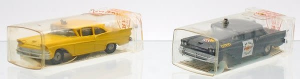 die cast, 554 1958 Ford Taxi, yellow, 3 3/8 in, w/club paper, orig box minor wear, 555 1958 Ford Police Car, black, 3 3/8, w/club paper & partial decal sheet, orig box has hole from siren light, C8.