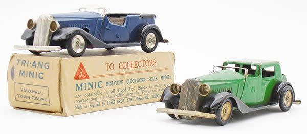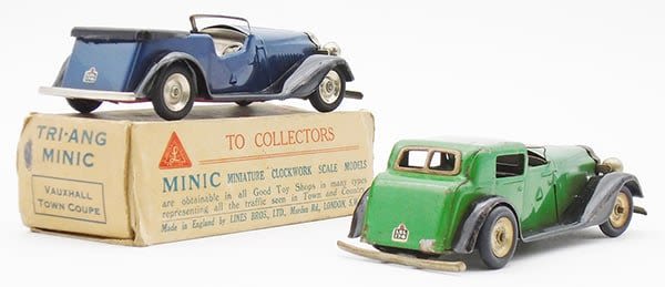 handpainted tin, windup working, 17M Tourer, blue, 18M Town Coupe, green, paint wear, w/rough orig box, C5-7.