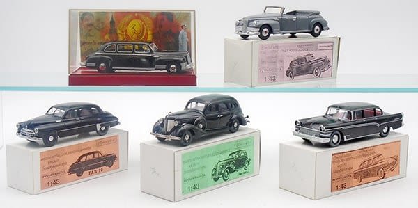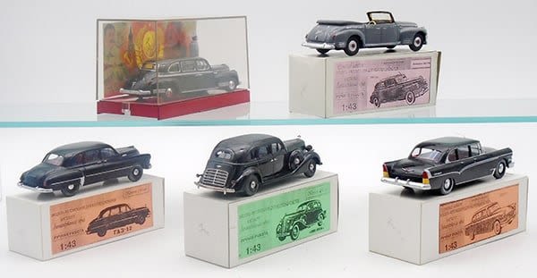1:43 scale, 4 plastic, 1 die cast, convertible vehicle has cracked windshield frame, orig boxes minor wear, C6-8.