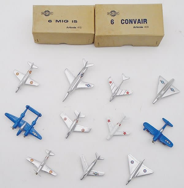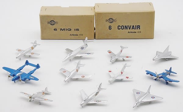 die cast, 412 6 MIG 15 trade box w/insert, 1 MIG 15 only, 413 6 Convair trade box w/insert, 1 Convair only, 403 Fiat G80, 405 Lockheed F90, 420 MIG 19, 425 Lightning P38, 408 Mystere, 423 Corsair, 401 Fiat G59, 410 Sabre F35, 406 Avro 707A, all props & decals intact, 2 – 3 1/4 in wingspans, C7-9.