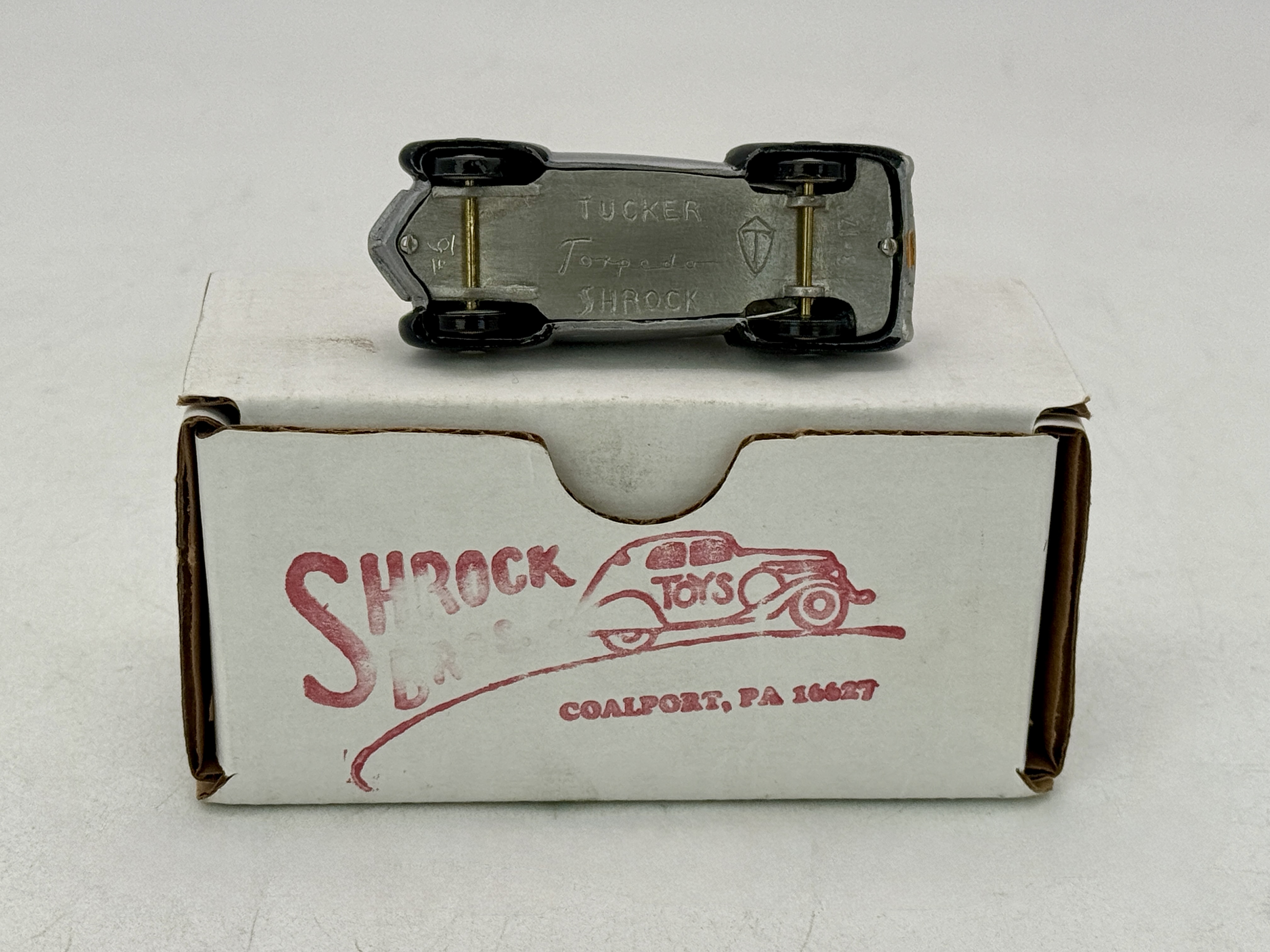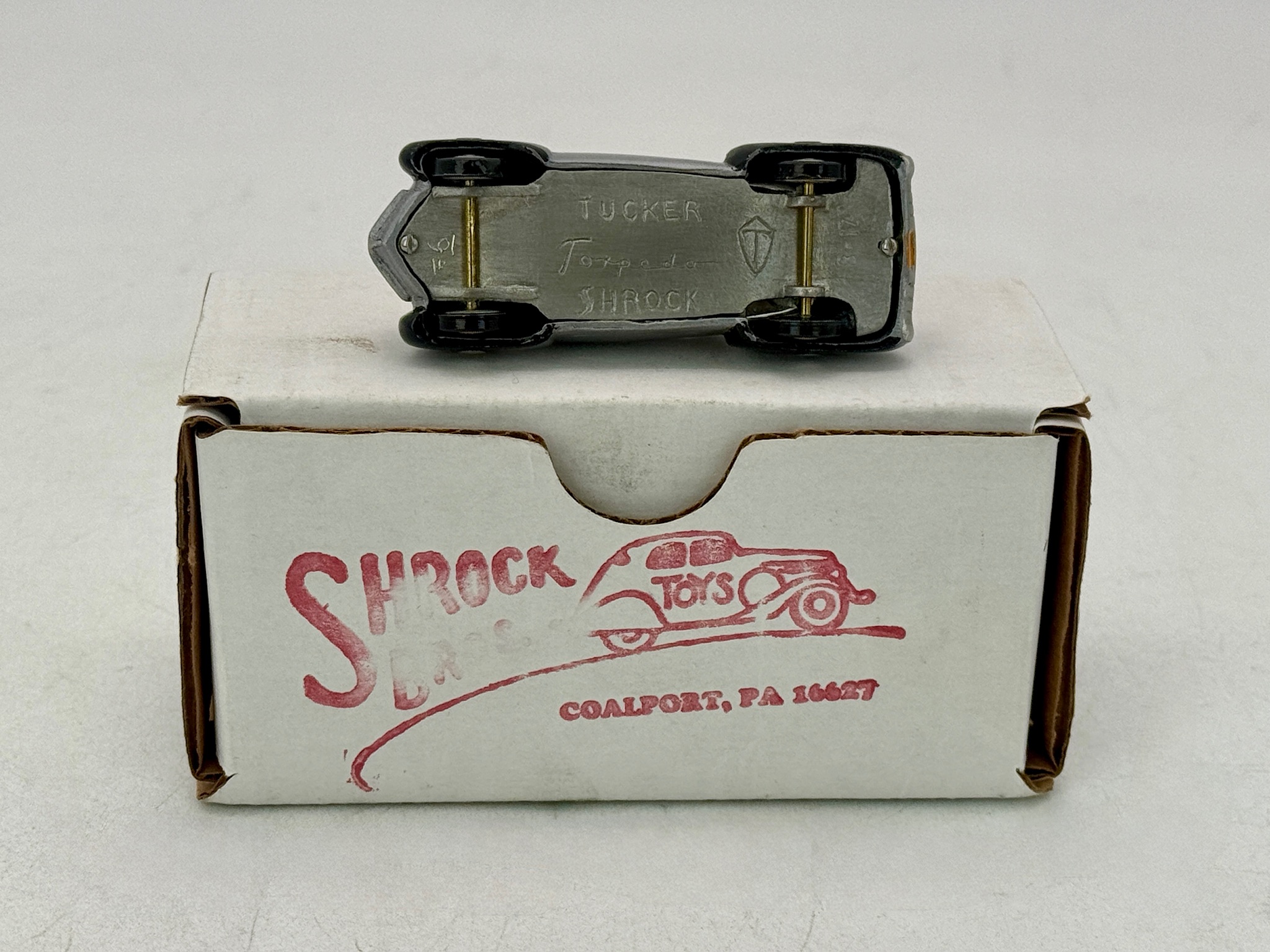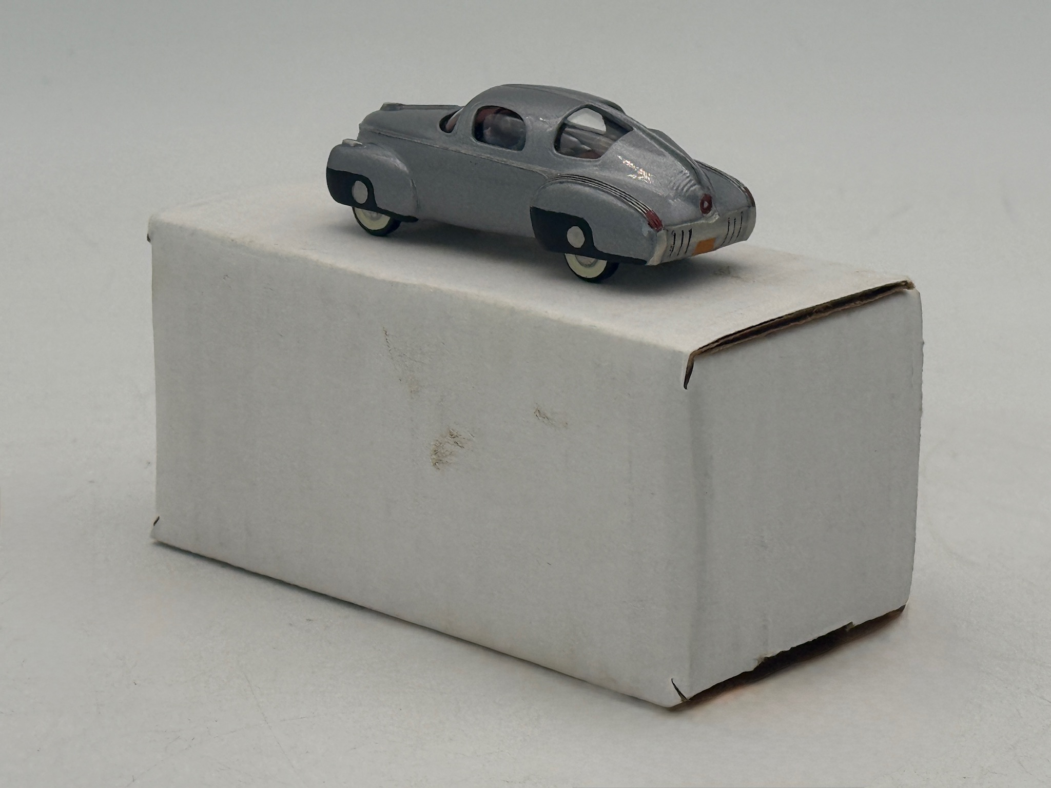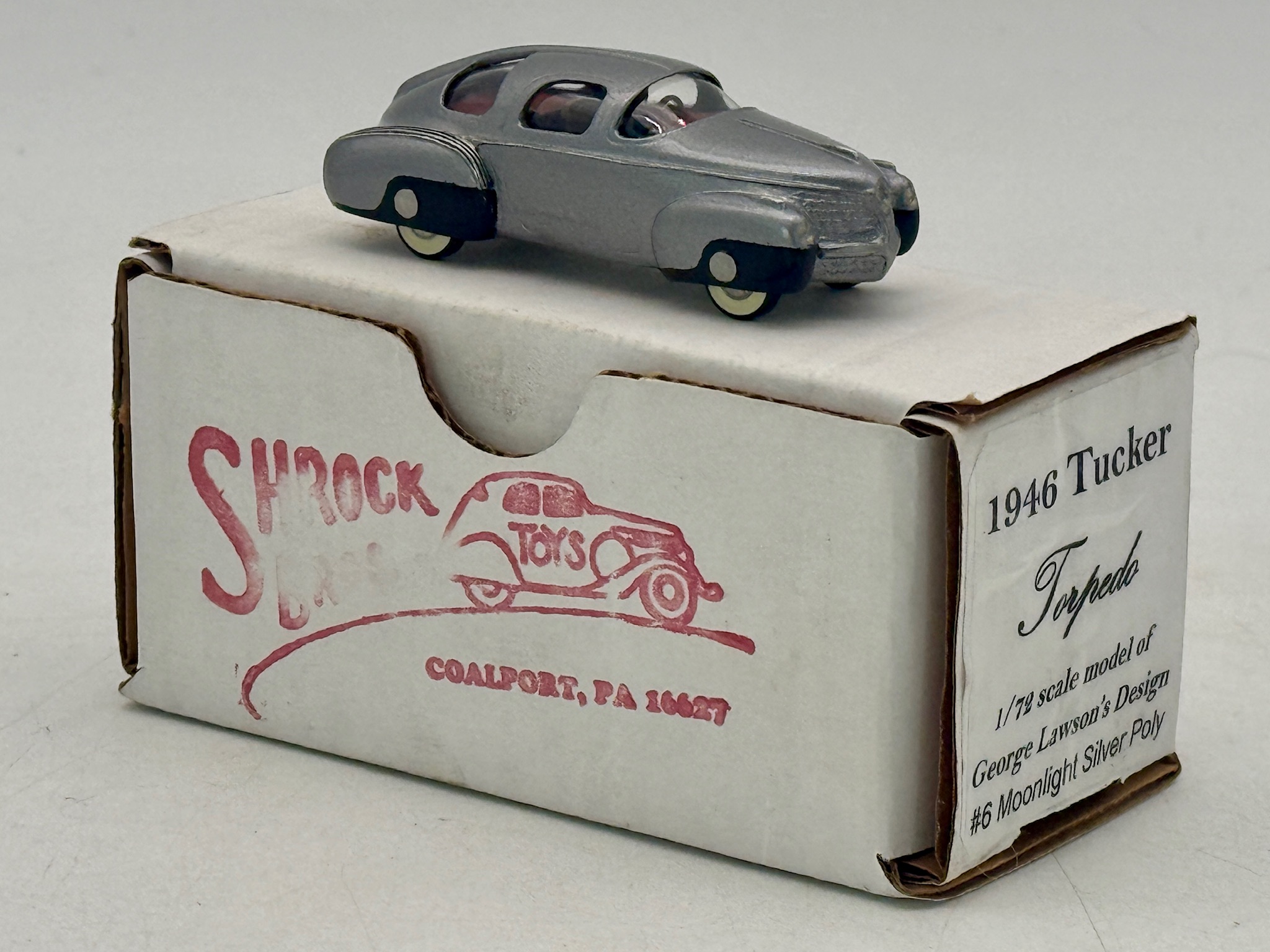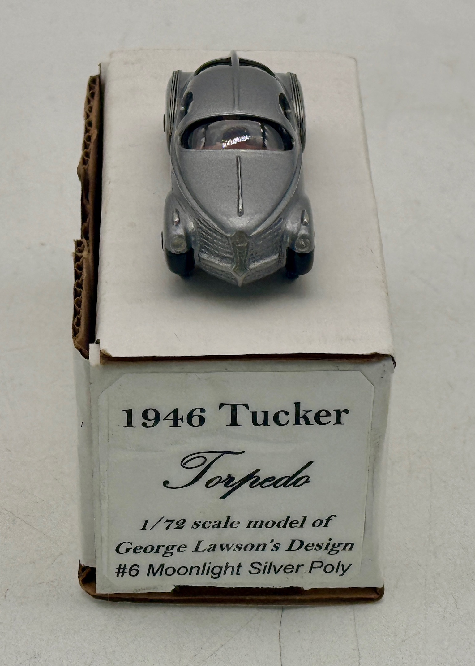 A silver 1/72 scale model of a 1946 Tucker Torpedo based on George Lawson’s design, finished in Moonlight Silver Poly and presented in its original Shrock Toys box. C9