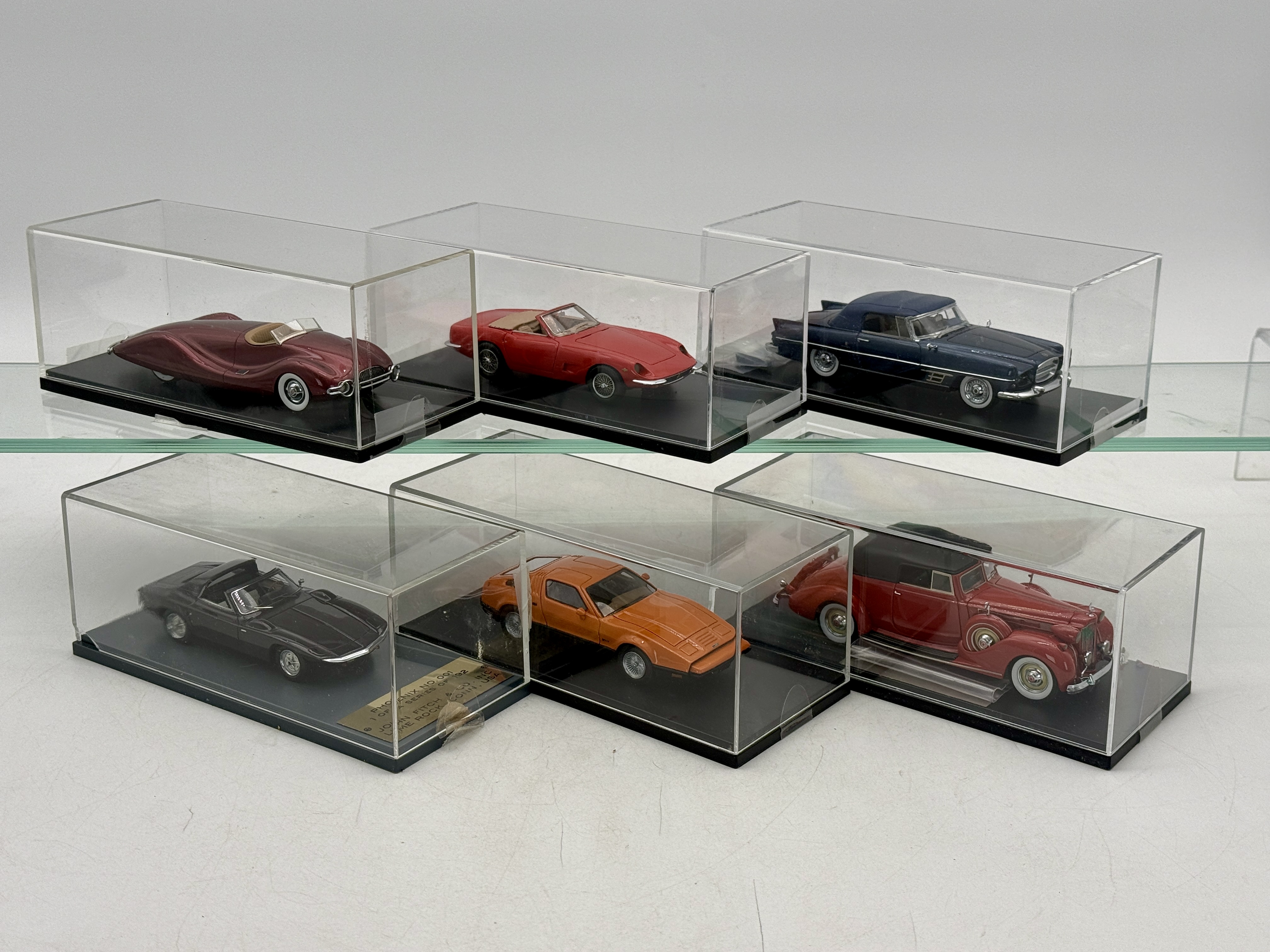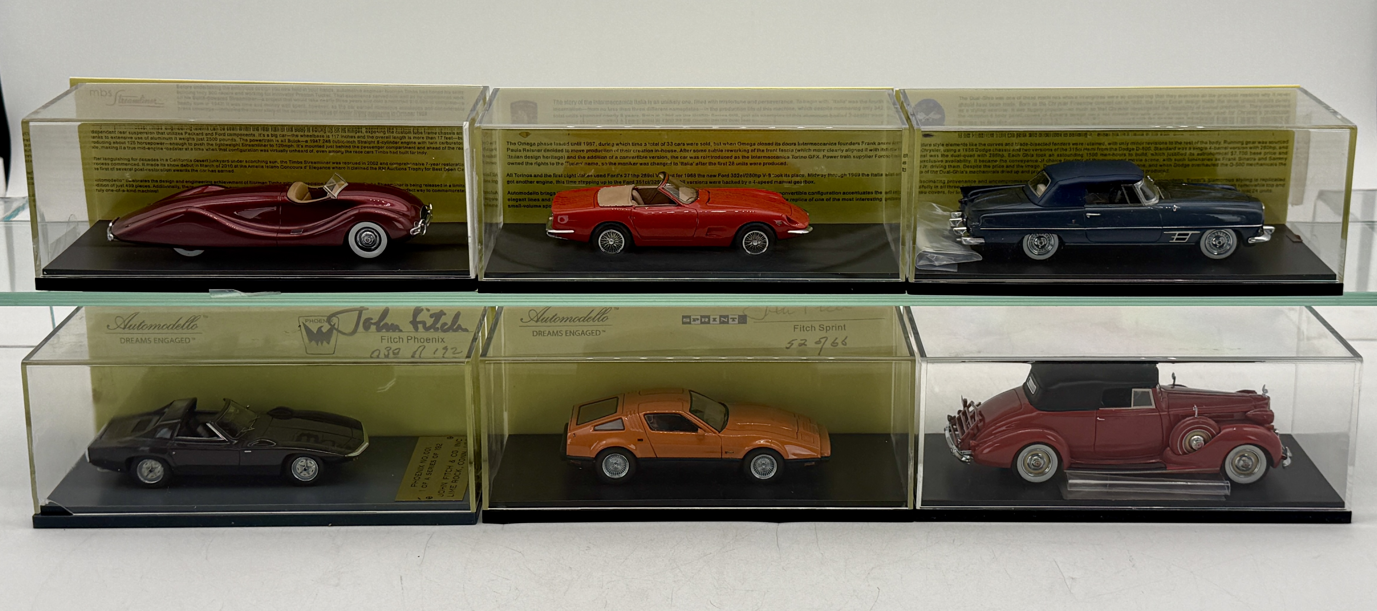 6 Automodello Dreams Engaged 1:43 scale model cars in individual acrylic display cases, featuring a 1948 Norman E. Timbs Streamliner, Intermeccanica Italia, Dual-Ghia, Fitch Phoenix with John Fitch signature, Bricklin SV1, and a 1938 Packard Twelve. with 5 box inserts plastic OB’s mw C8-9