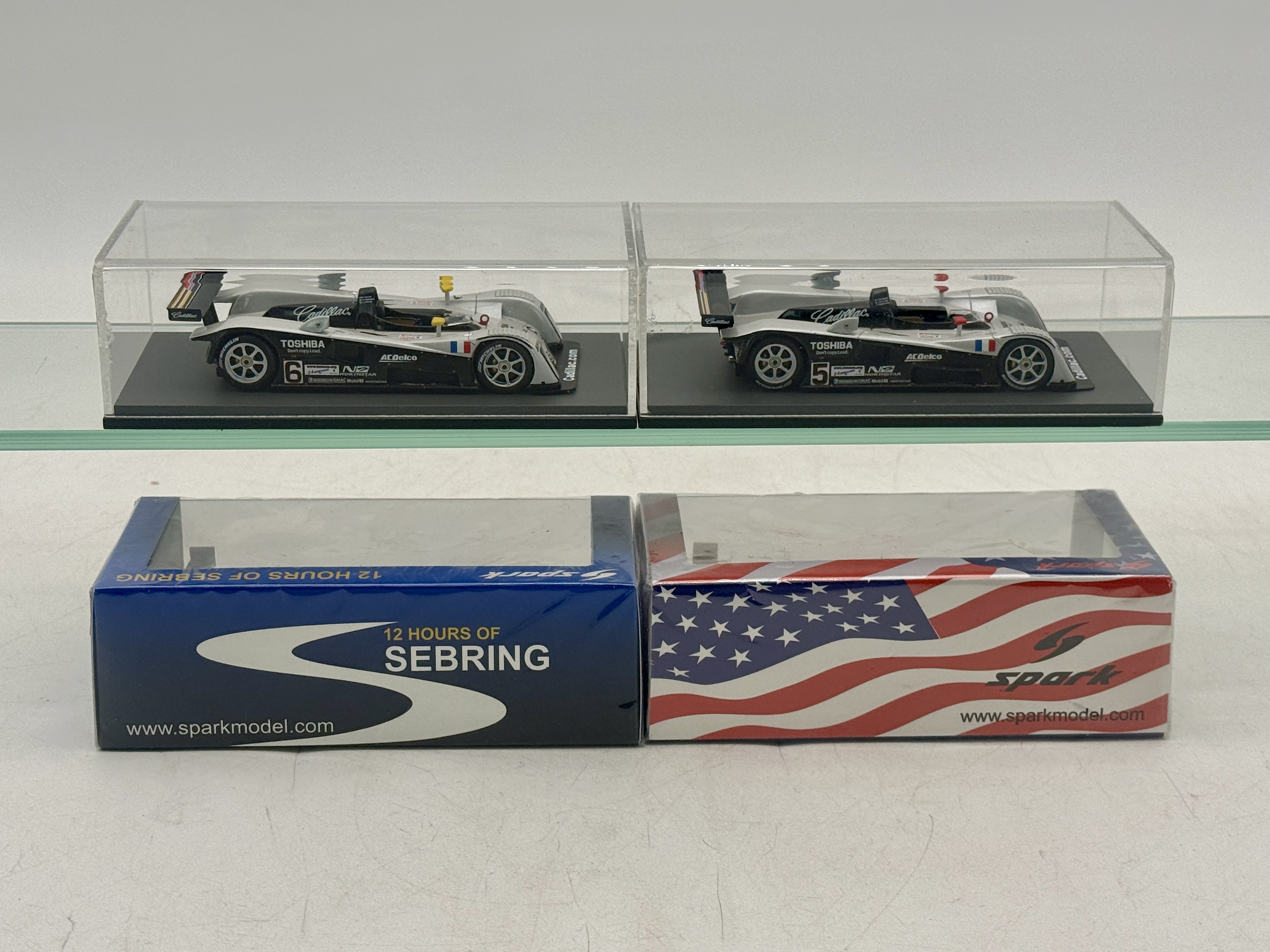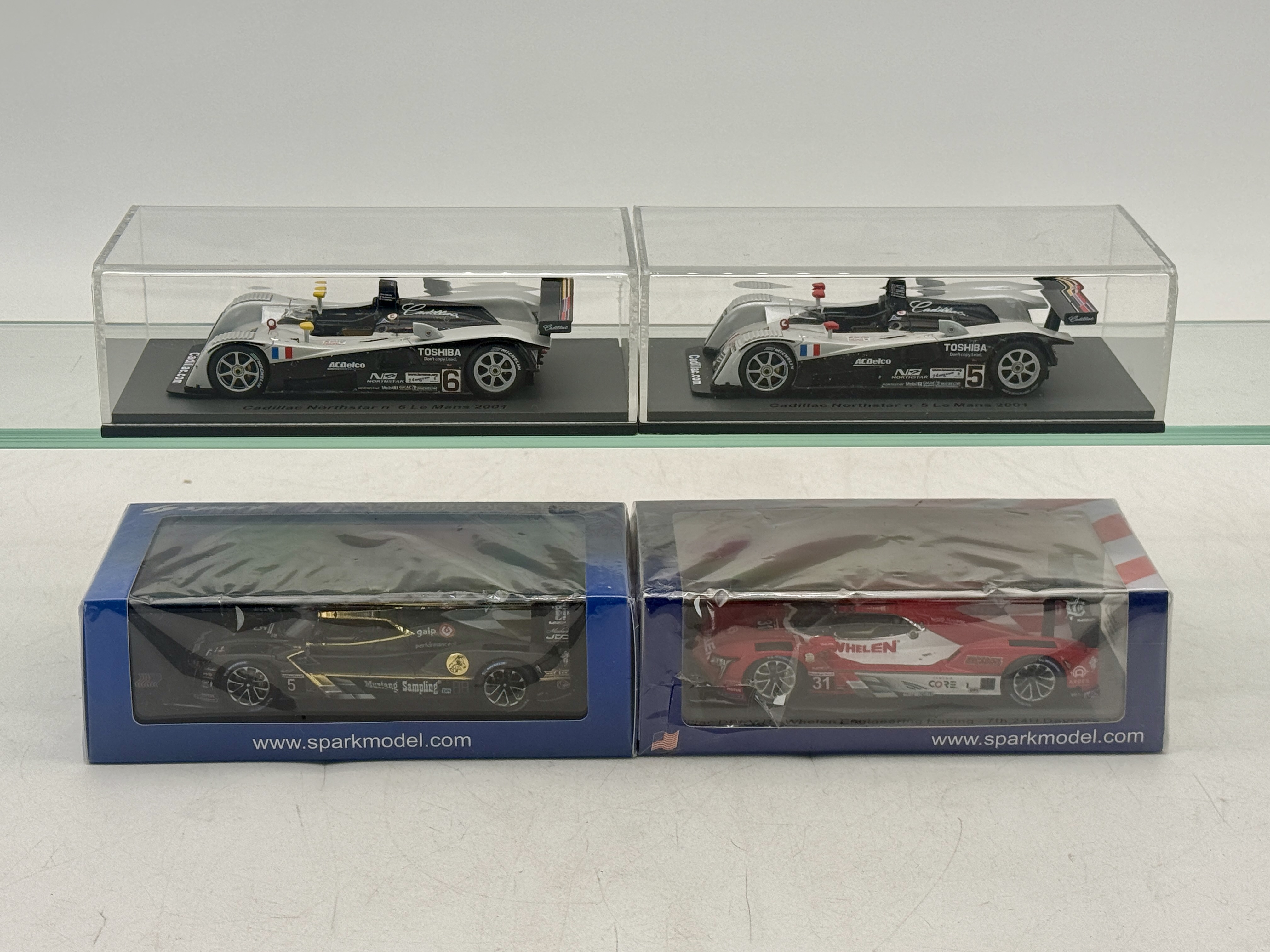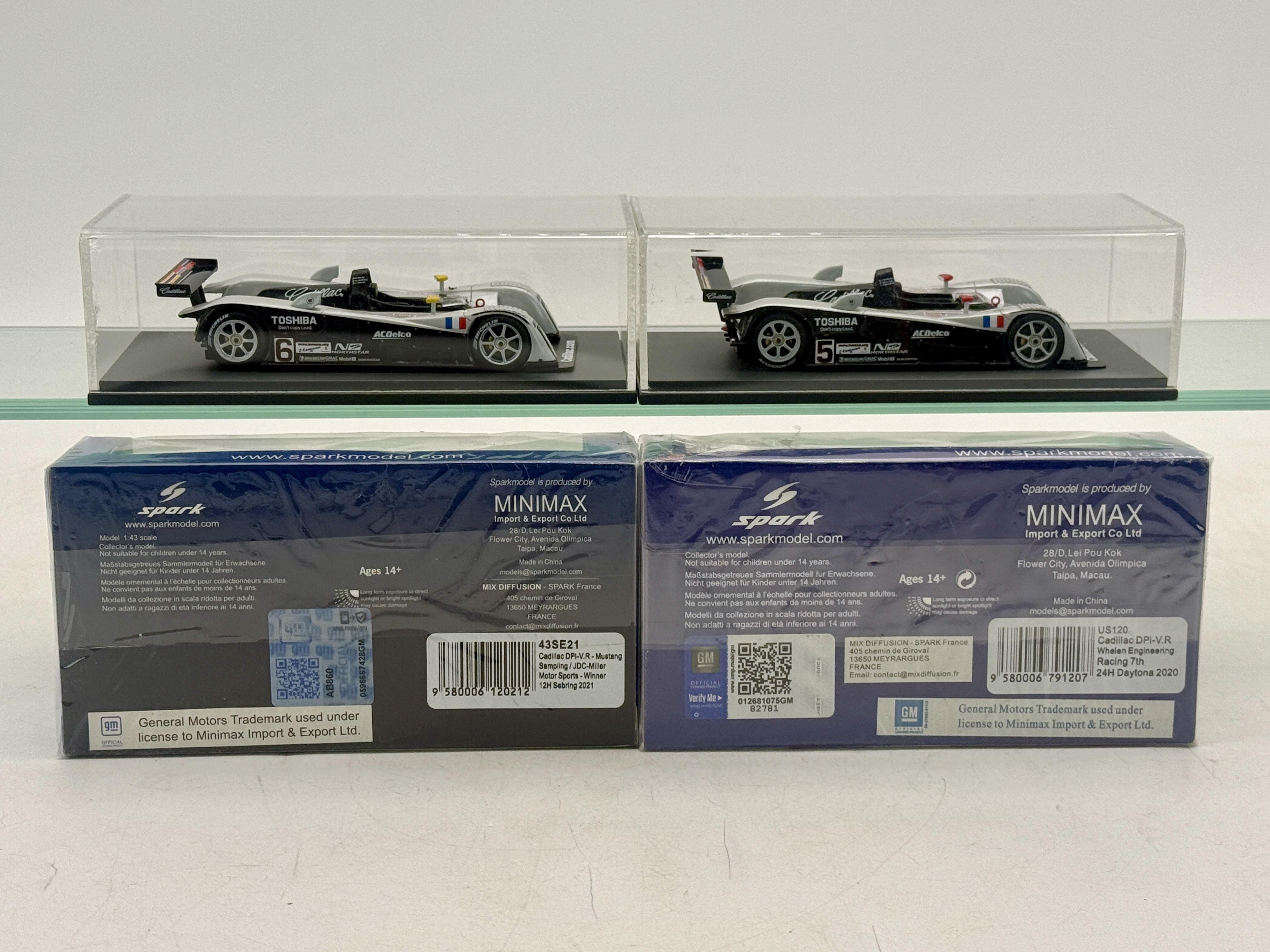 4 Spark 1:43 scale model race cars including 2 Cadillac Northstar Lemans and DPi-V.R models in silver, black, and red, Mustang Sampling, and Whelen Engineering branding. US 120 Daytona 2020 sealed OB’s C9-10