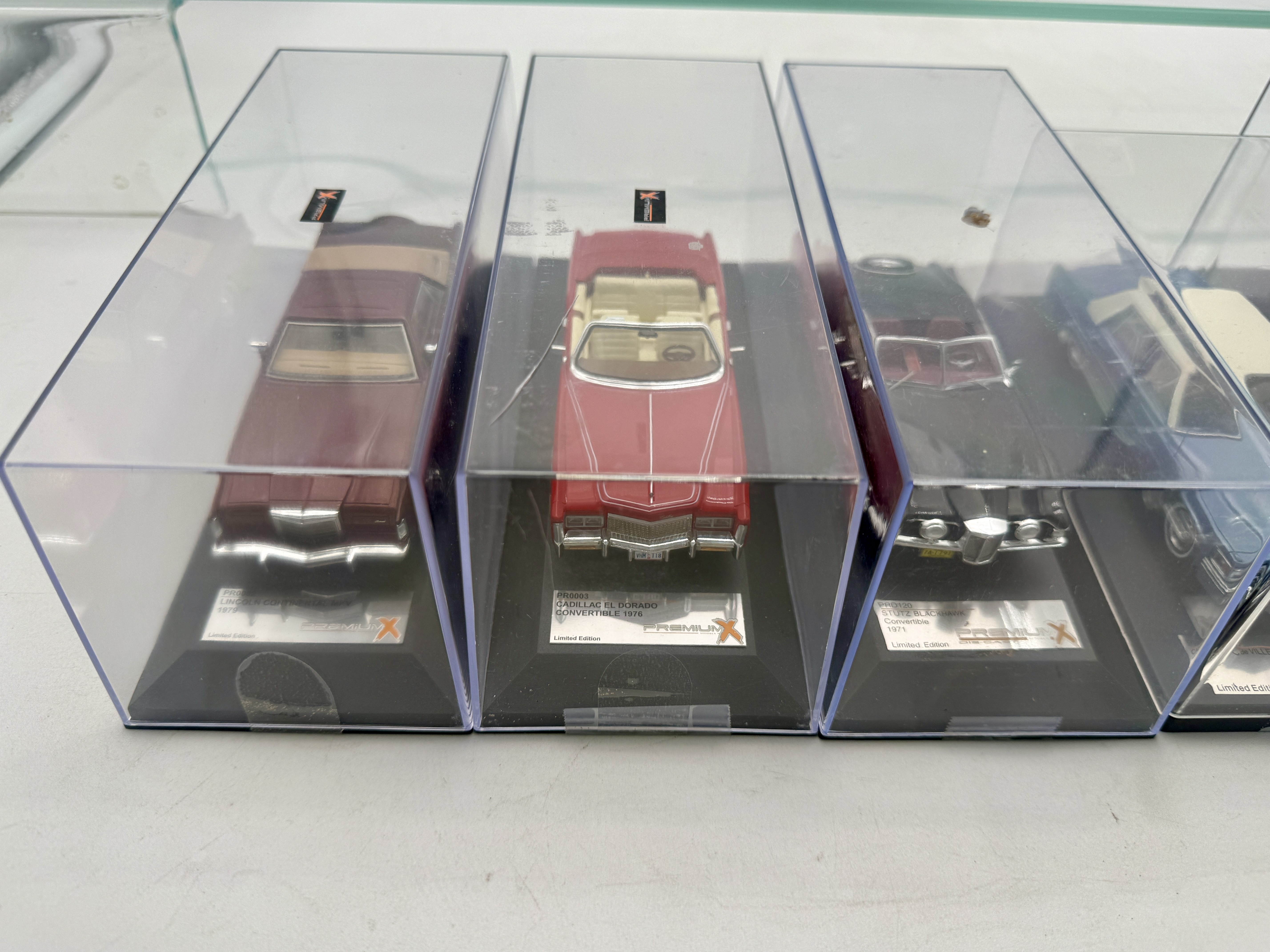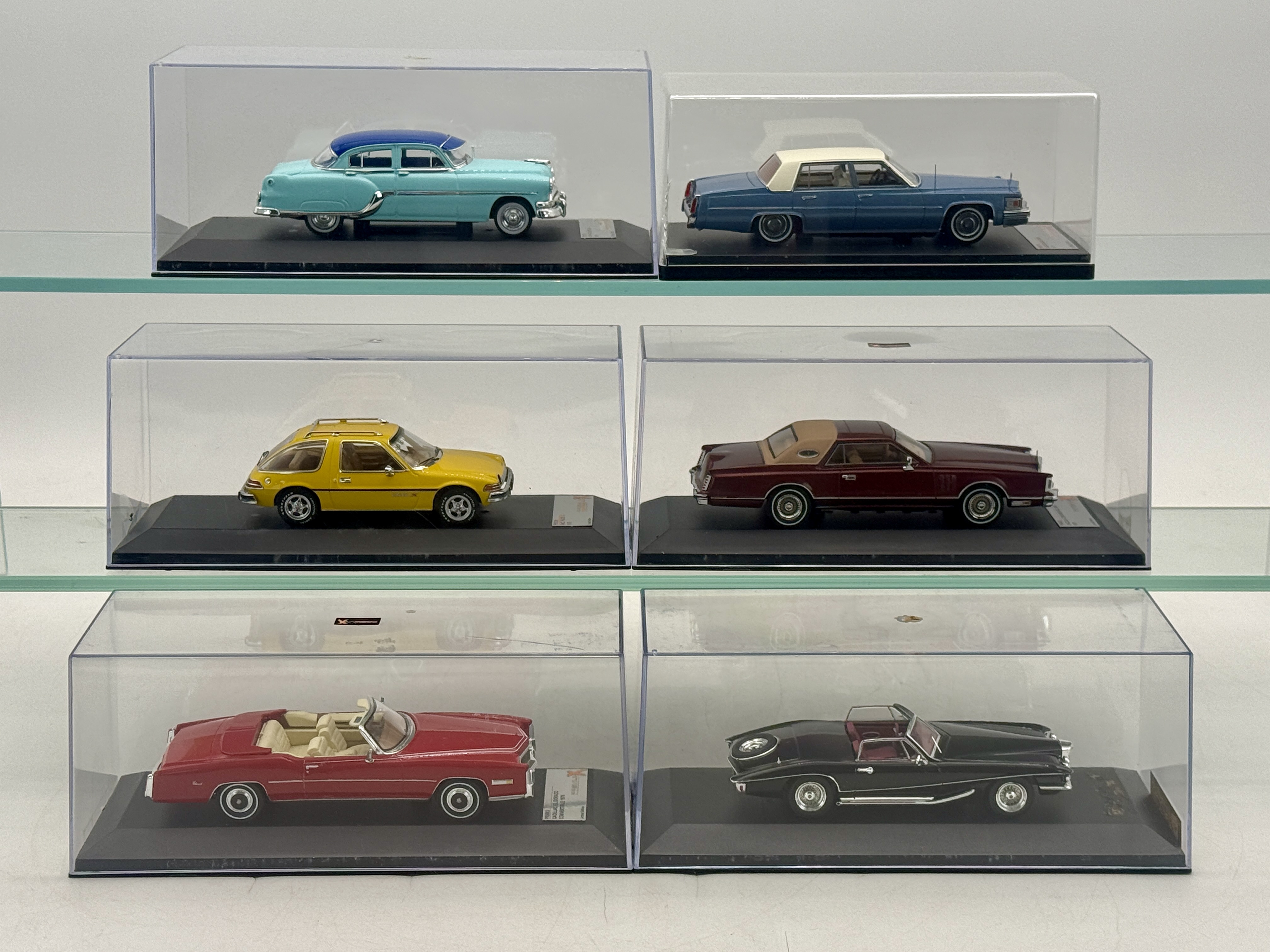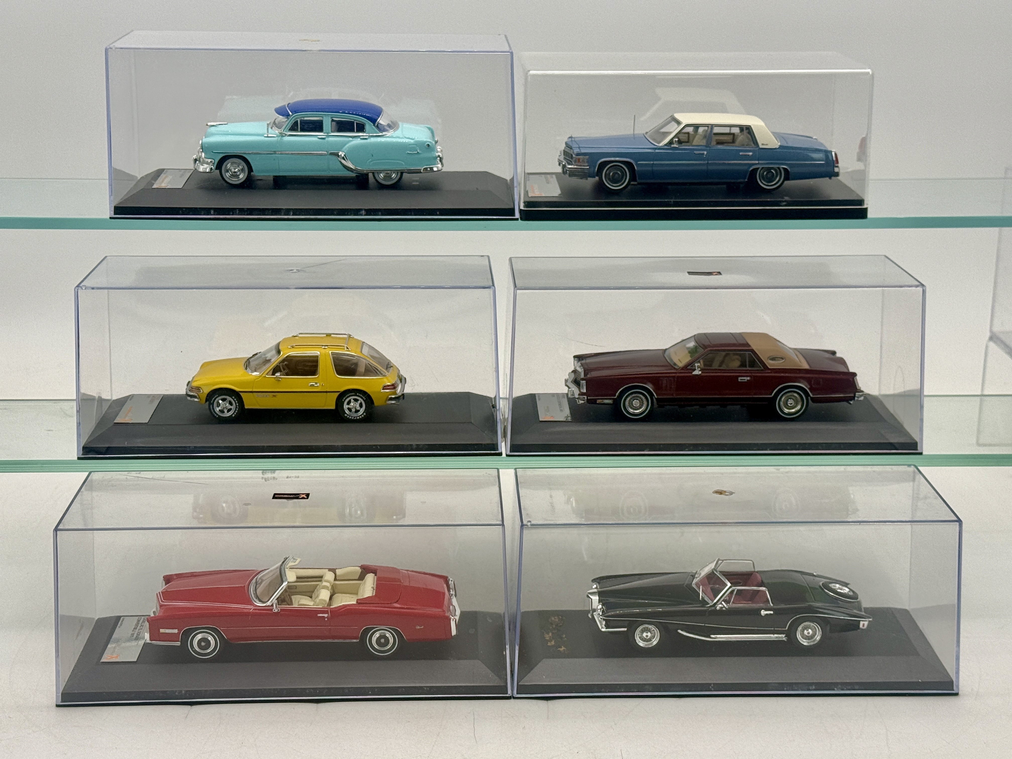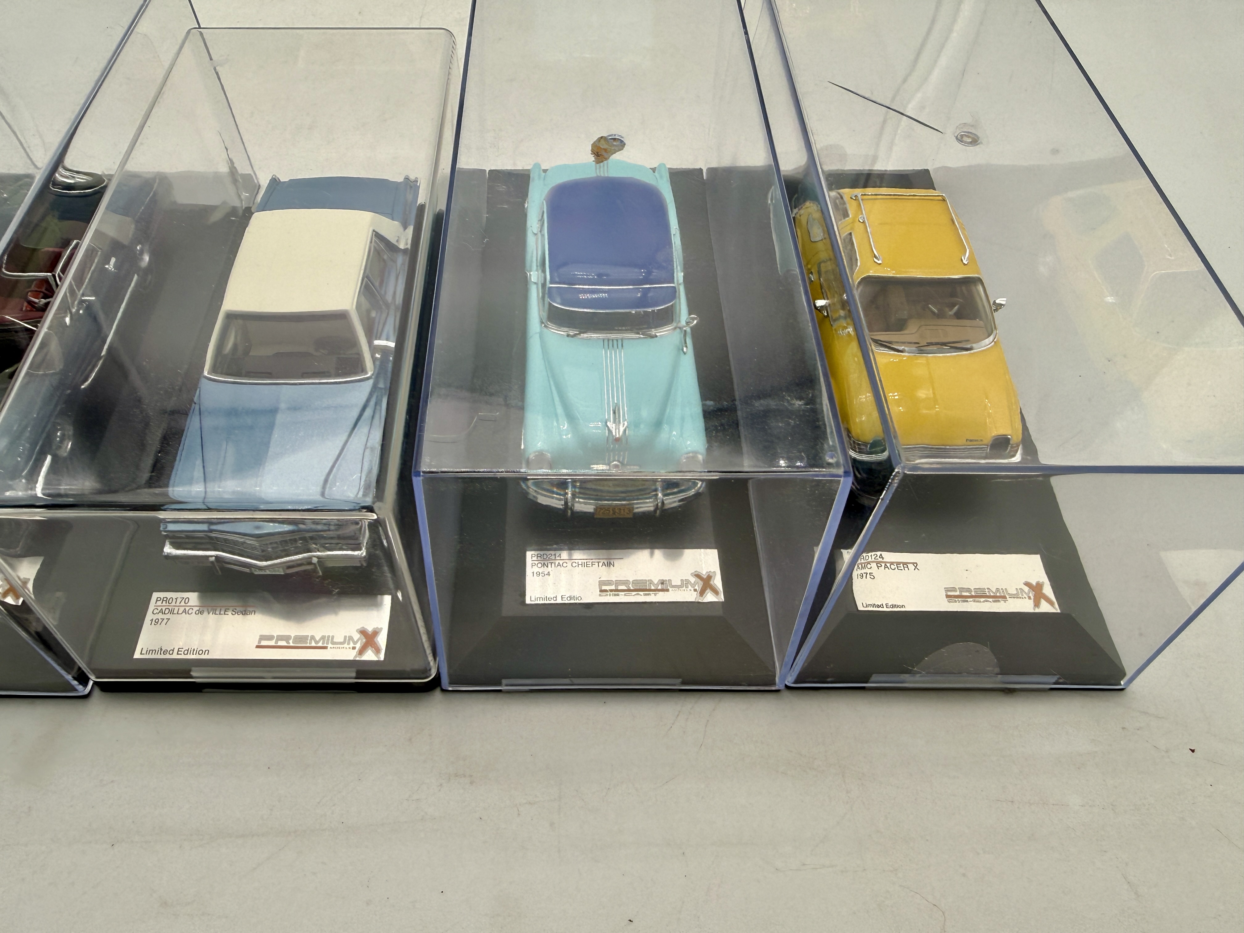 Several Premium X limited edition resin model cars including a 1954 Pontiac Chieftain, 1977 Cadillac de Ville Sedan, 1975 AMC Pacer X, 1979 Lincoln Continental Mk V, 1976 Cadillac Eldorado Convertible, and 1971 Stutz Blackhawk Convertible, each housed in a clear display case. Plastic OB’s only C8-9