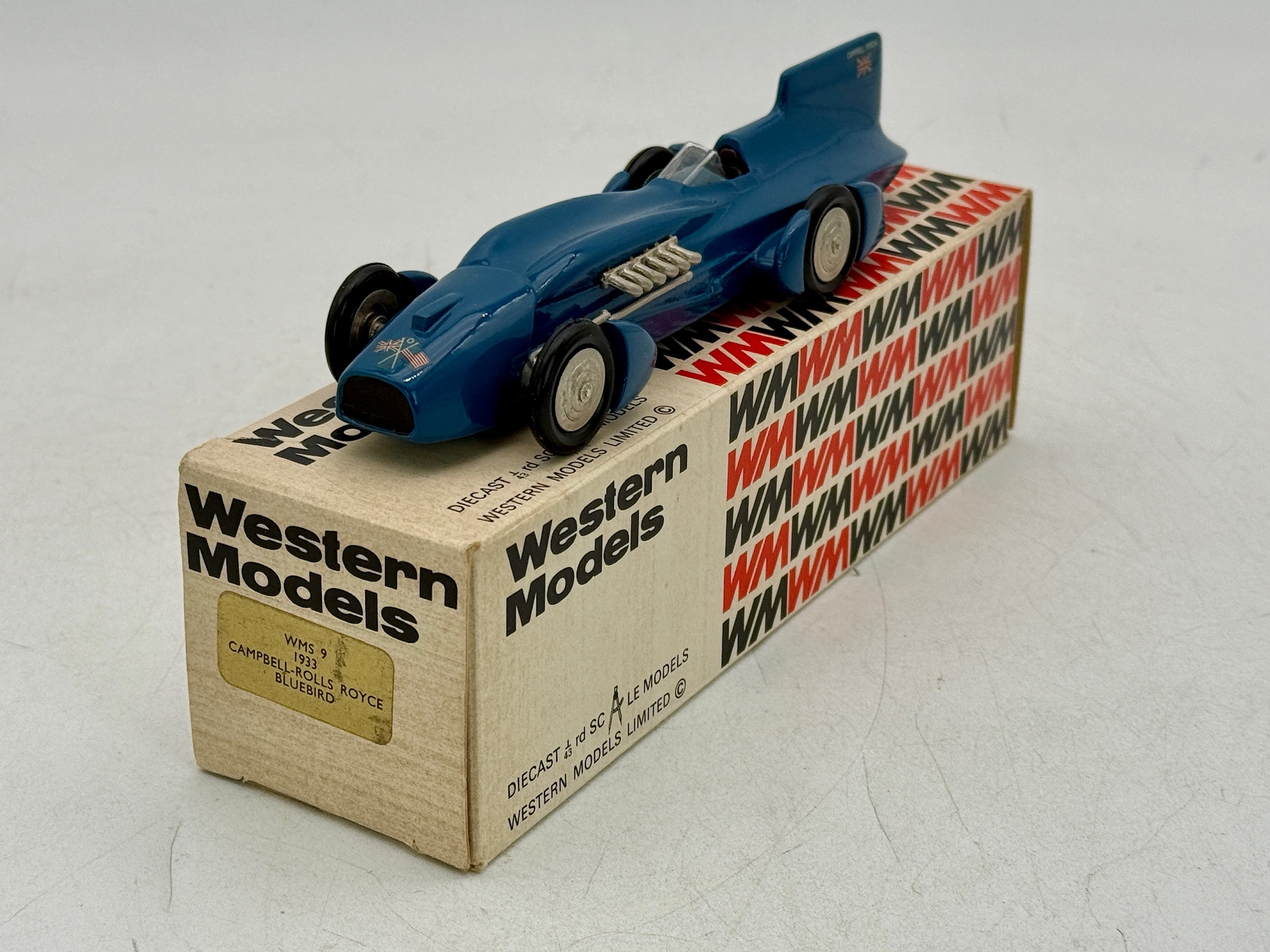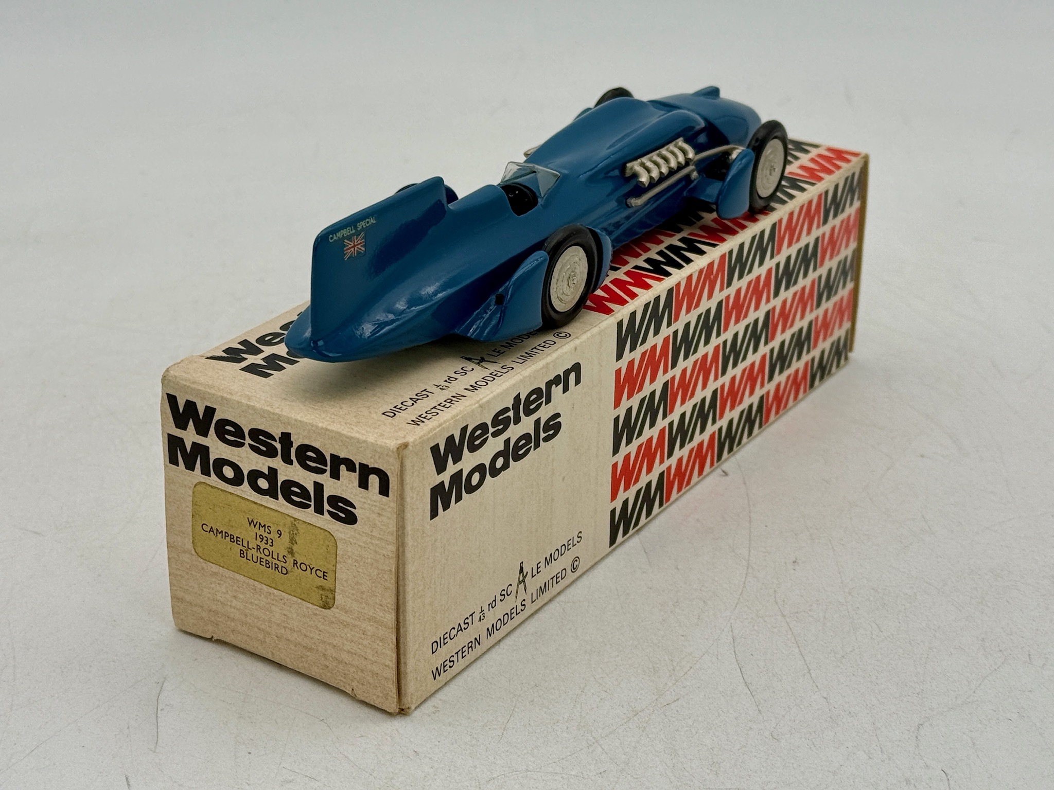 A White metal blue 1/43rd scale diecast model of the 1933 Campbell-Rolls Royce Bluebird, reference WMS 9, presented in its original Western Models Limited box. Blue OB and inserts C9.