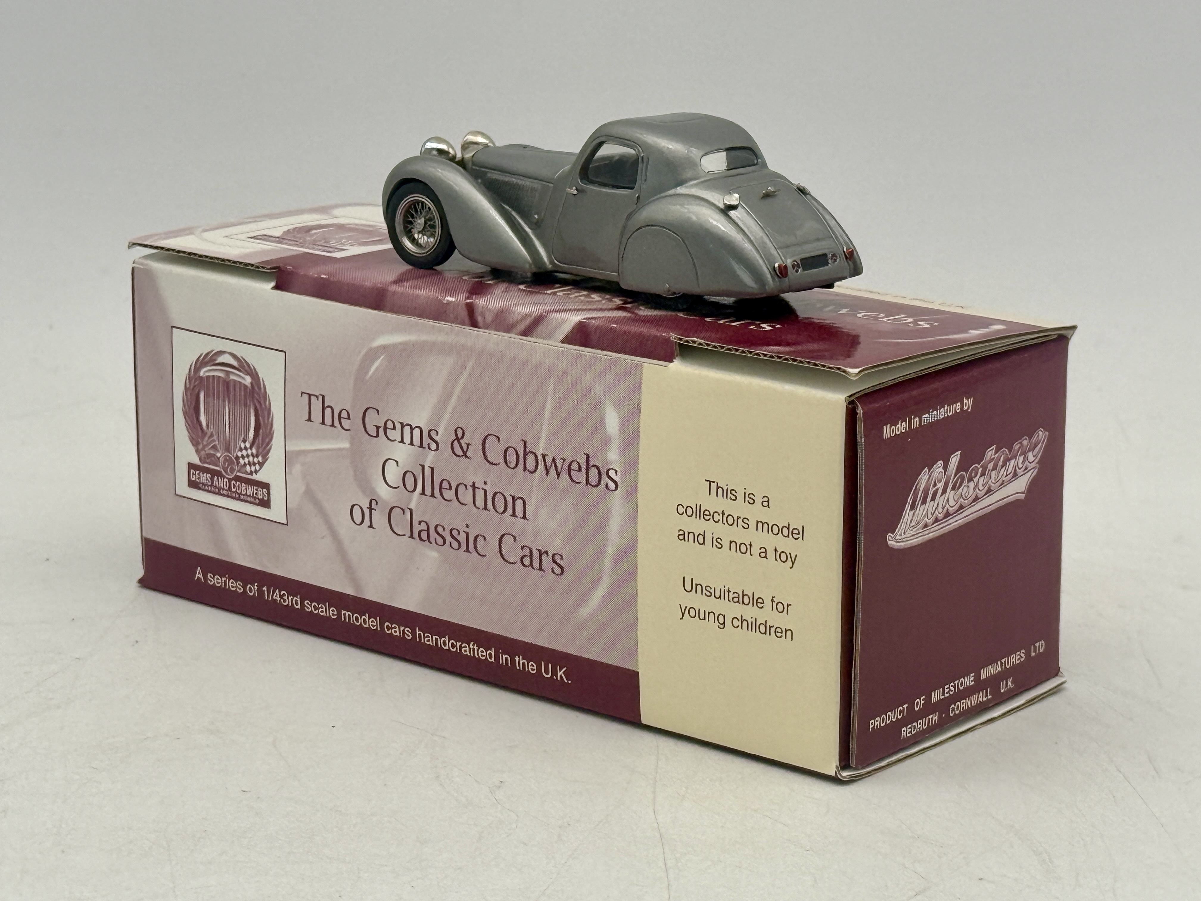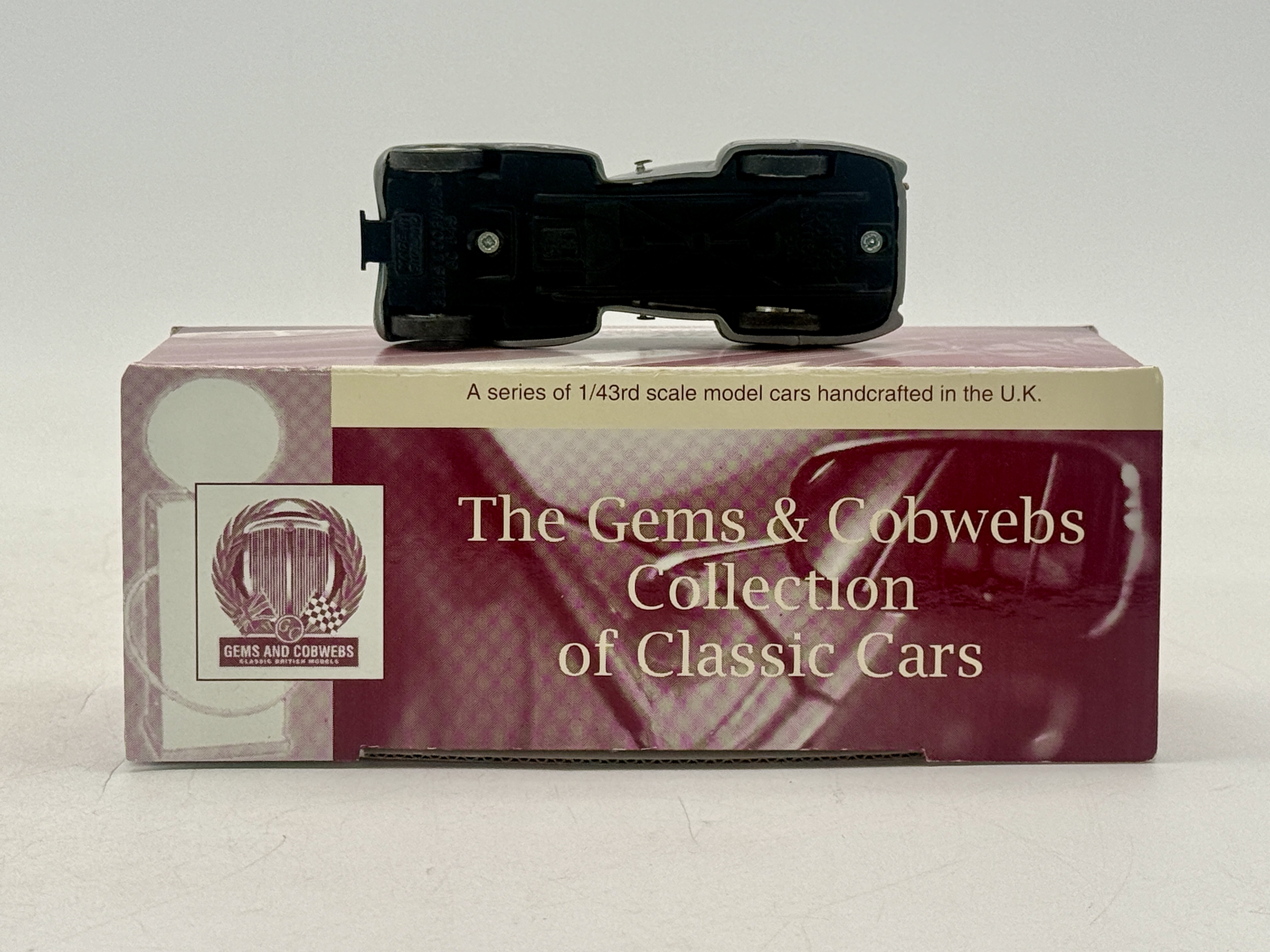 A silver white metal, 1/43rd scale Milestone Miniatures model of a 1938 Jaguar SS 100 Coupe from The Gems and Cobwebs Collection, complete with its original GC 34S box. OB C9