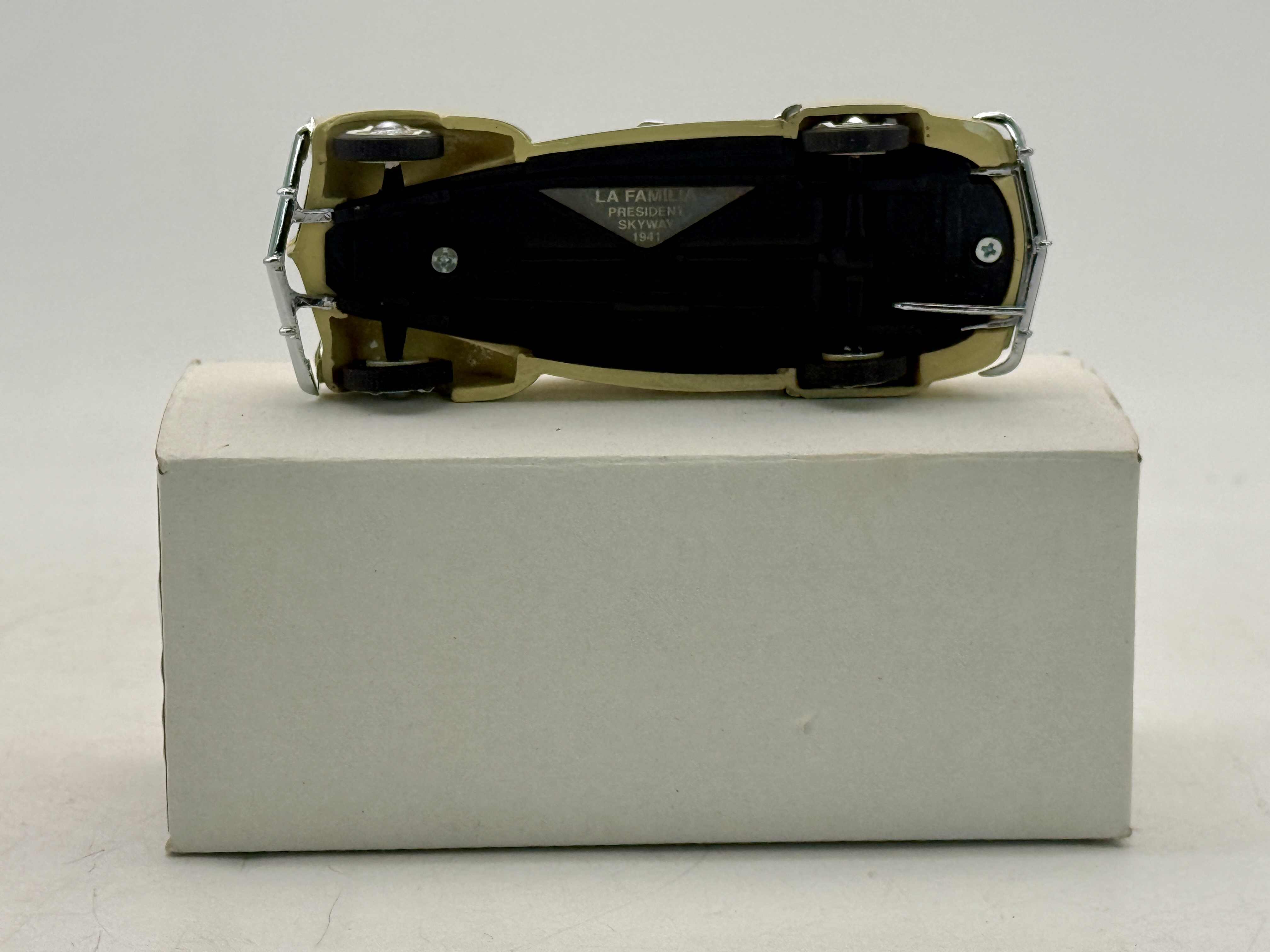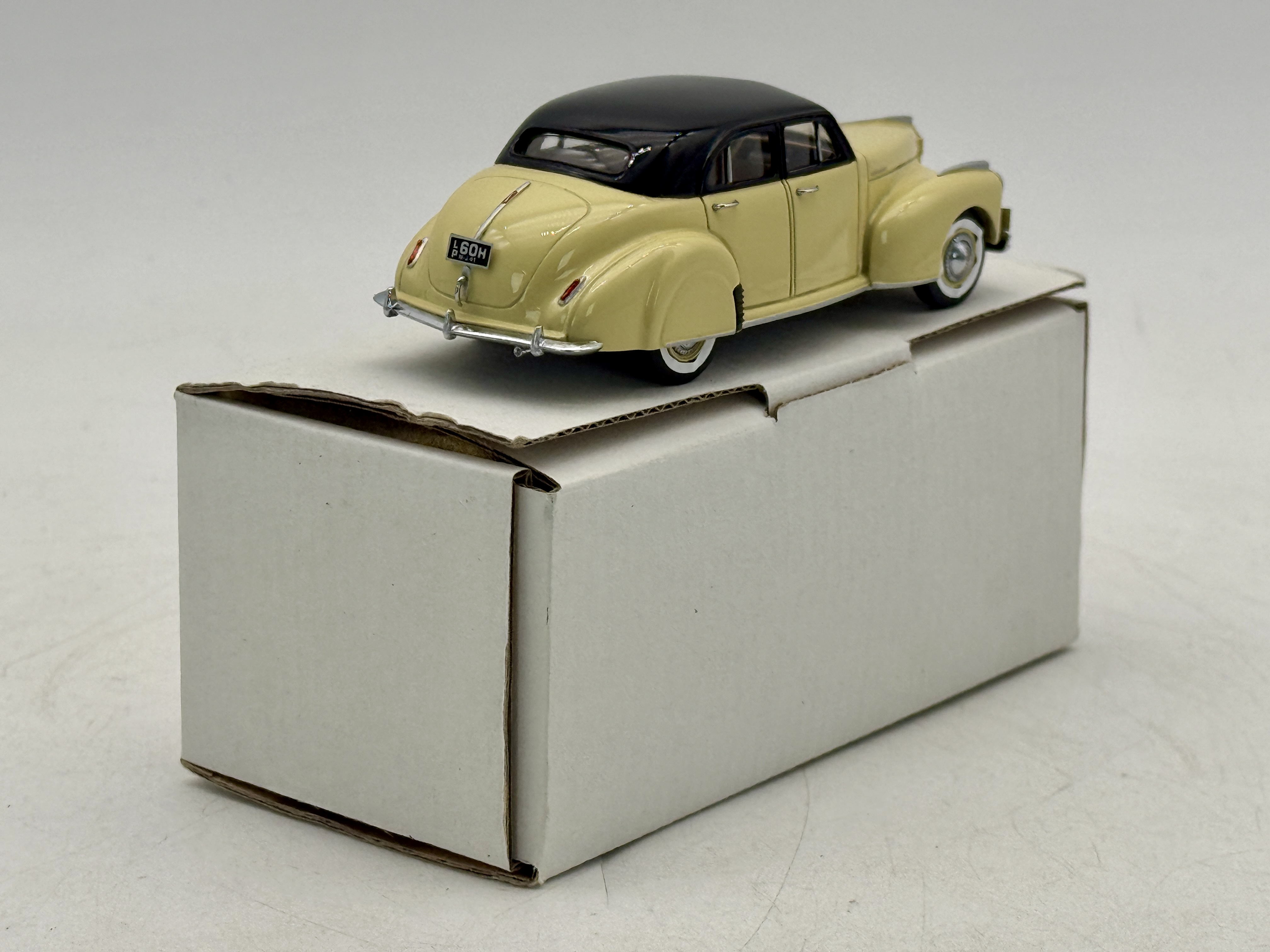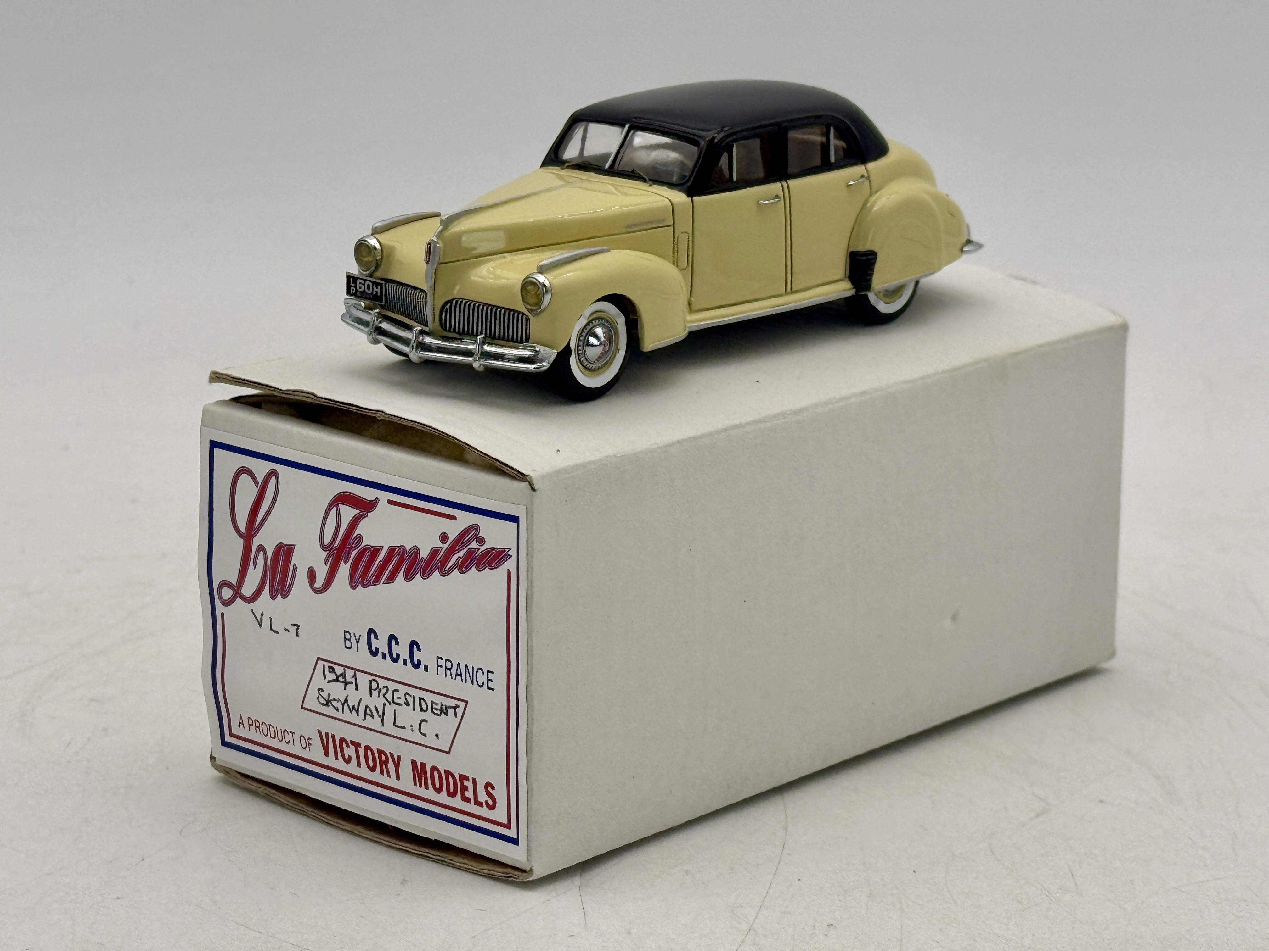 A cream and black 1941 Studebaker President Skyway model car featuring a black roof, original Victory Models box, and La Familia chassis markings. OB C9