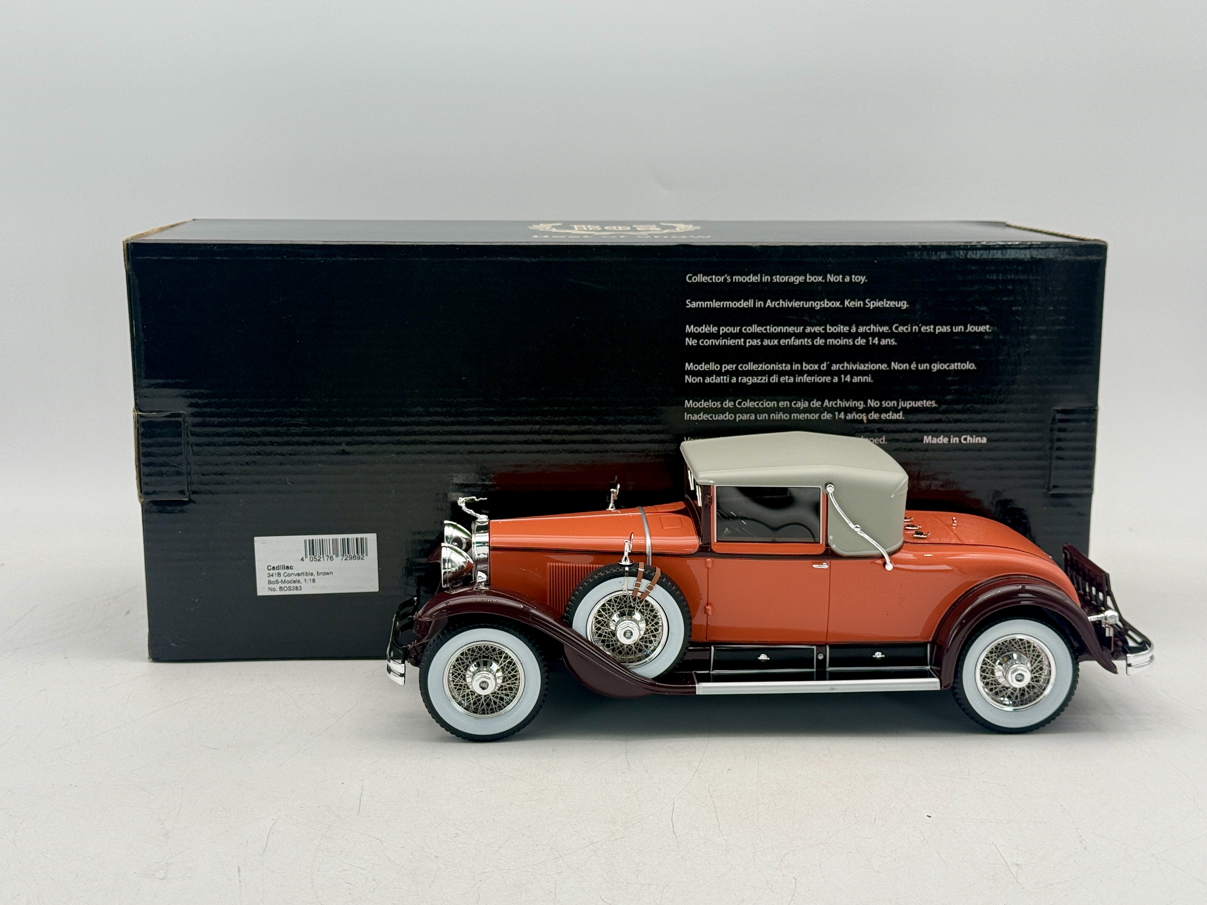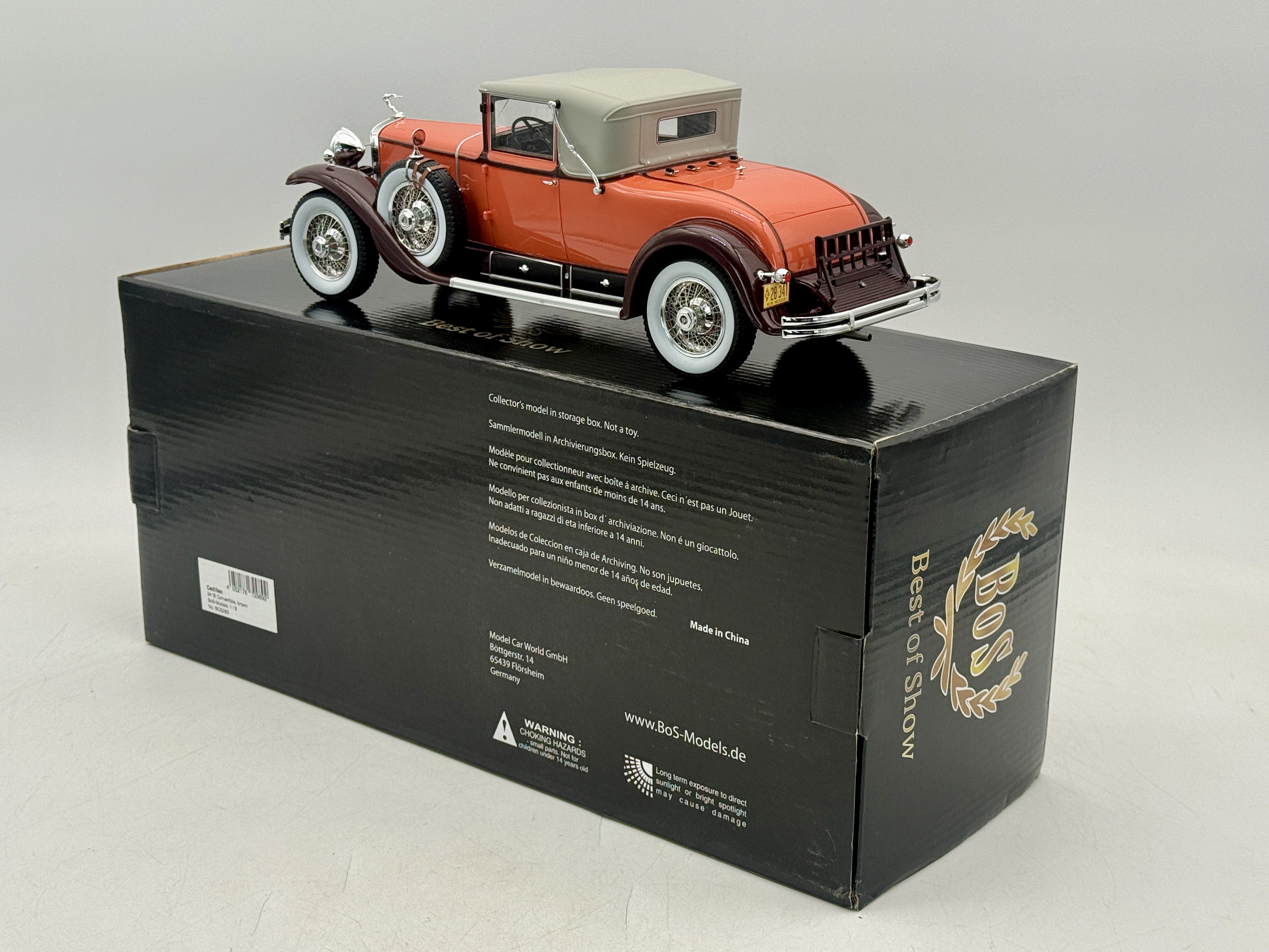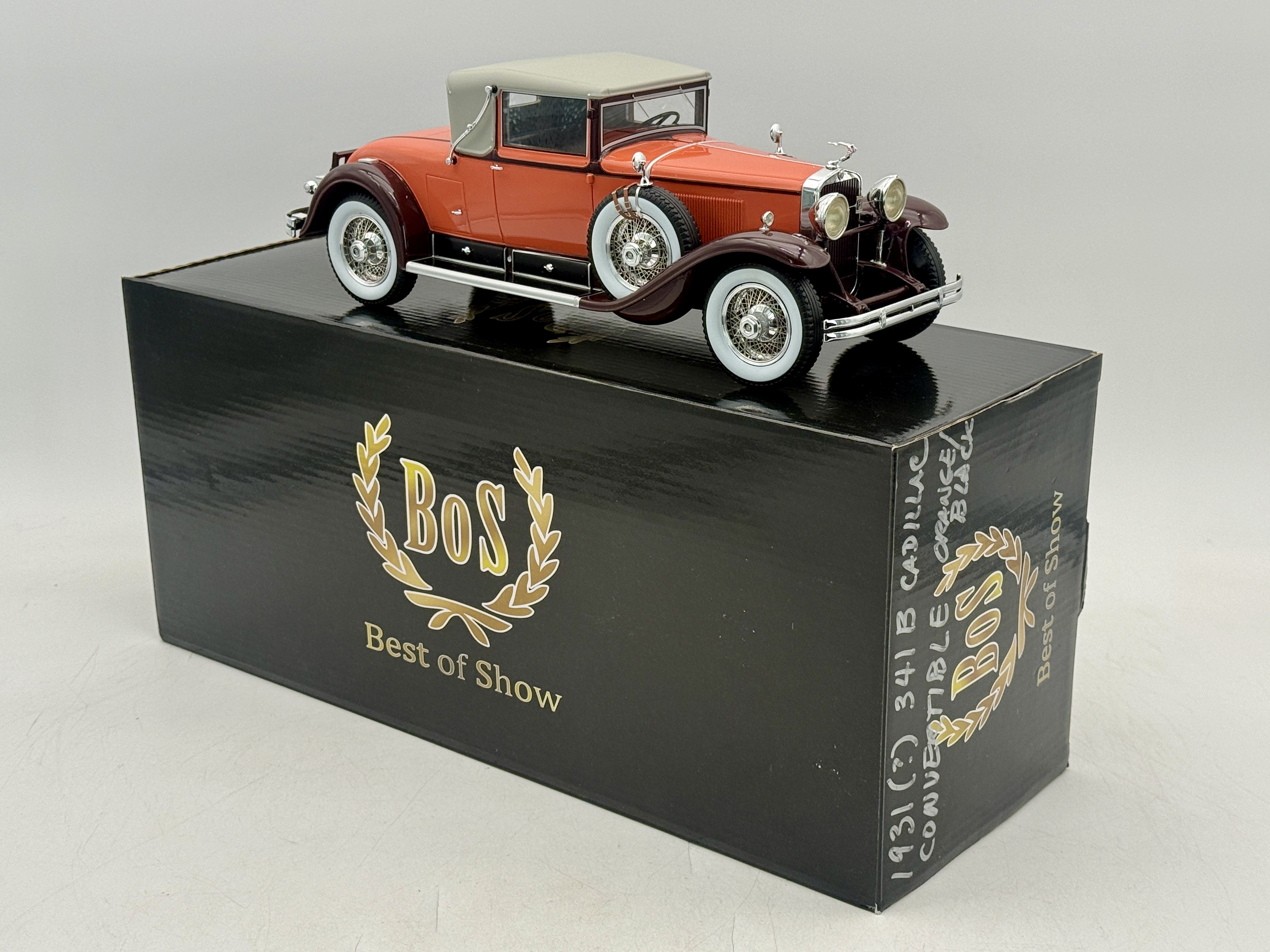A 1:18 scale, resin, BoS-Models 1931 Cadillac 341B Convertible model car finished in orange and dark burgundy, accompanied by its original Best of Show storage box marked No. BOS283. #393 of 501 OB MW C9