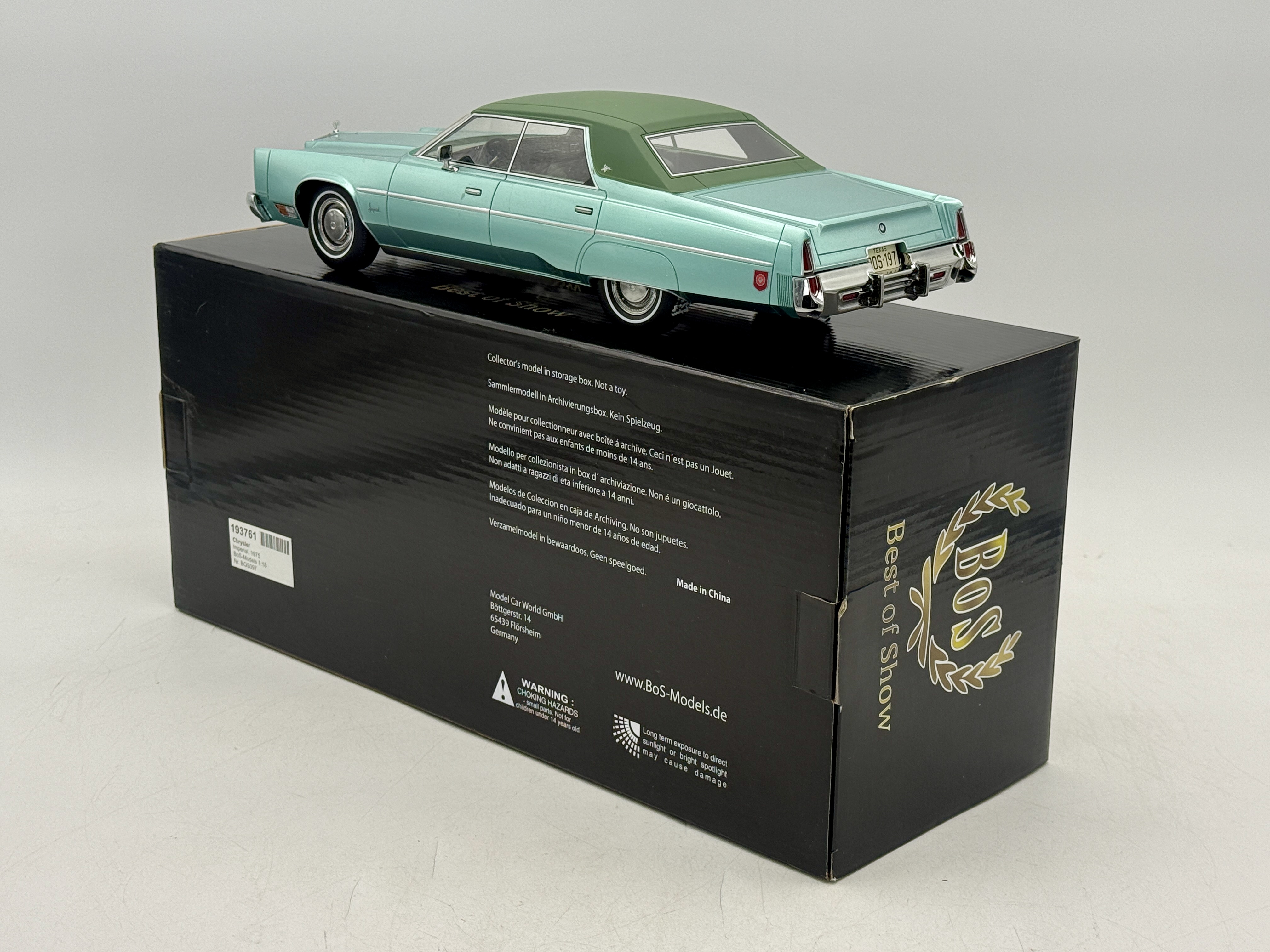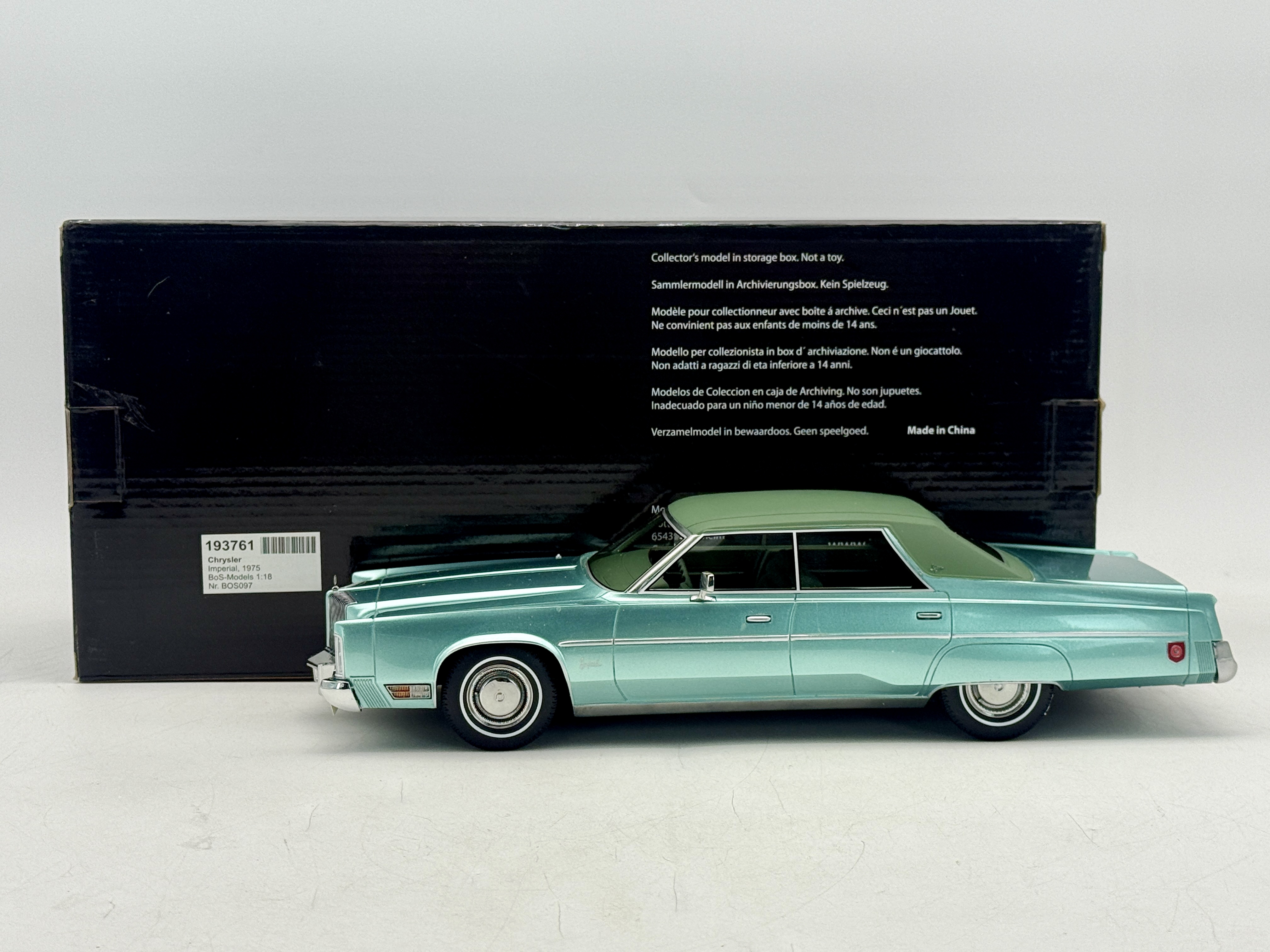 A 1:18 scale resin metallic light green and dark green 1975 Chrysler Imperial model car by BoS-Models with its original box. #71 of 1000, OB mw C9