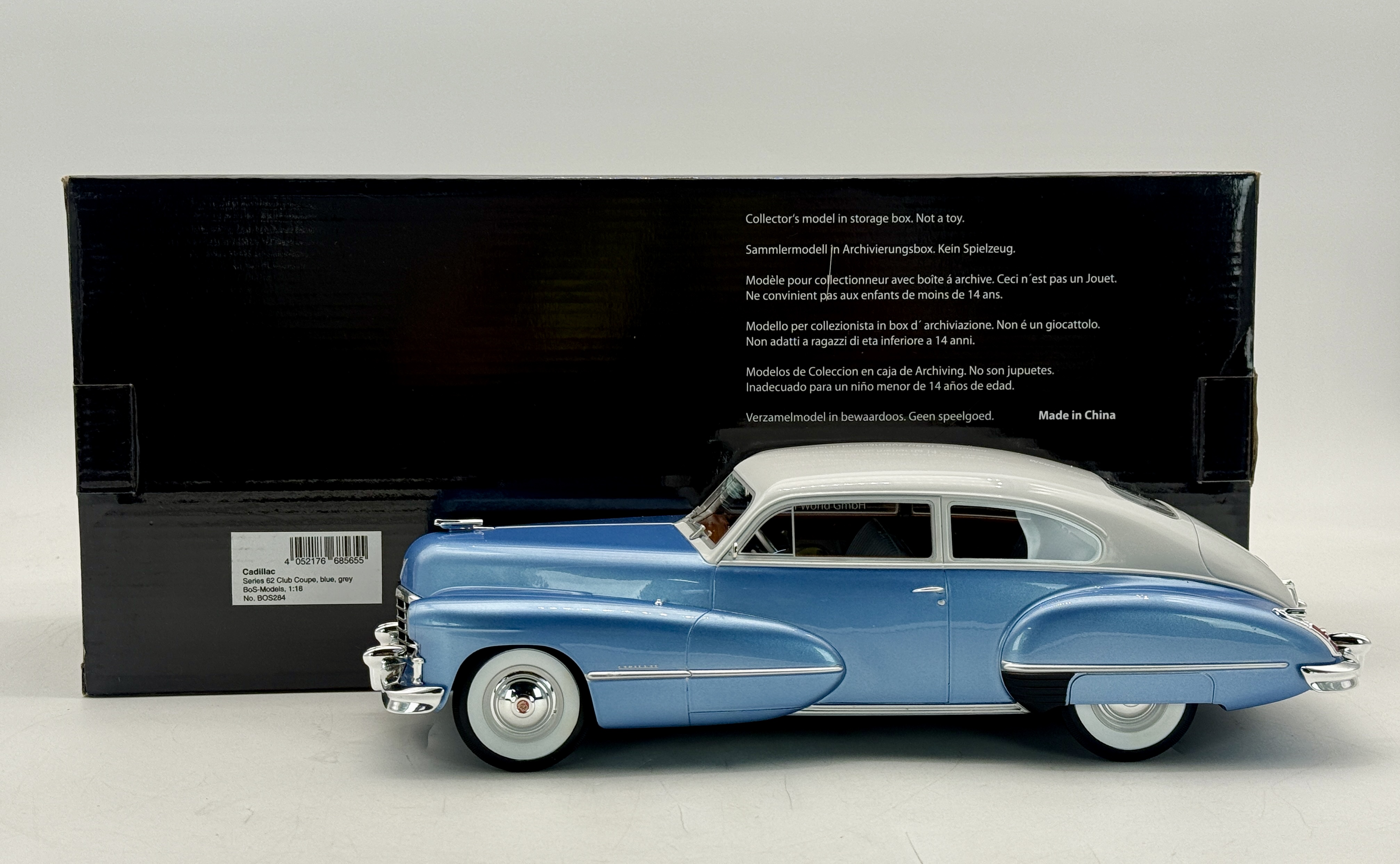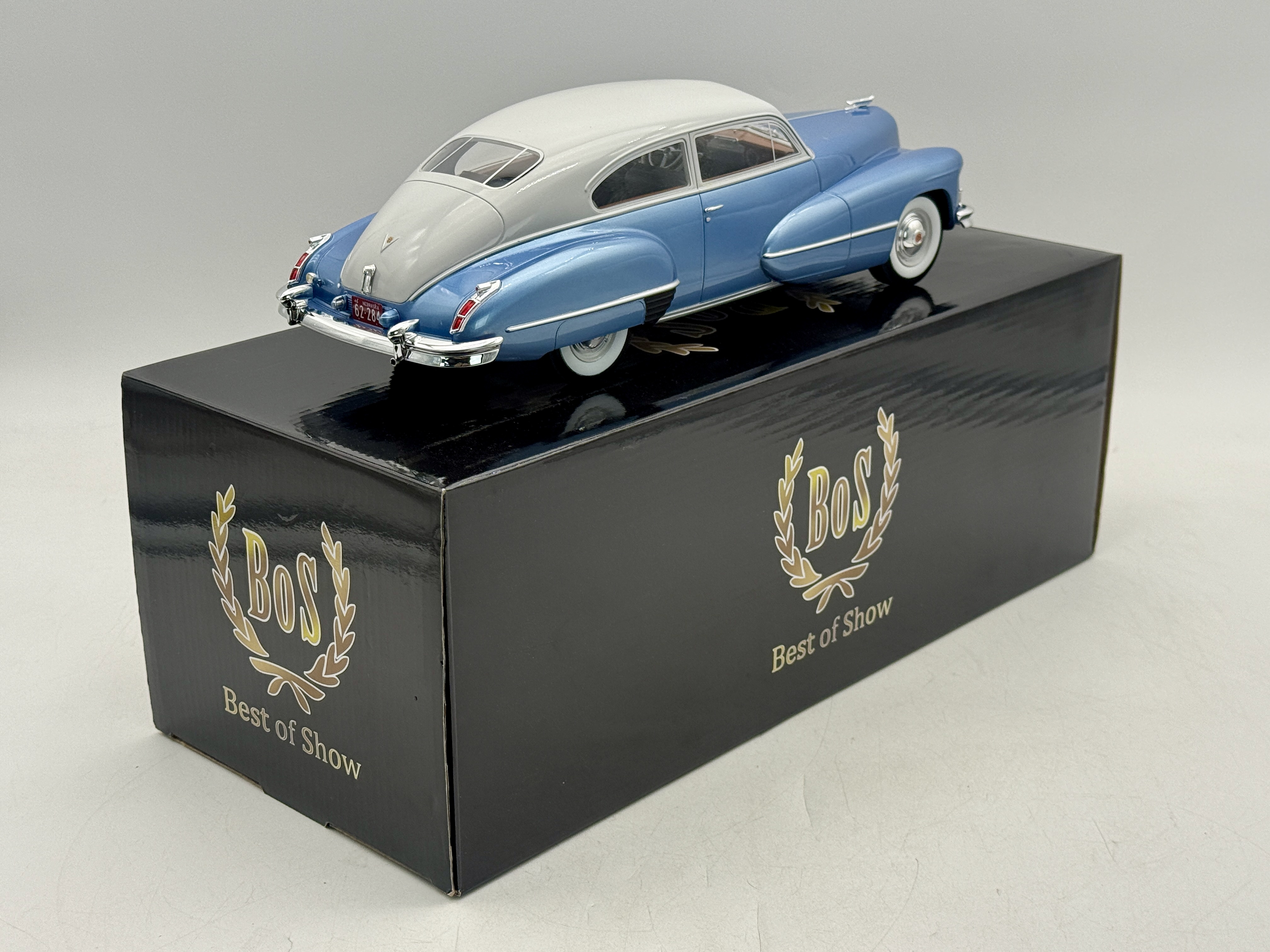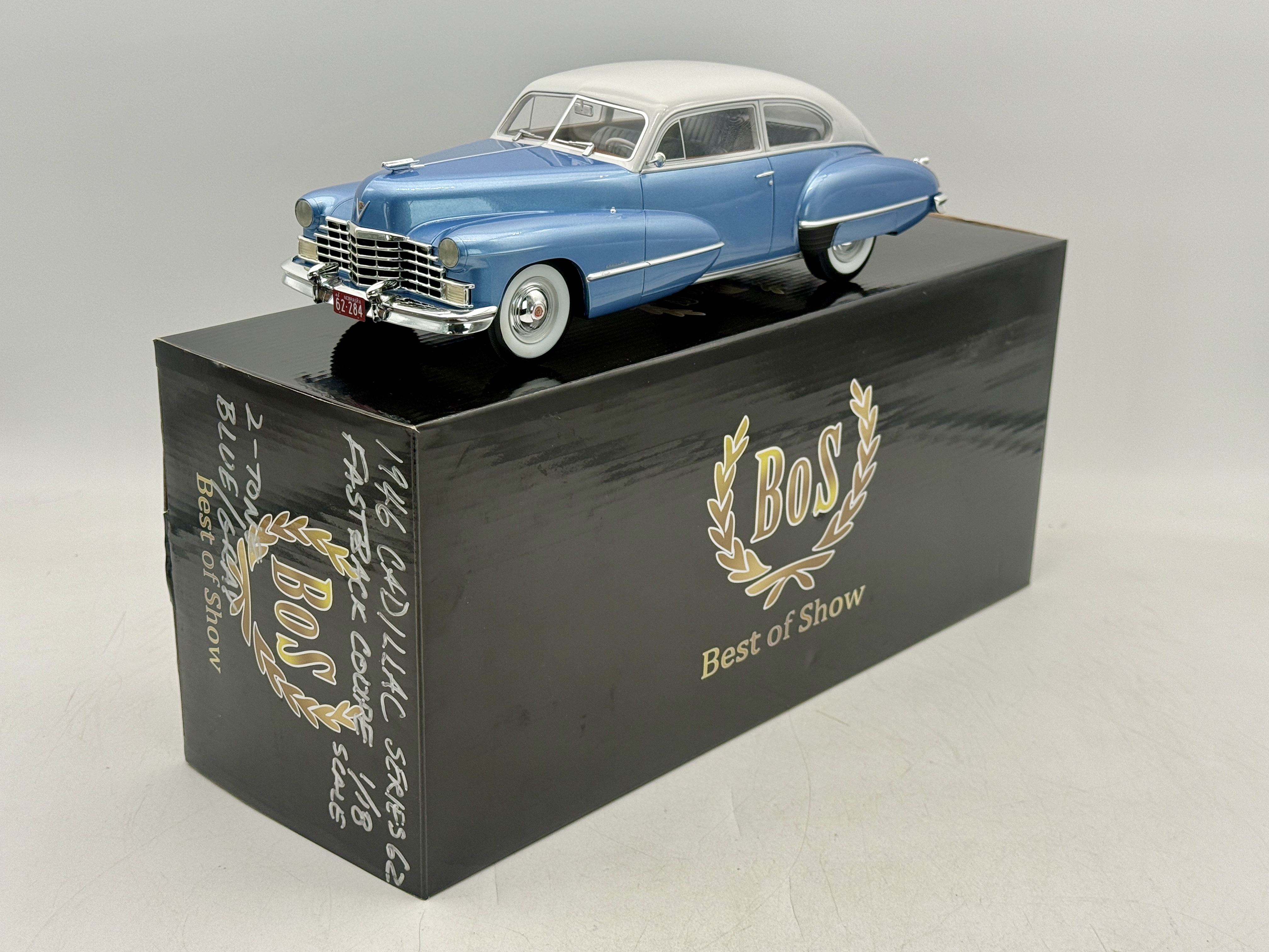 A 1/18 scale BoS model of a 1946 Cadillac Series 62 Fastback Coupe finished in two-tone blue and grey, accompanied by its original branded box. #357 of 1000. OB mw C9