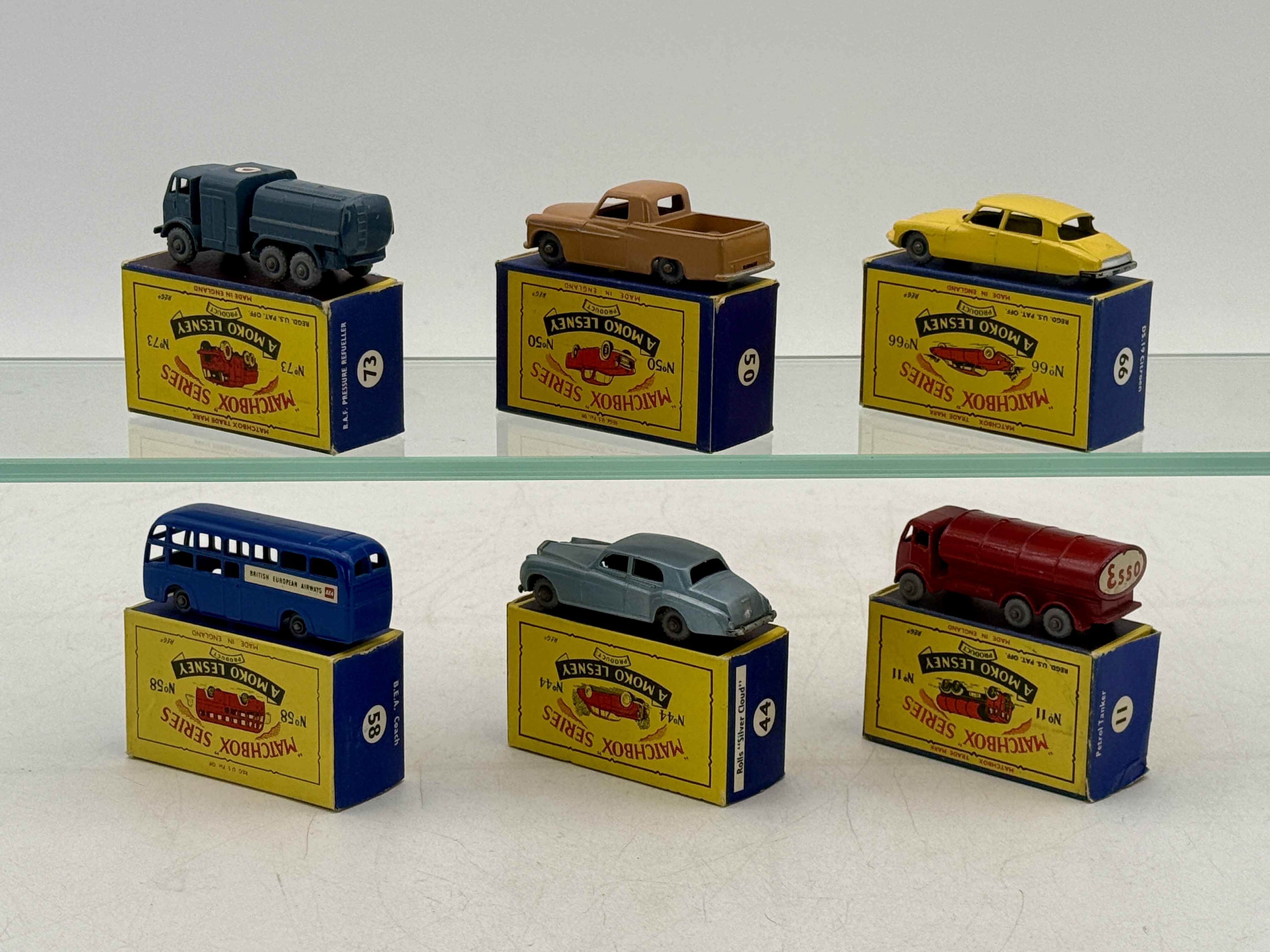 A collection of six Matchbox Series die-cast vehicles, 73A1 pressure refueler, 50A3 commer pick up, 60A1 citroen, 58A2 BEA bus, 44A2 Rolls-Royce, 11B3 Road tanker OB’s C8-9
