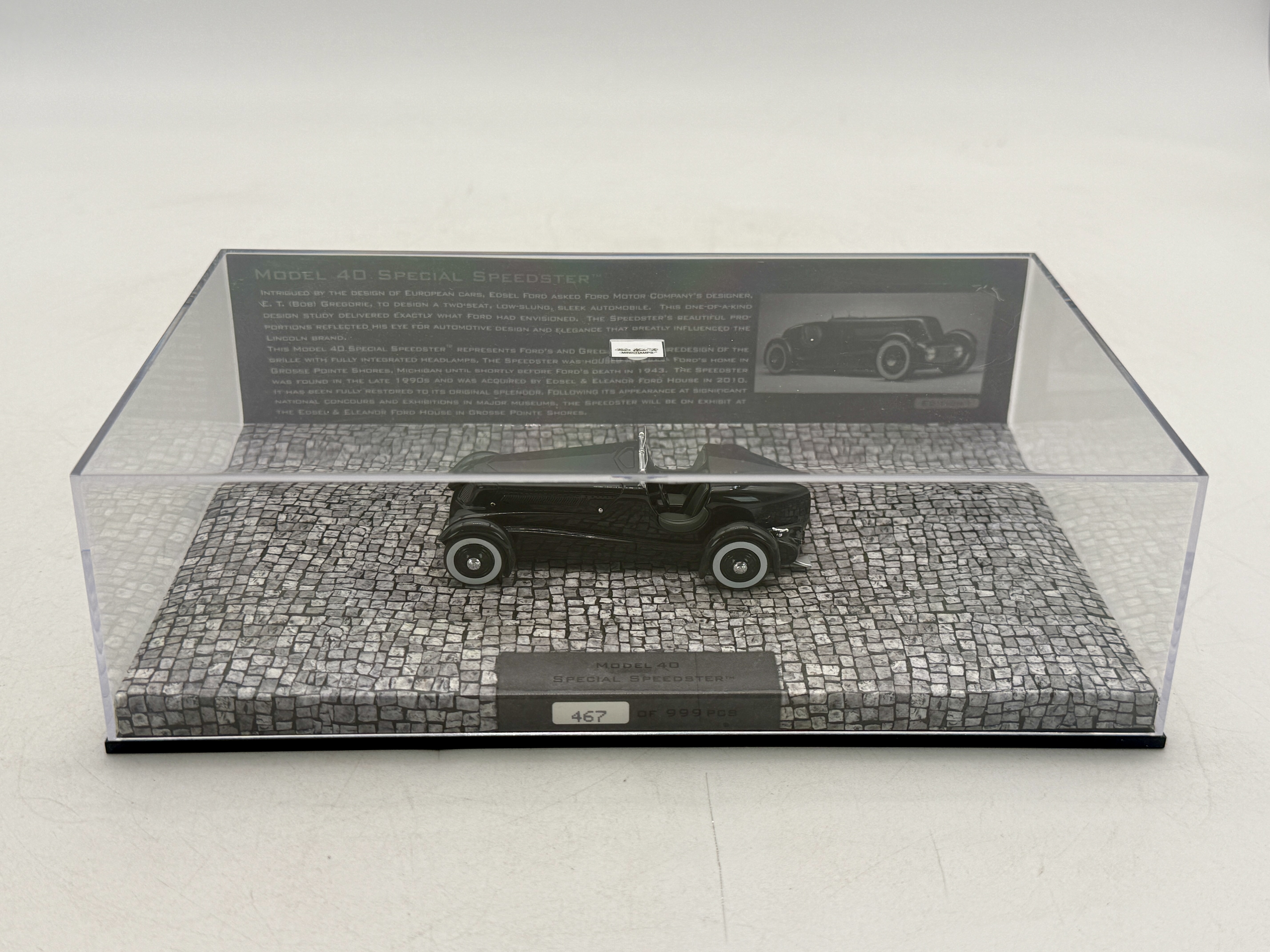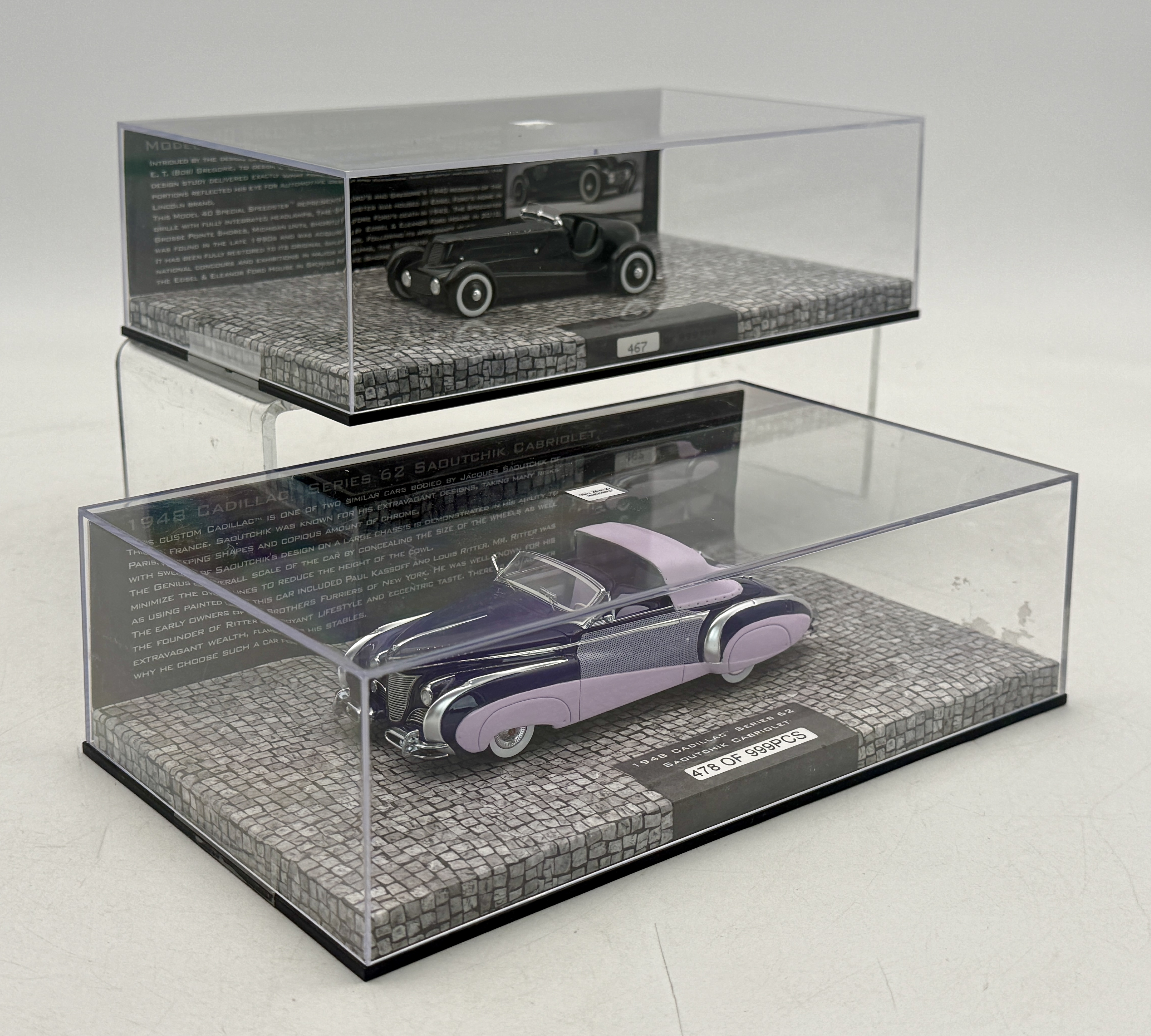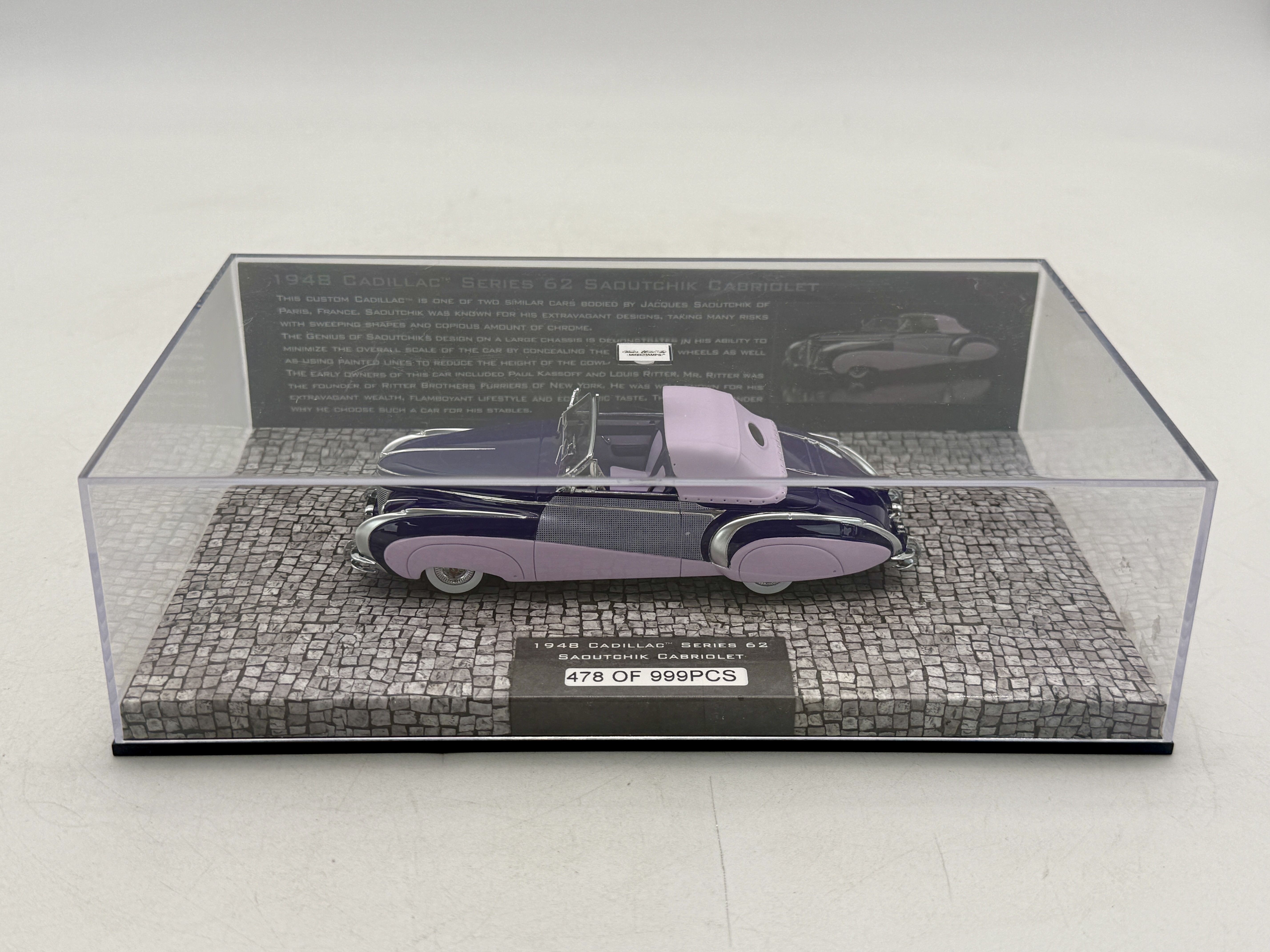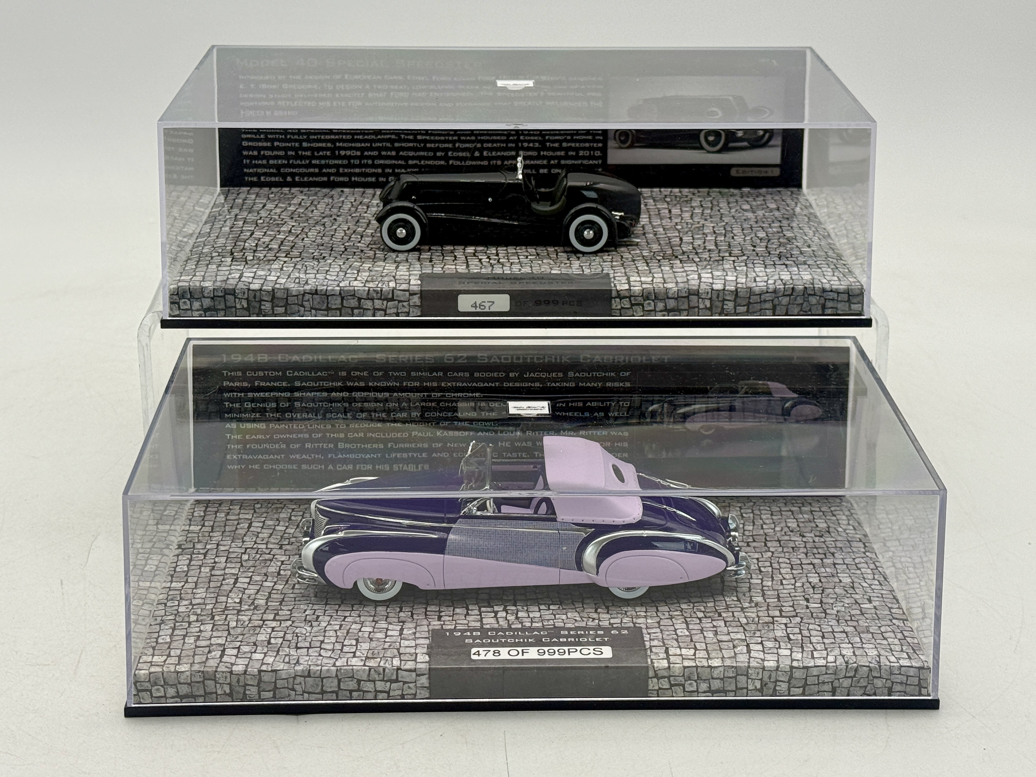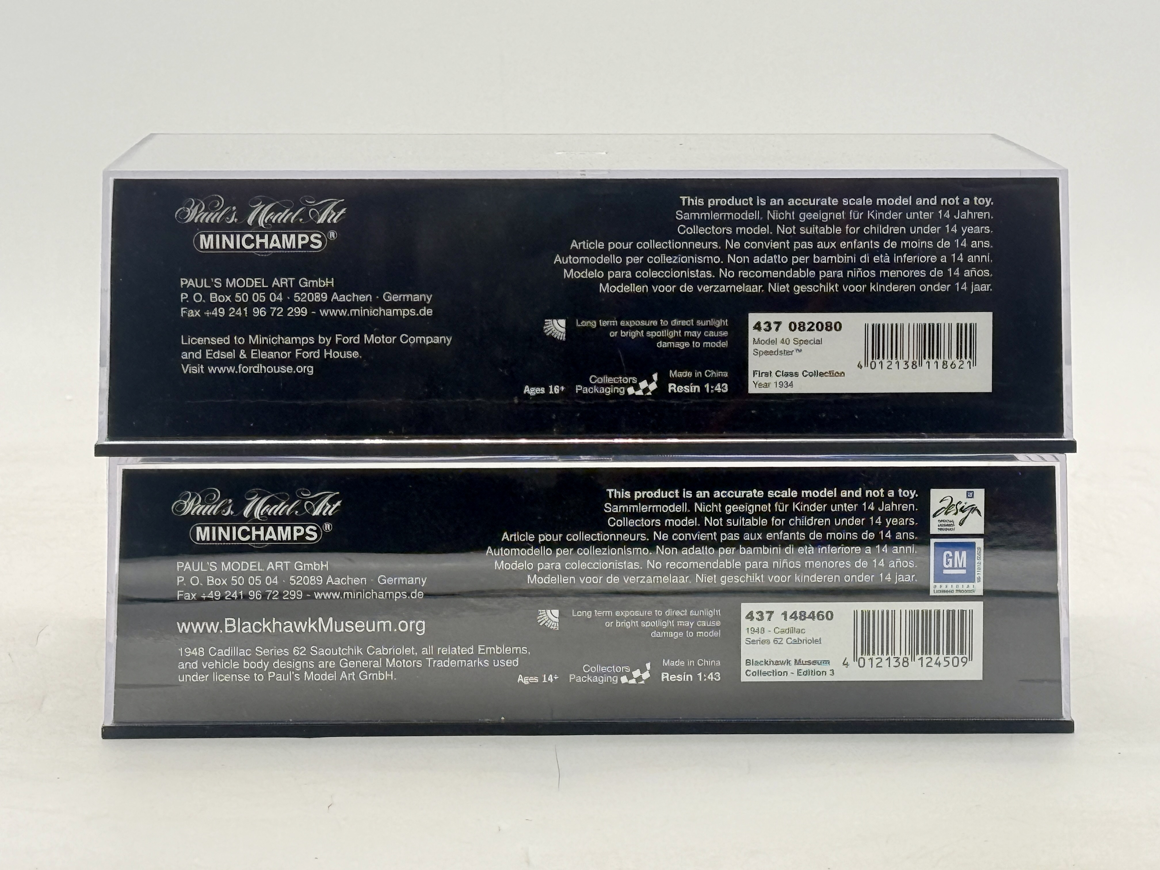Two 1:43 scale resin model cars by Minichamps including a black Model 40 Special Ford Speedster 437-082080 and a purple and pink 1948 Cadillac Series 62 Saoutchik Cabriolet 437-148460, both housed in individual display cases with limited edition labels. OB’s C9