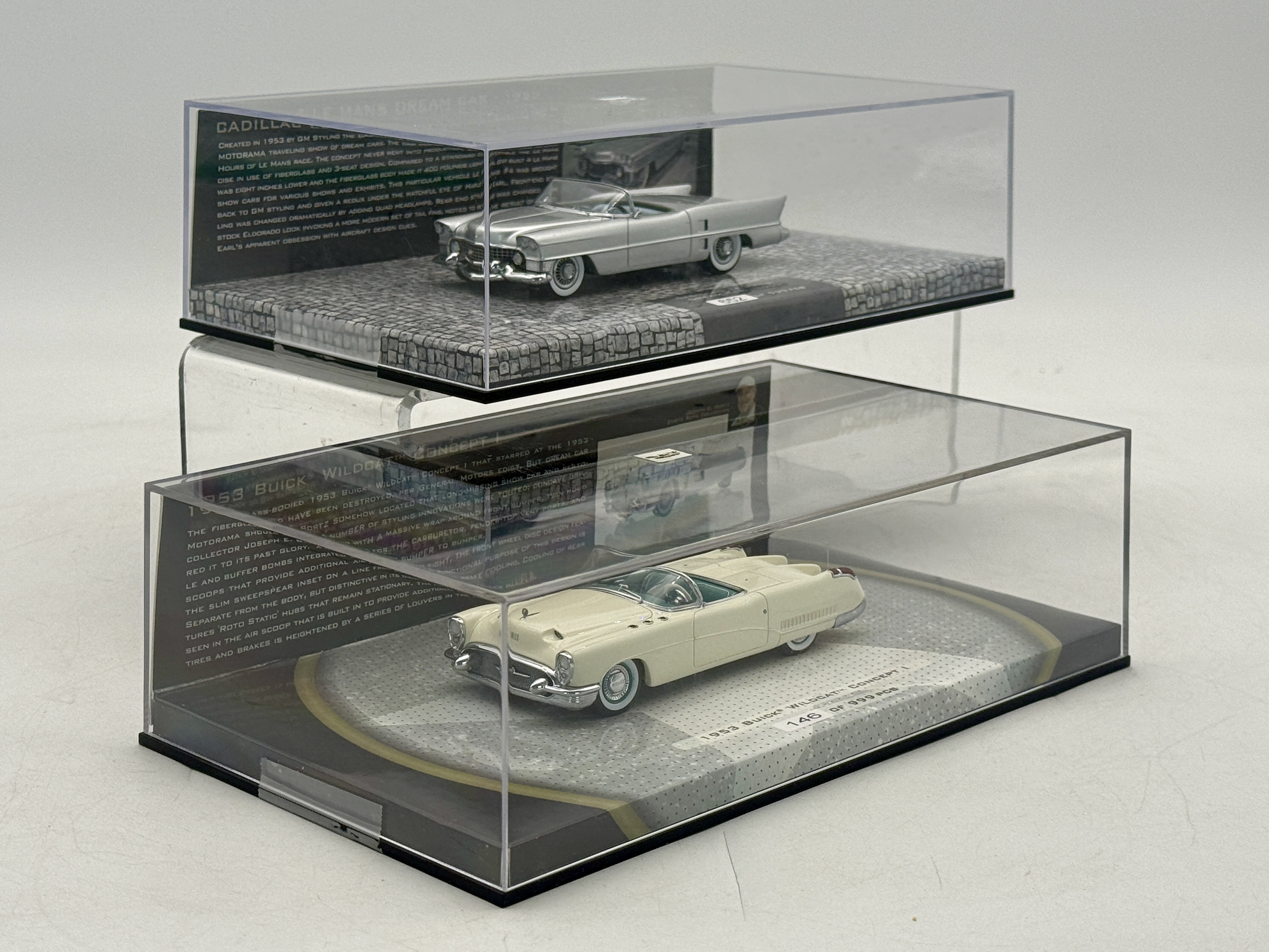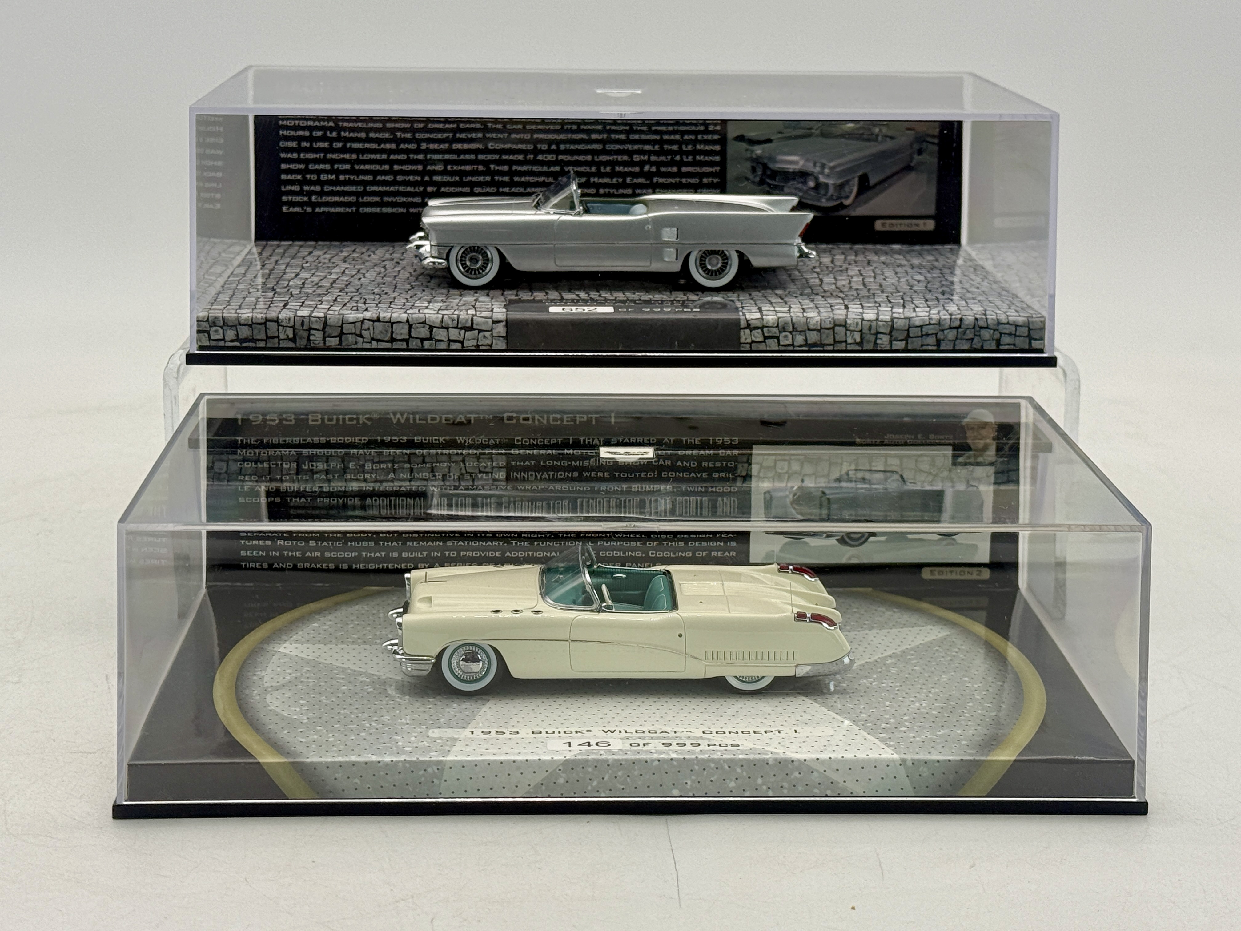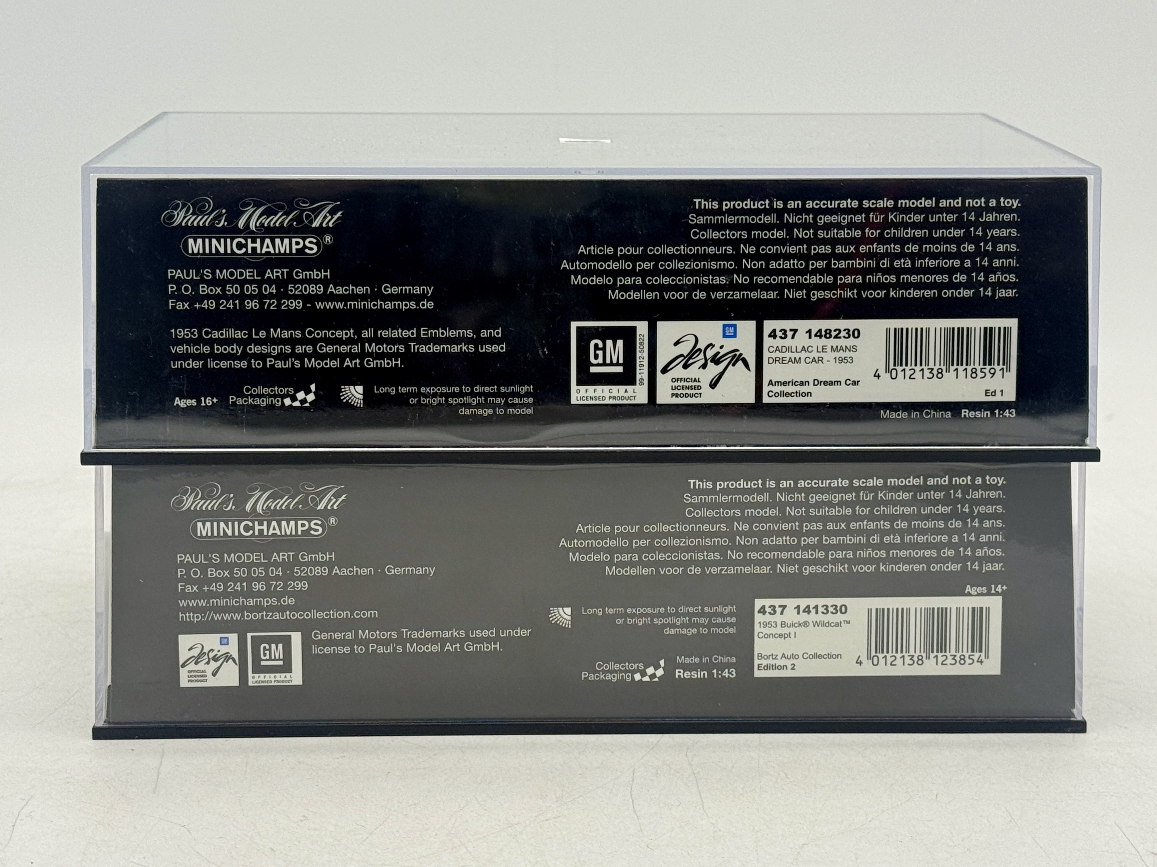 A pair of 1:43 scale resin model cars by Paul’s Model Art Minichamps featuring a silver 1953 Cadillac Le Mans Dream Car 437-148320 and a cream 1953 Buick Wildcat Concept I 437-141330, both housed in clear display cases. OB’s C9.