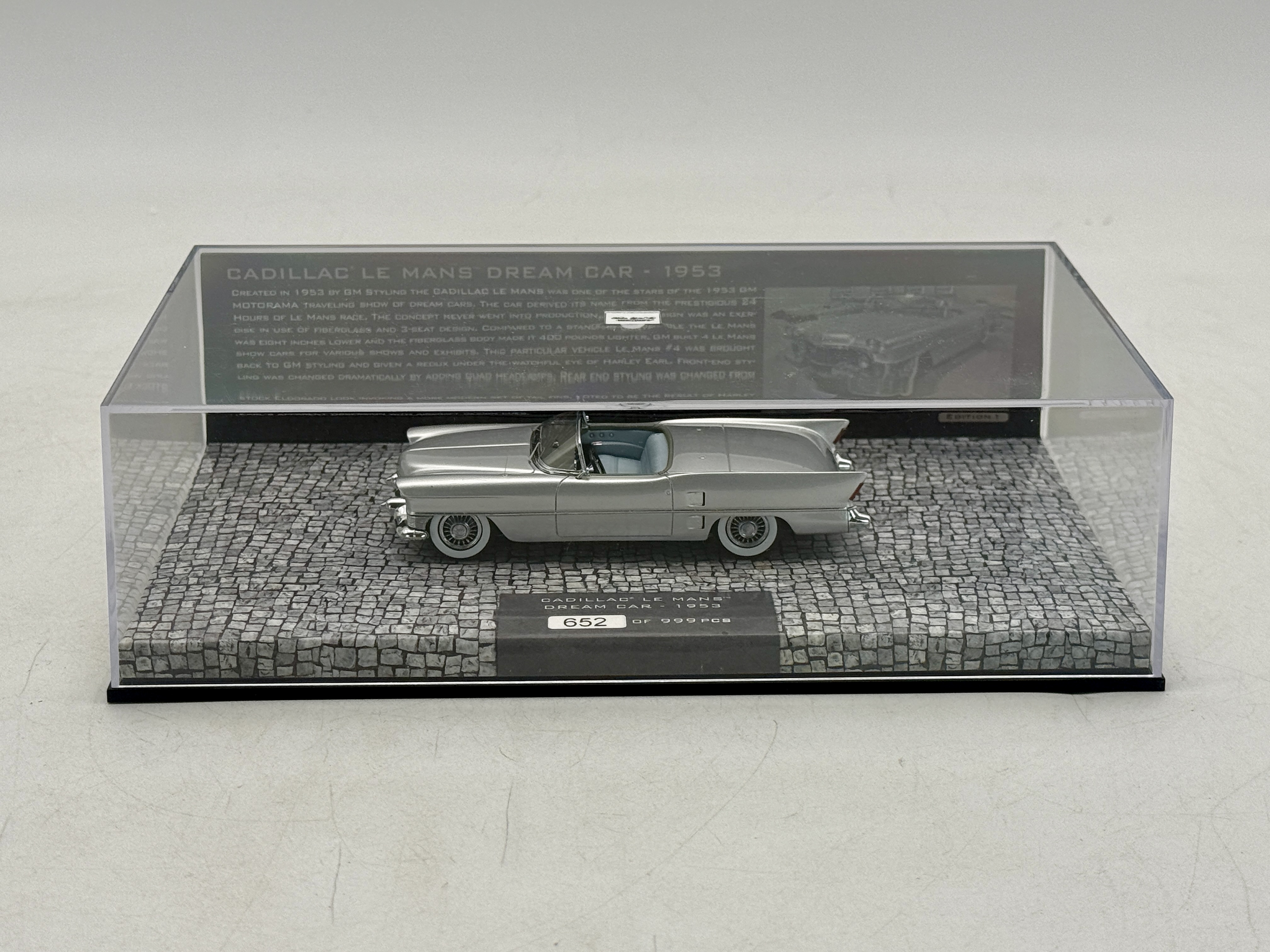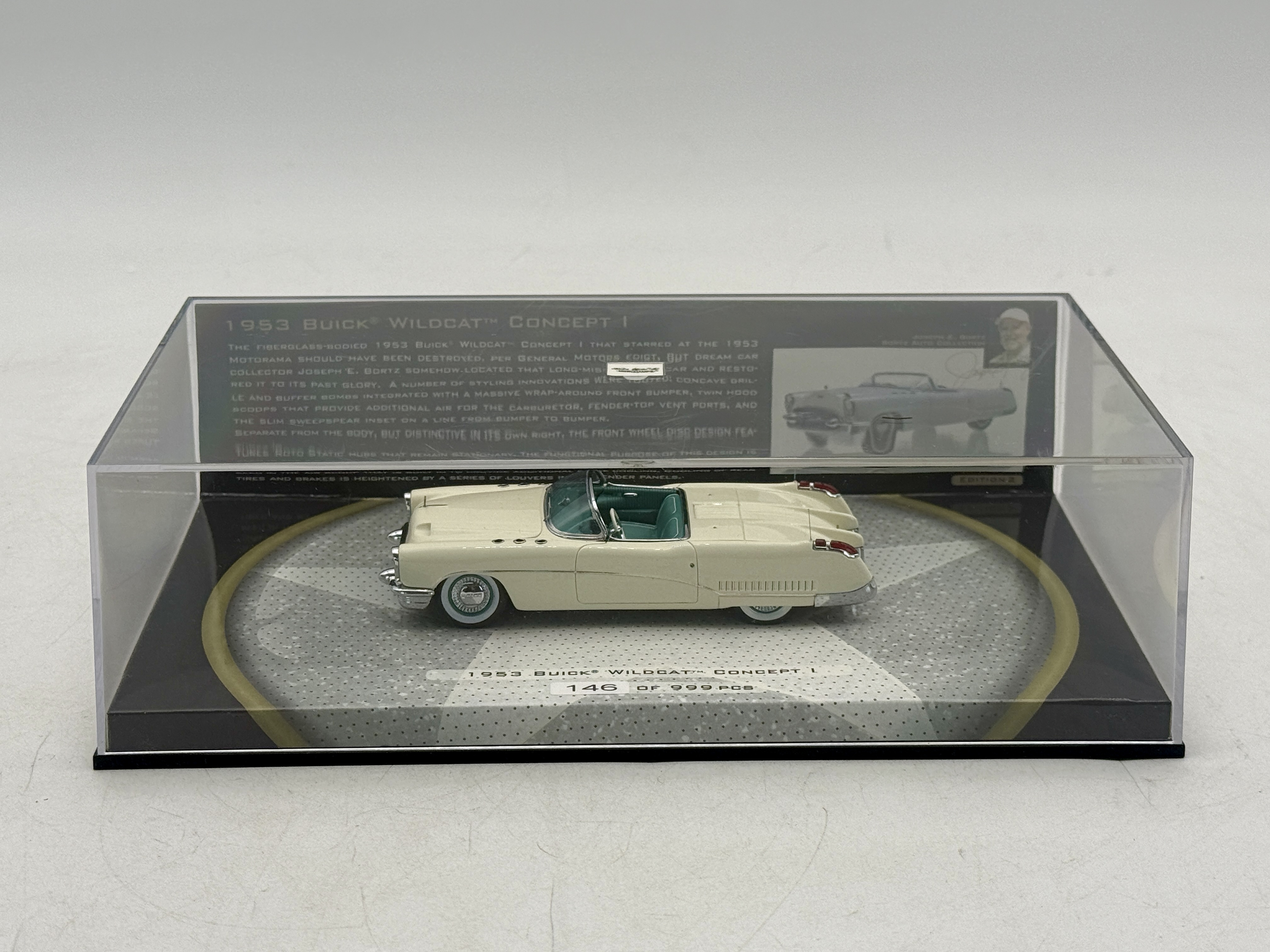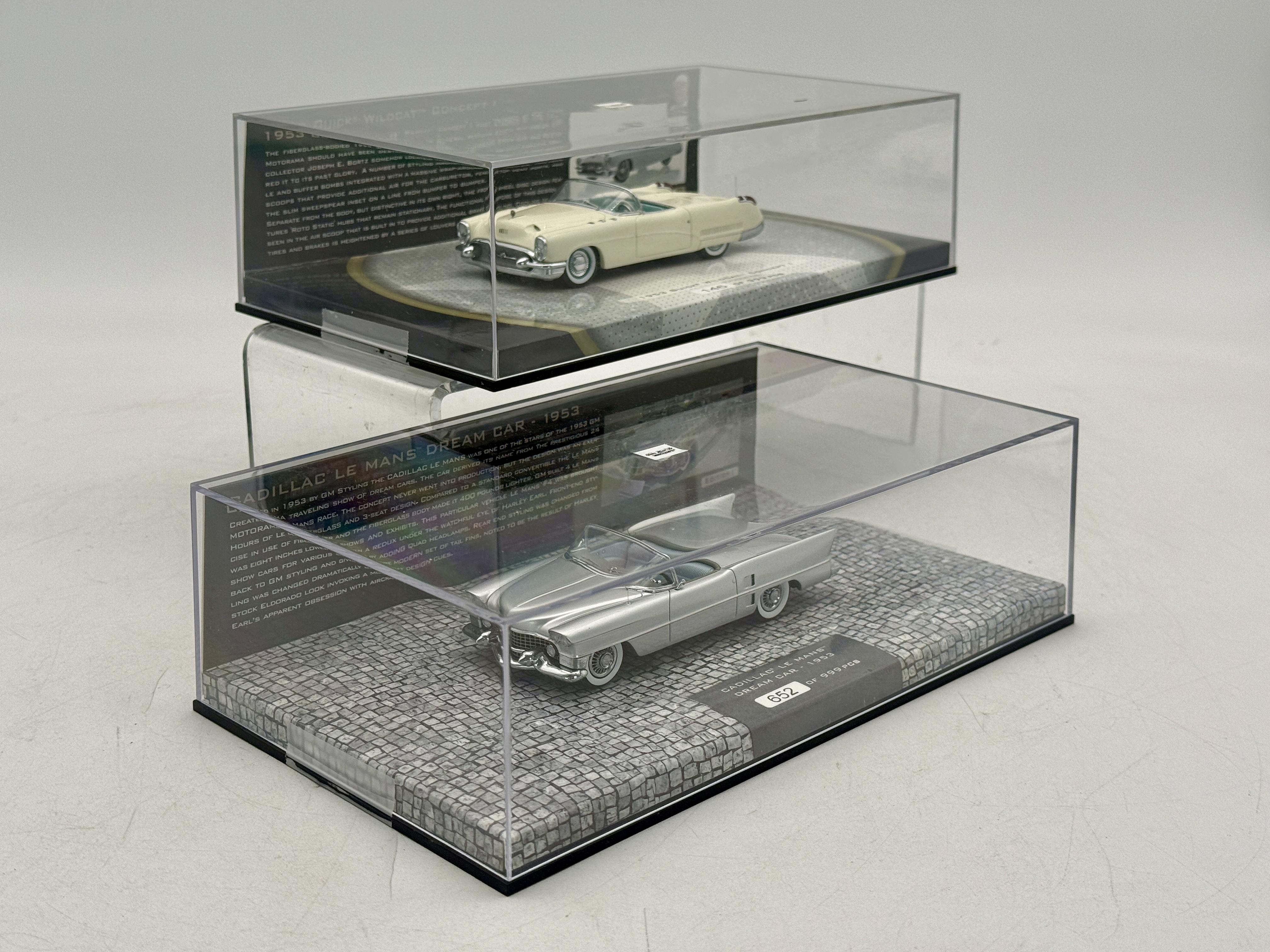A pair of 1:43 scale resin model cars by Paul’s Model Art Minichamps featuring a silver 1953 Cadillac Le Mans Dream Car 437-148320 and a cream 1953 Buick Wildcat Concept I 437-141330, both housed in clear display cases. OB’s C9.