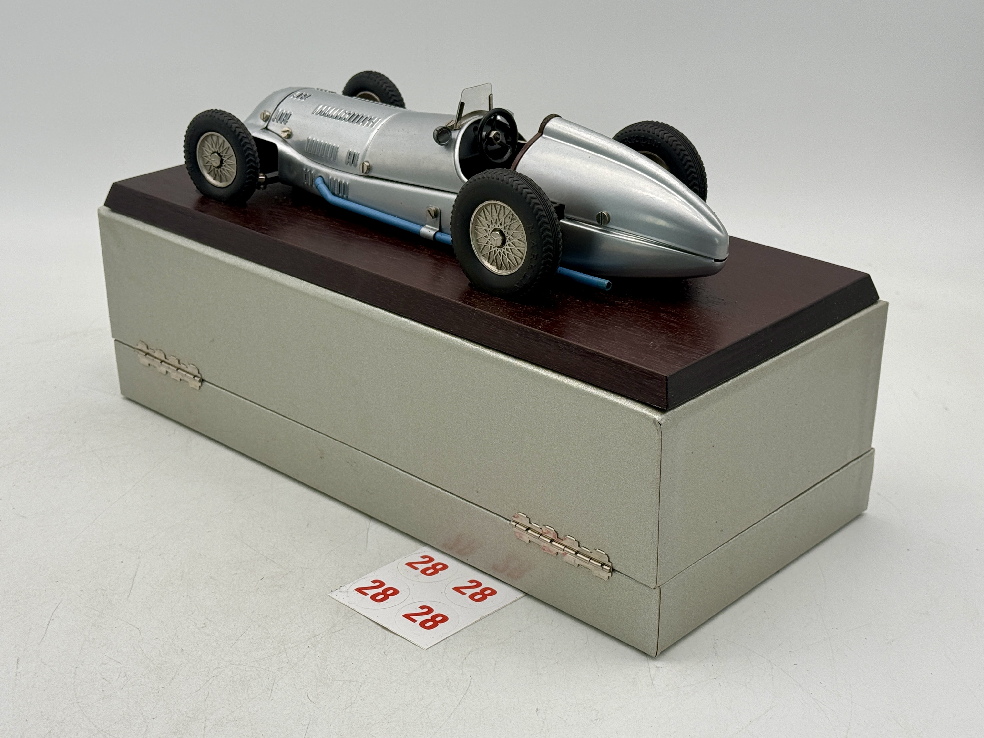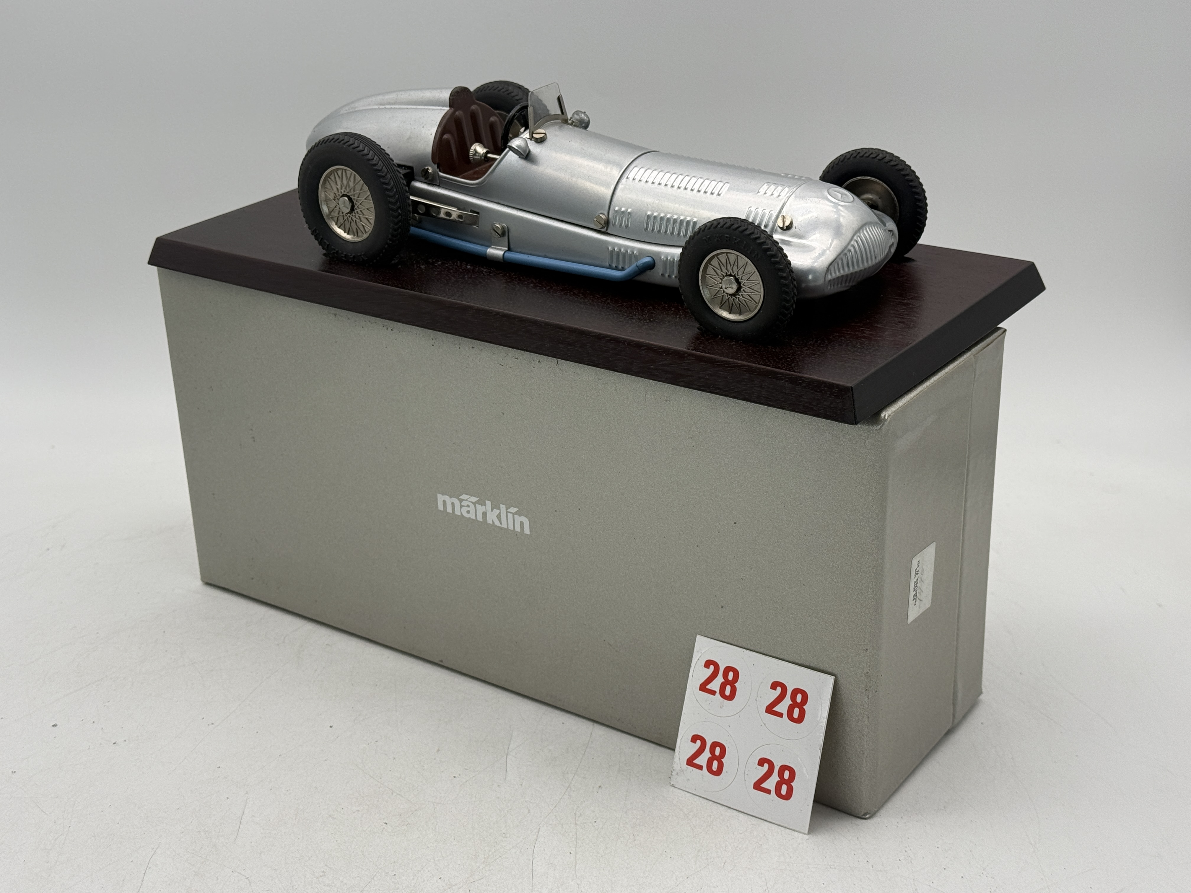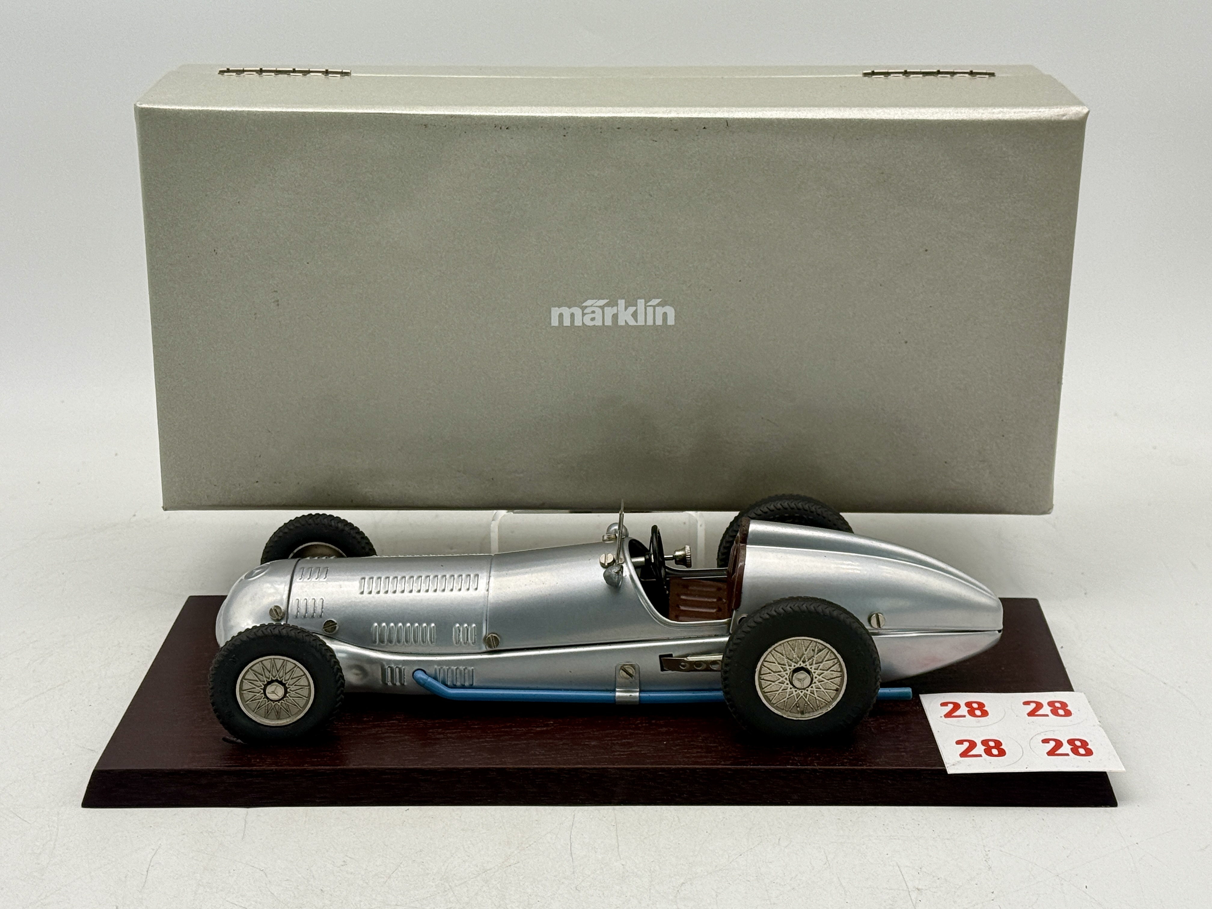 A silver Märklin model Mercedes-Benz racing car featuring a blue exhaust pipe and brown interior, mounted on a dark wood base with its original light grey hinged storage box. 10 1/2 inches long mounted on wood plant CW / W w/key OB MW C9