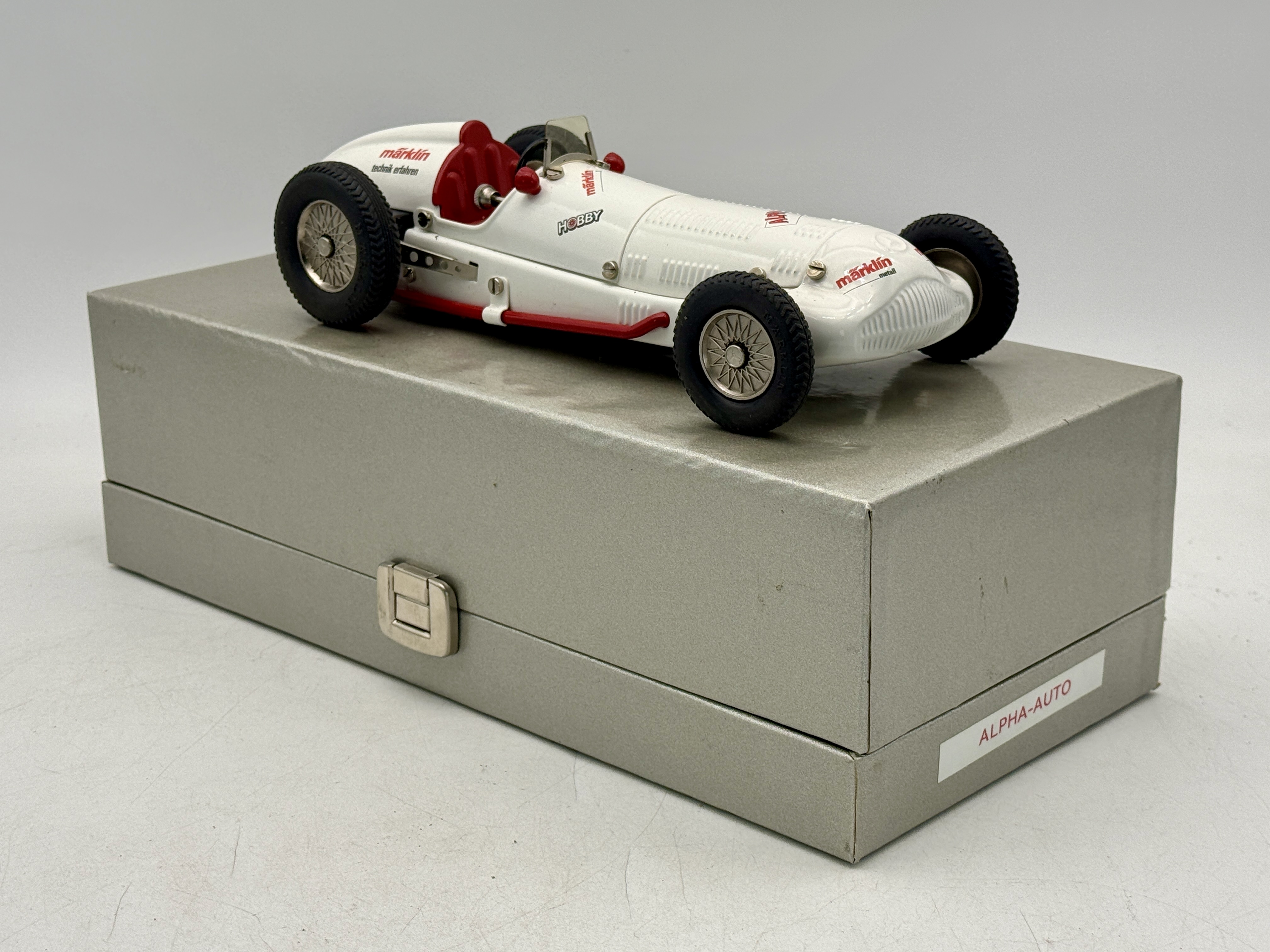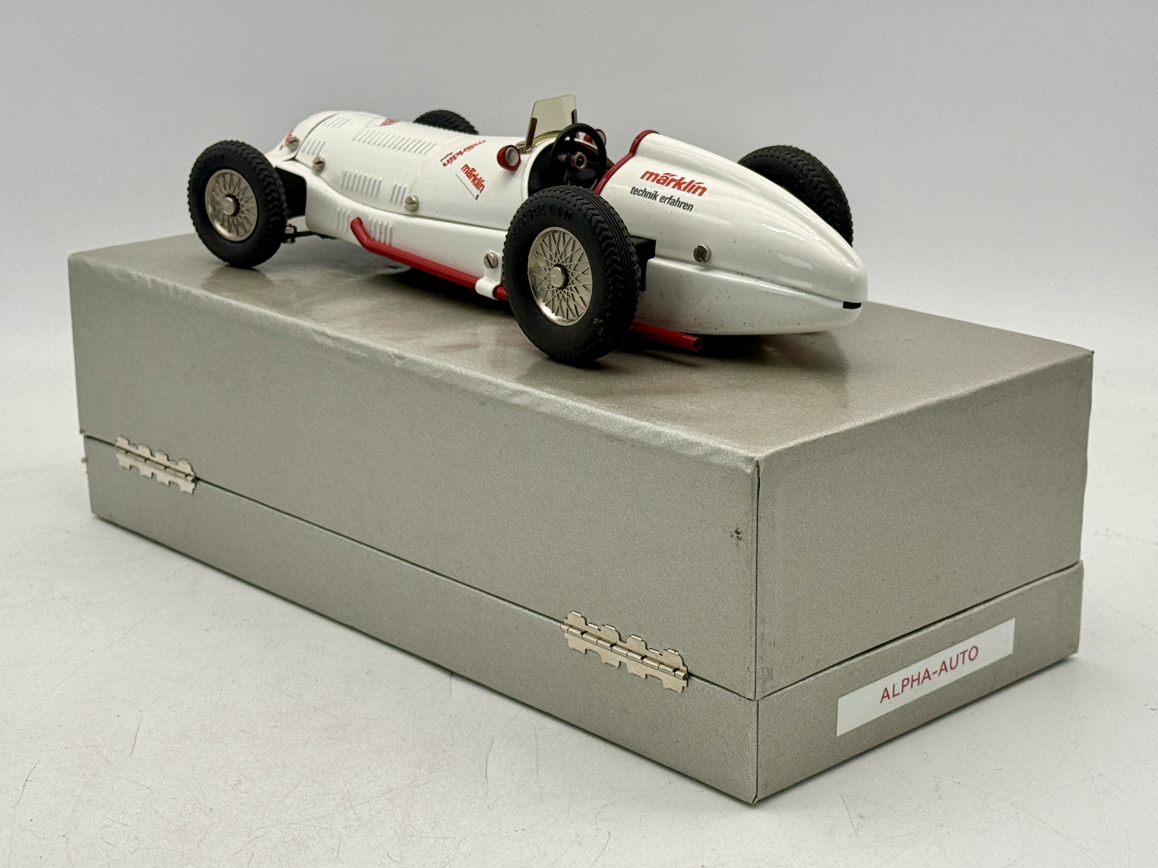 A white Märklin Alpha toy racing car featuring red accents and interior, accompanied by a silver presentation box labeled ALPHA-AUTO. Painted 10 10 1/2 inches long CW/W w/key OB mw C9.