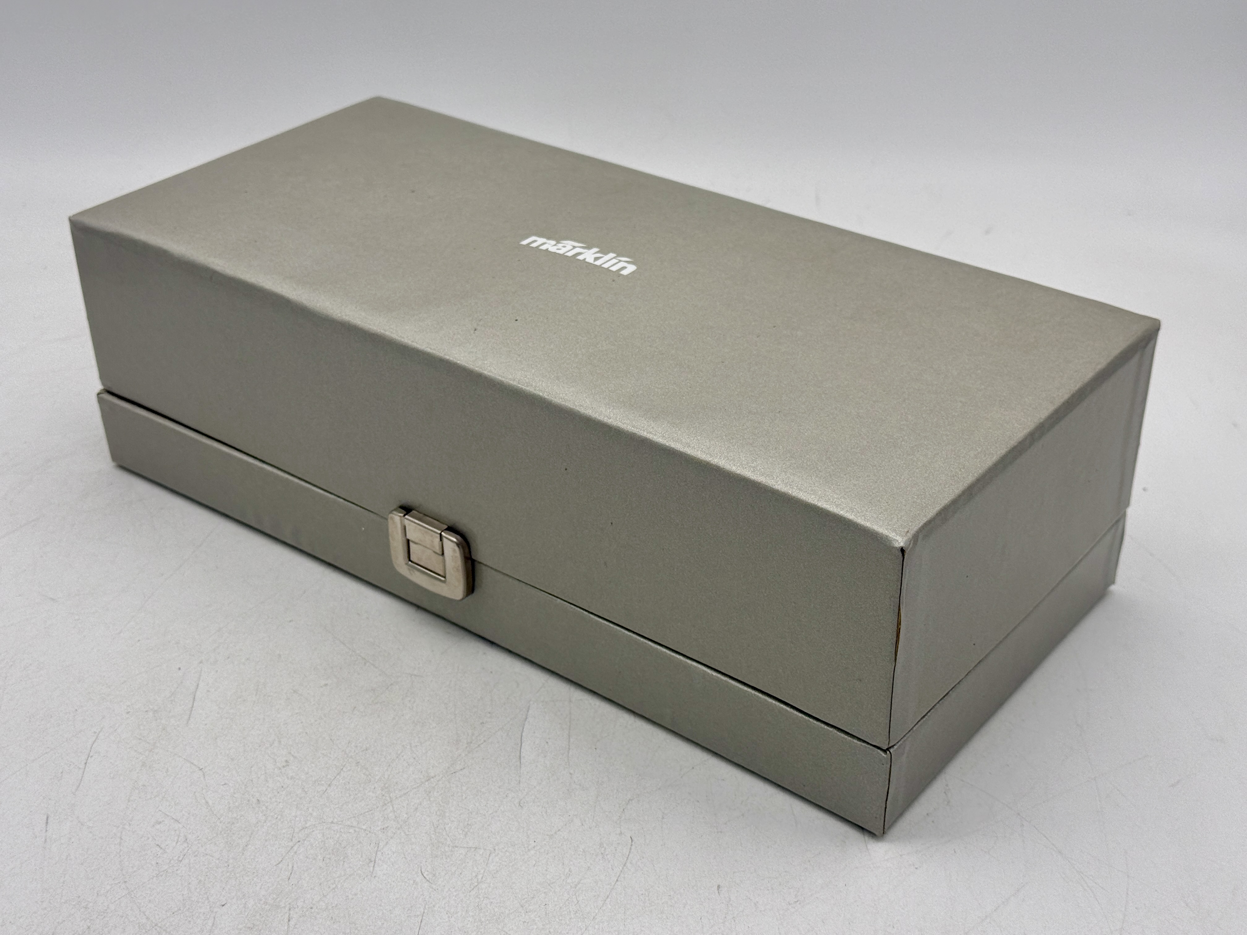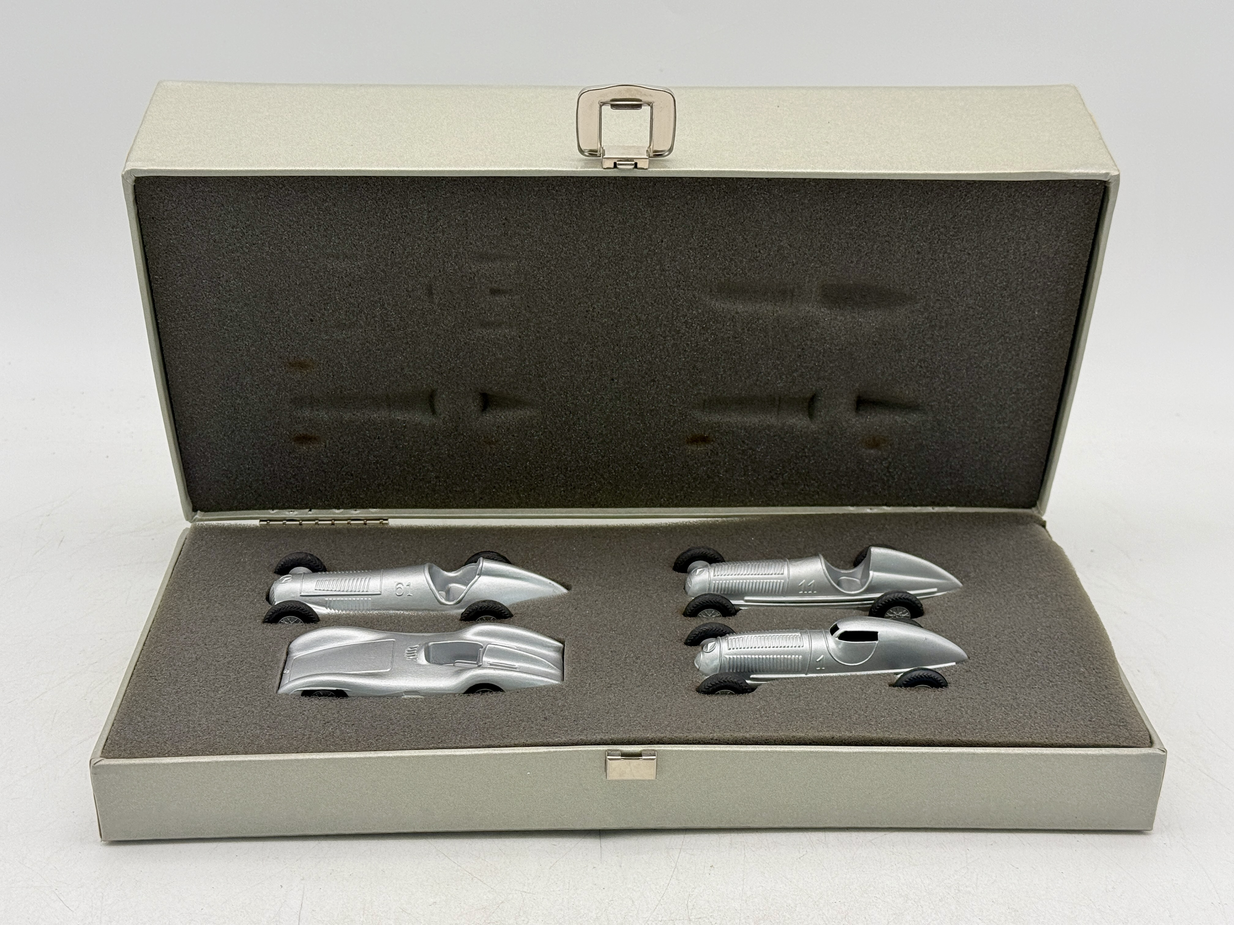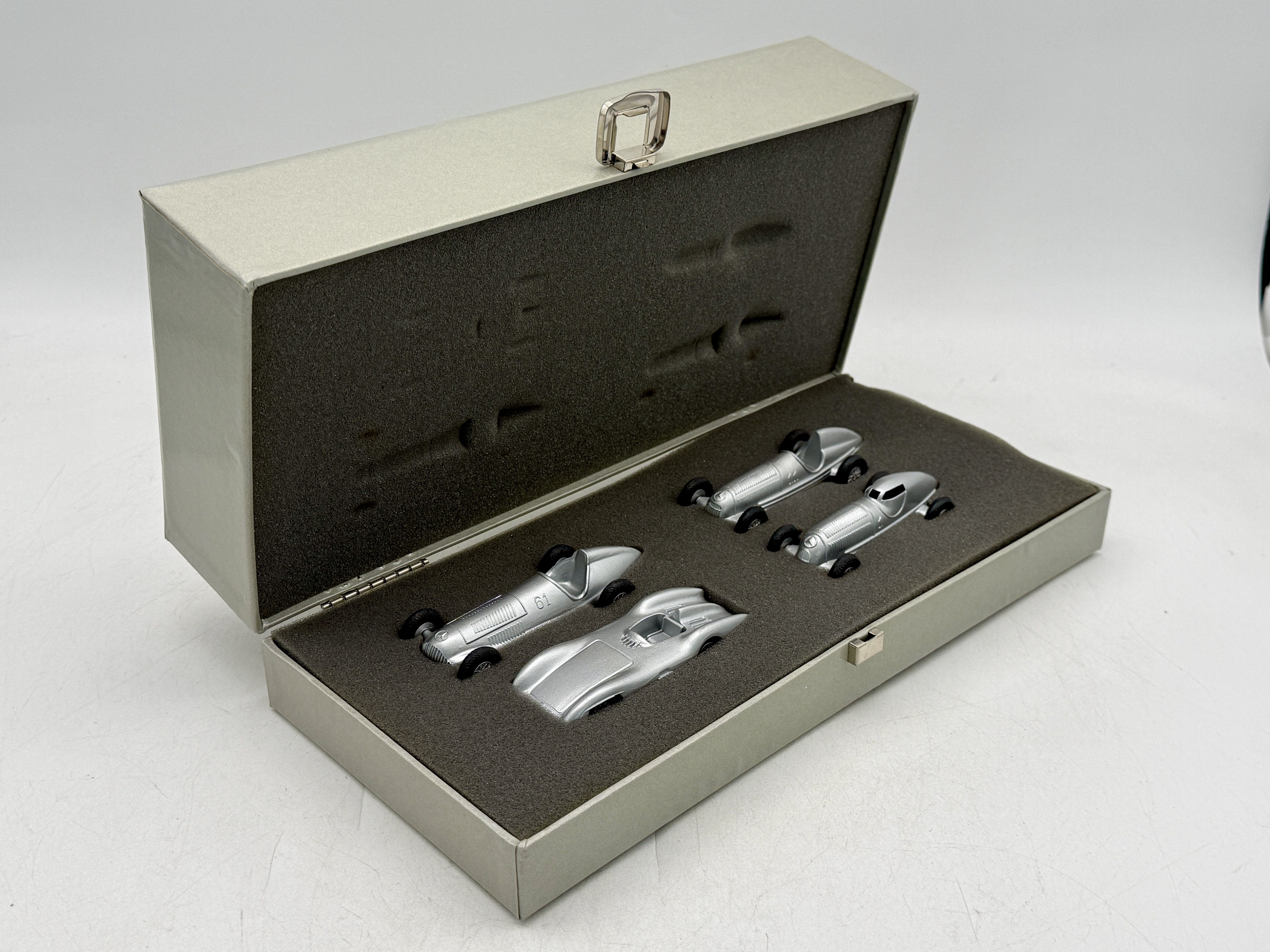 A collection of silver colored diecast Mercedes Benz racing cars including models numbered 61 and 11 housed in a grey Marklin storage box. Reproduction Mercedes from the 1930s, OB’s and inserts C9