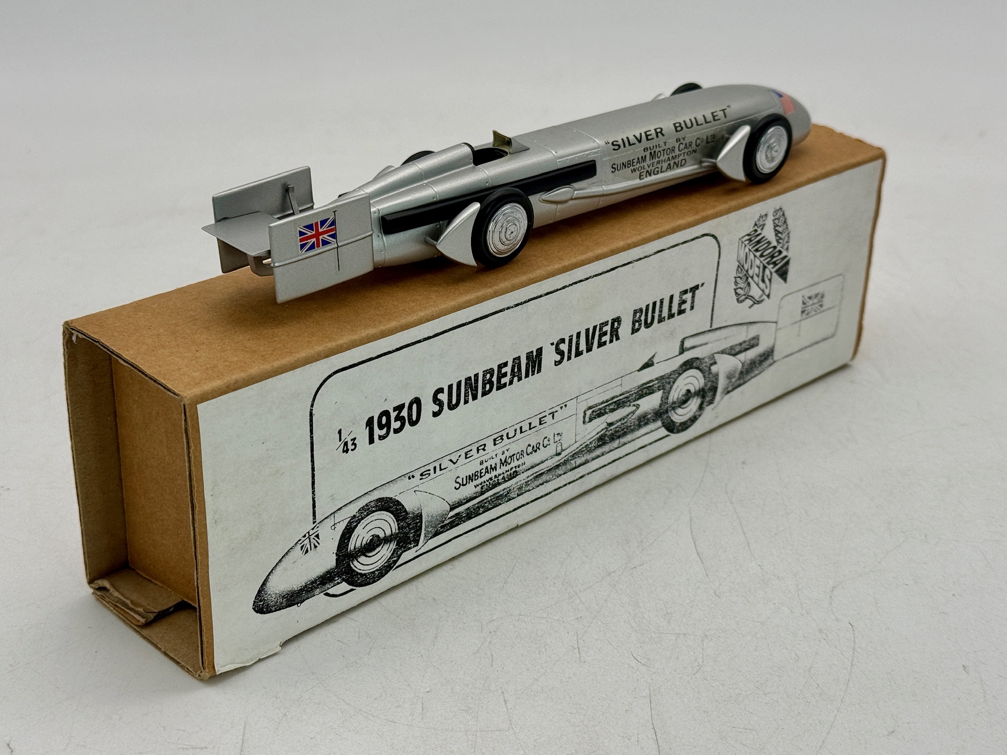 A white metal, silver 1/43 scale model of the 1930 Sunbeam Silver Bullet land speed record car by Pandora Models featuring Union Jack decals and original box. 8 1/2 inches long OB MW C9.