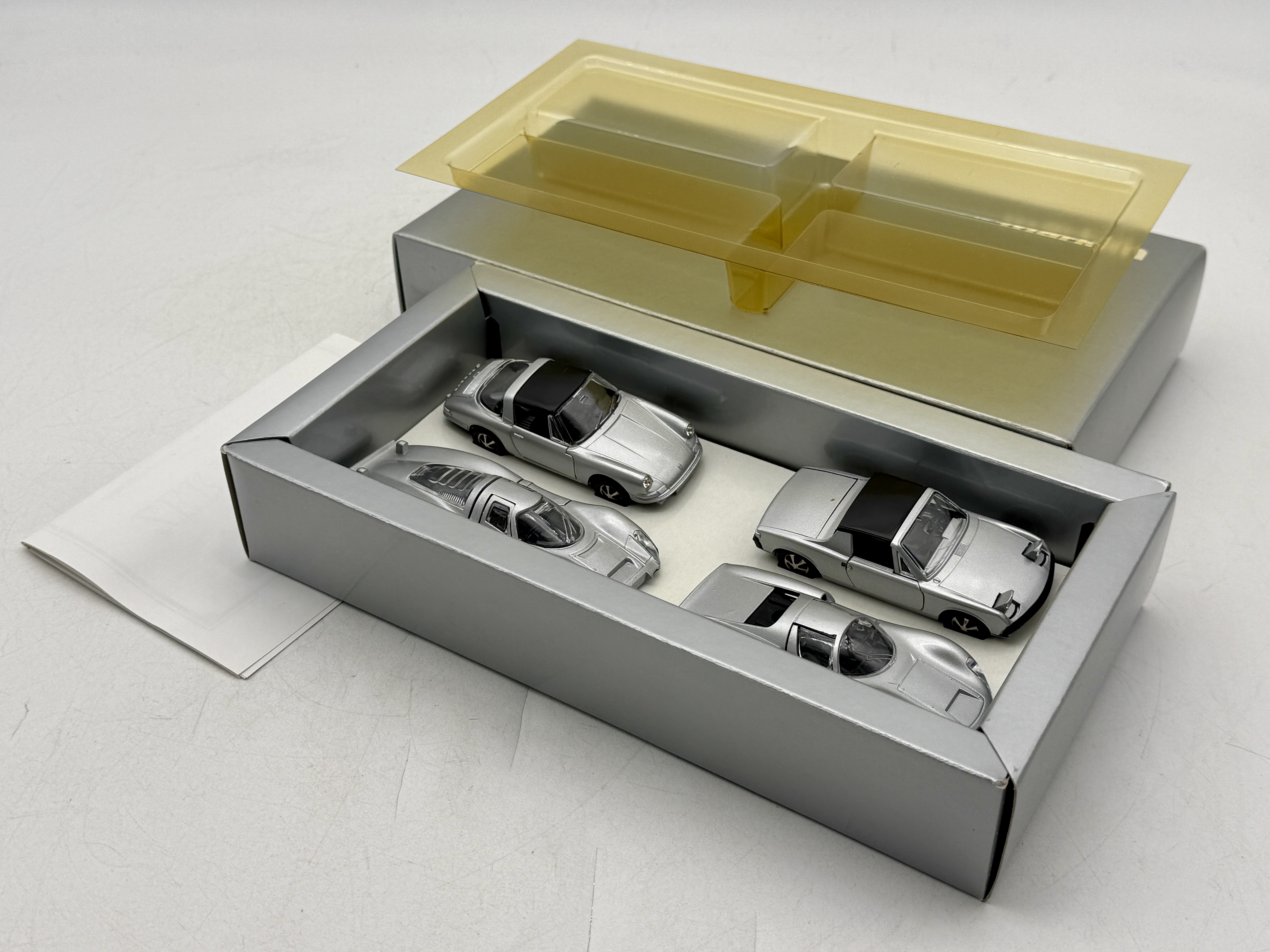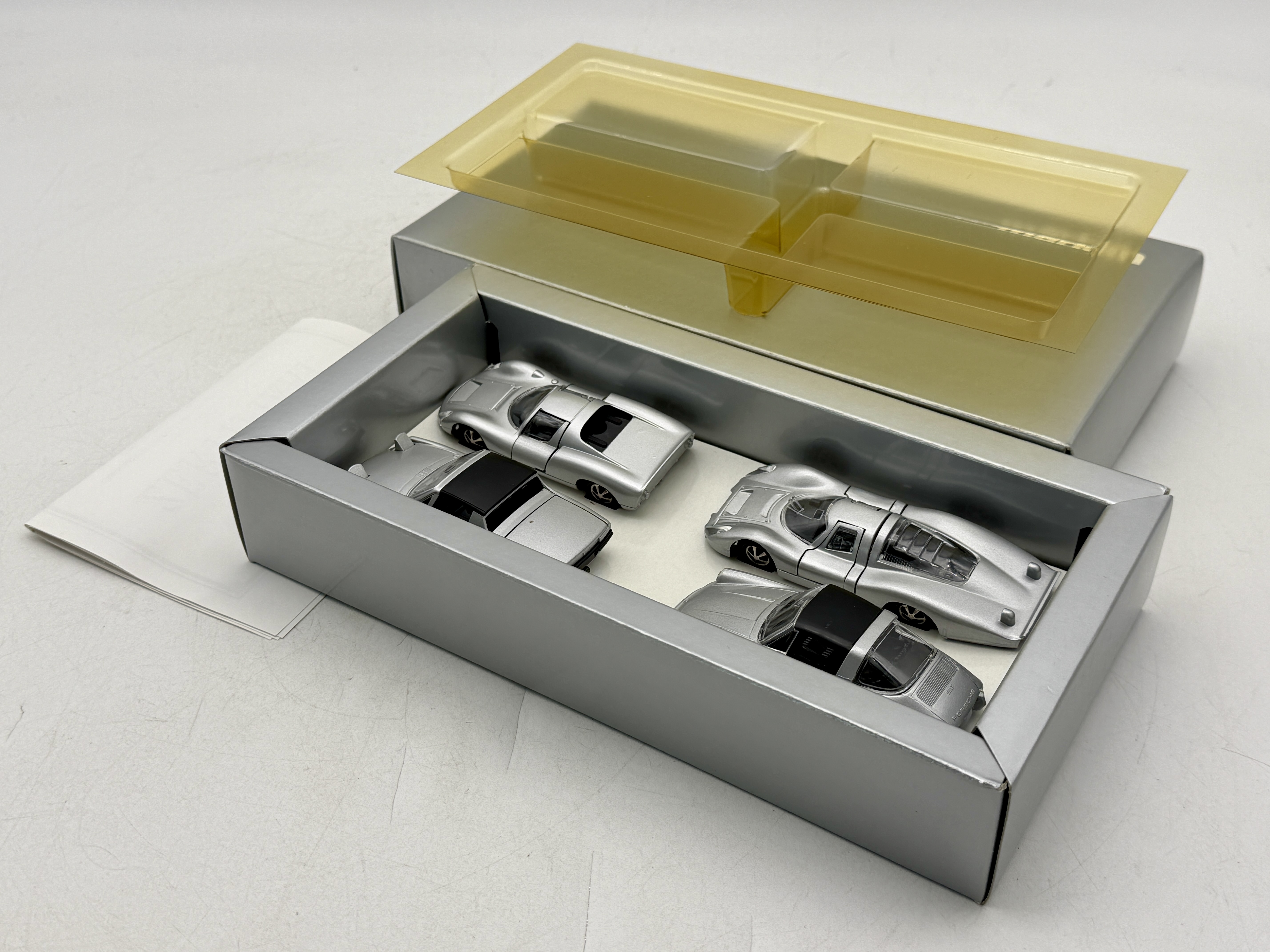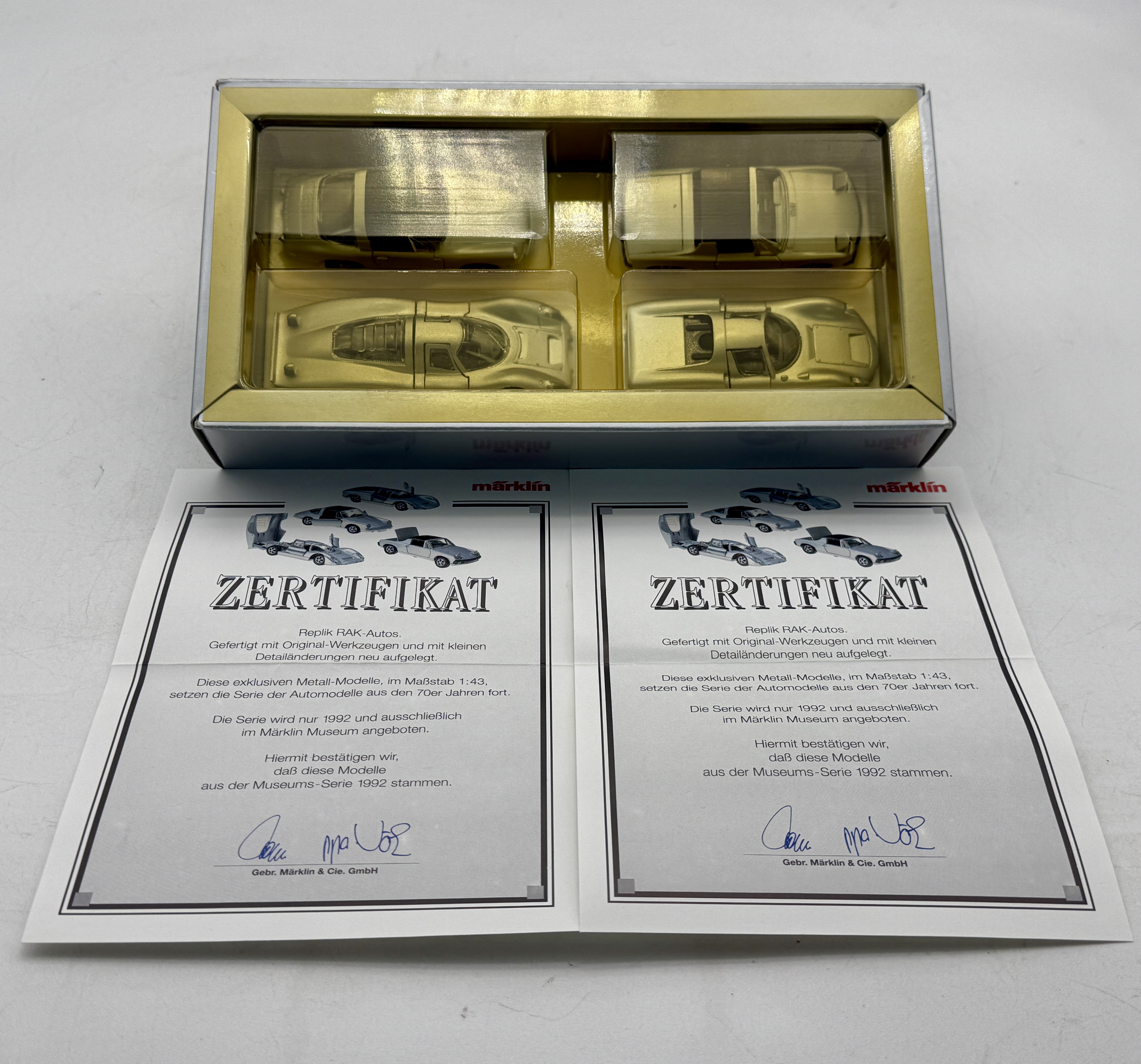 A collection of silver-colored Marklin 1:43 scale model cars from the 1992 Museum Series, housed in a silver box with two certificates. with fast wheels OB’s and inserts C9