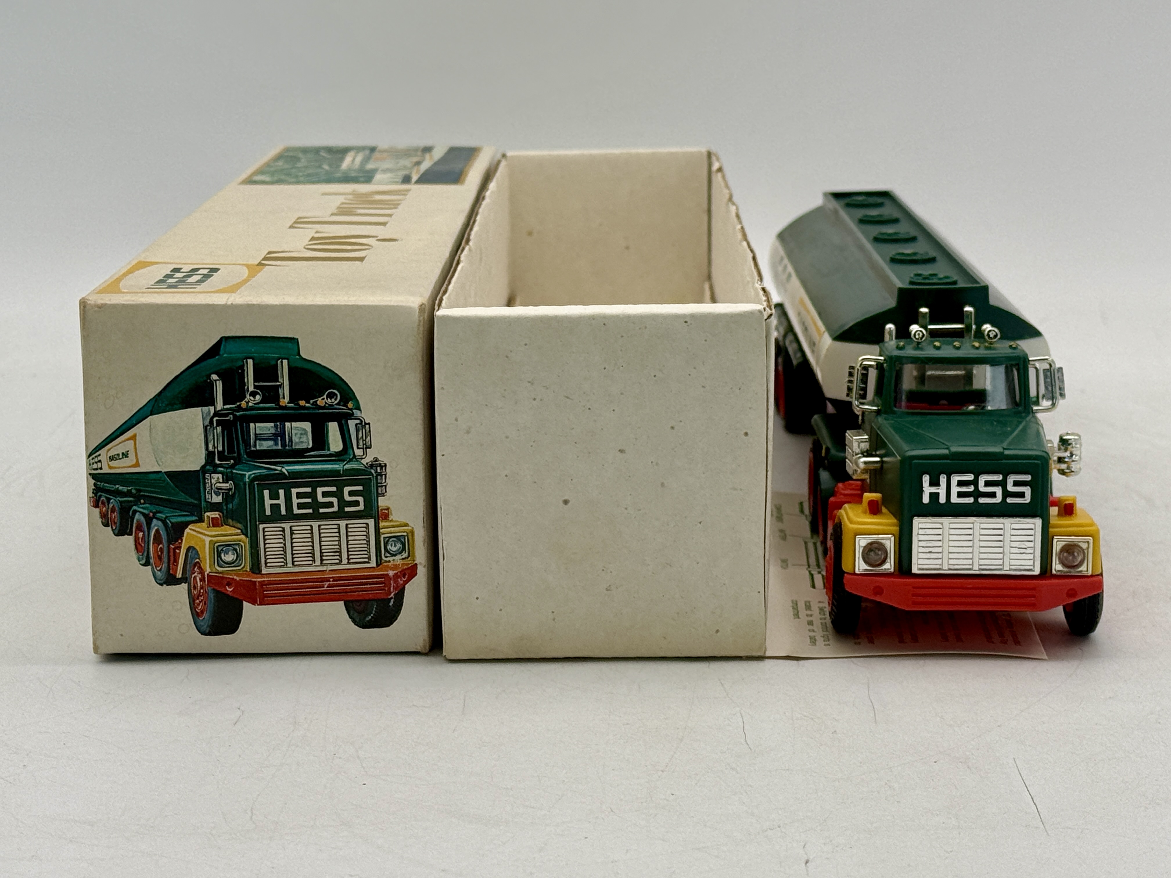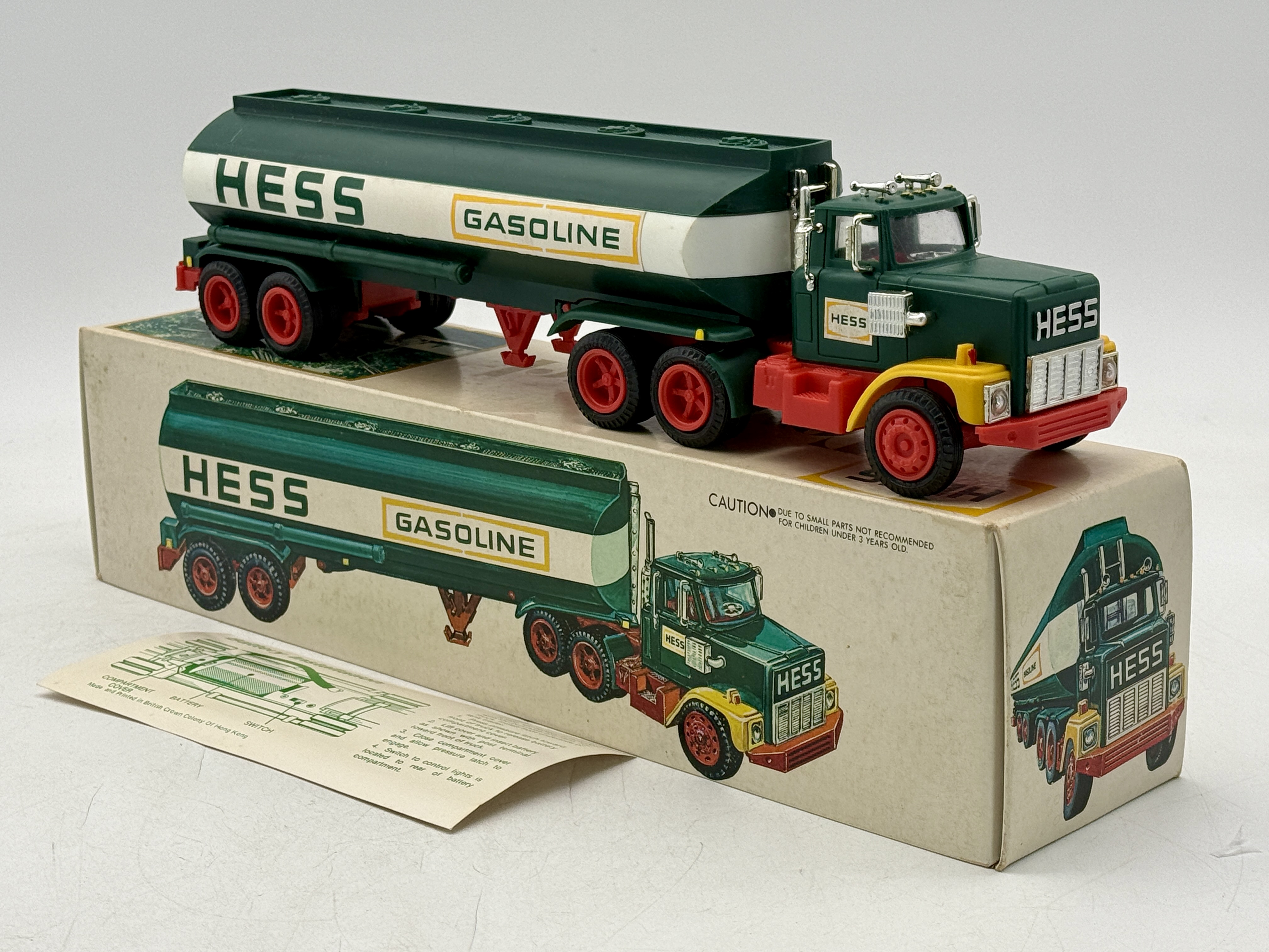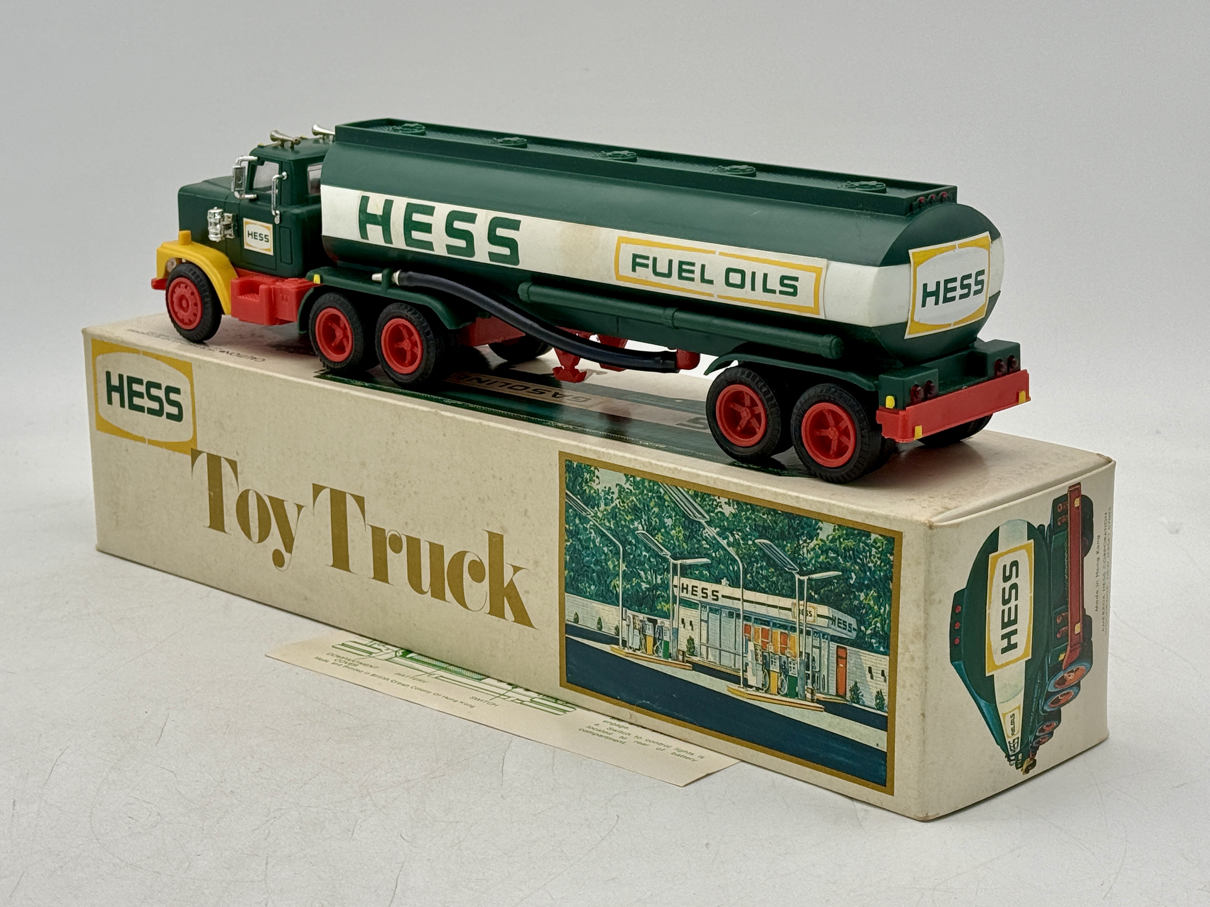 A green, white, yellow, and red Hess toy tanker truck with Gasoline and Fuel Oils branding, including its original box and instructional insert. Plastic 13 inches long original box and inserts C9