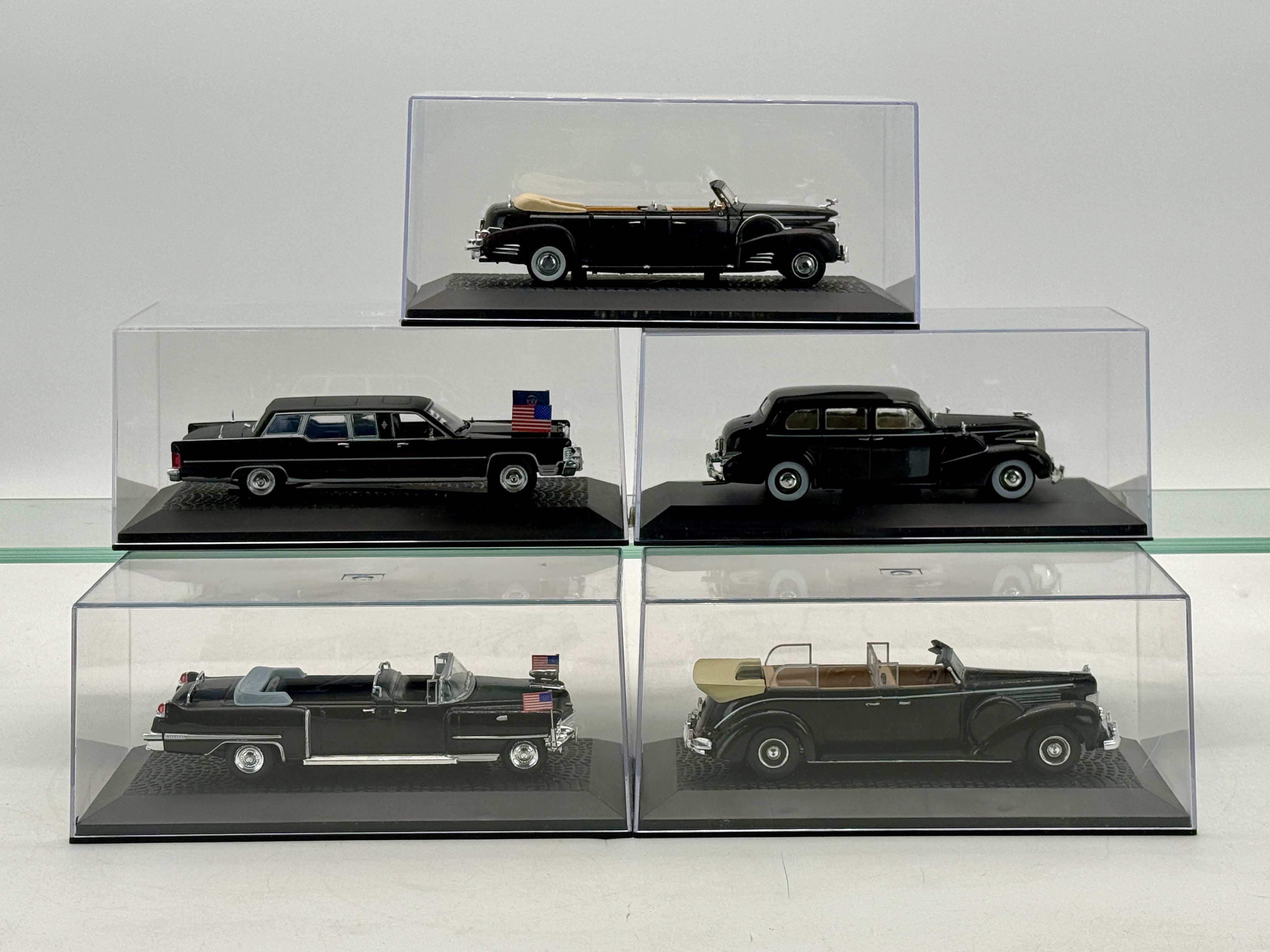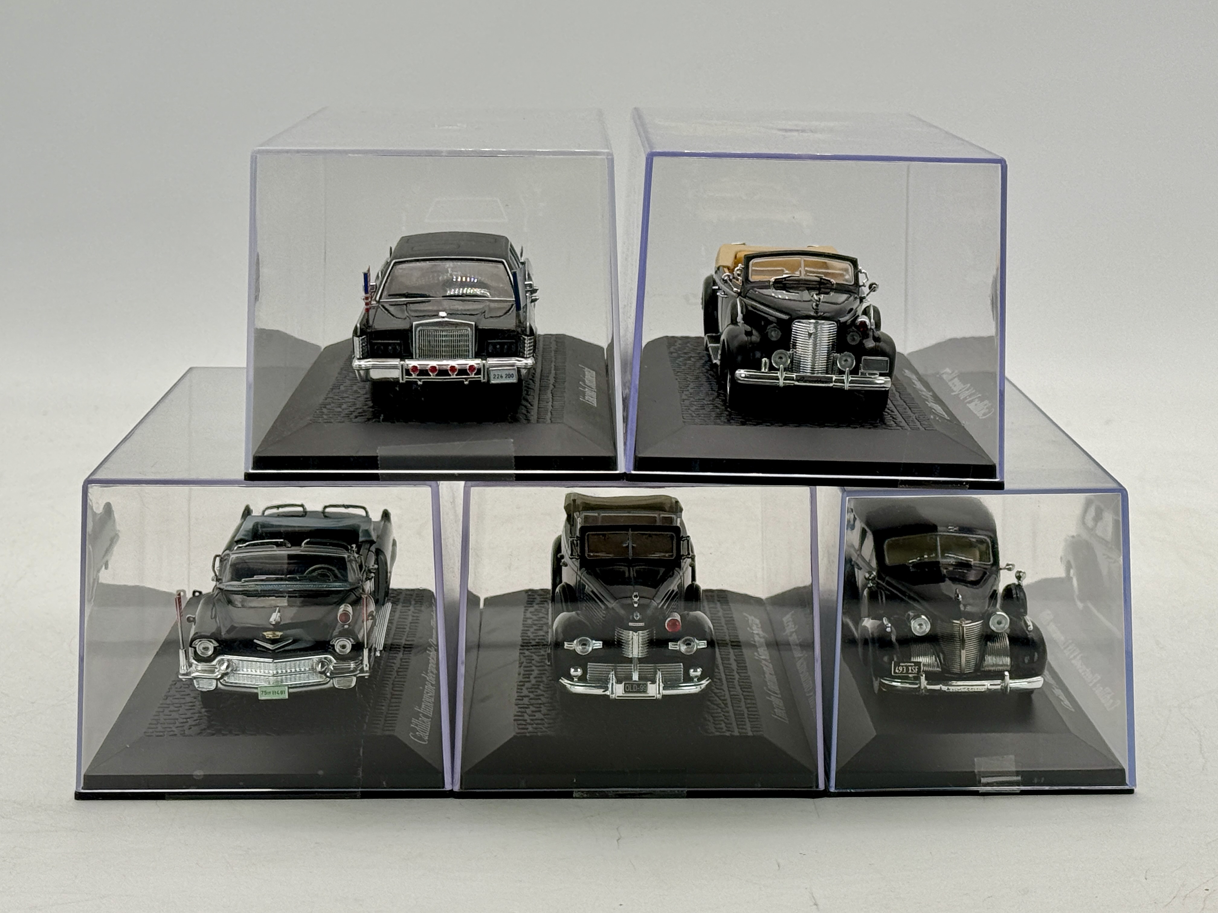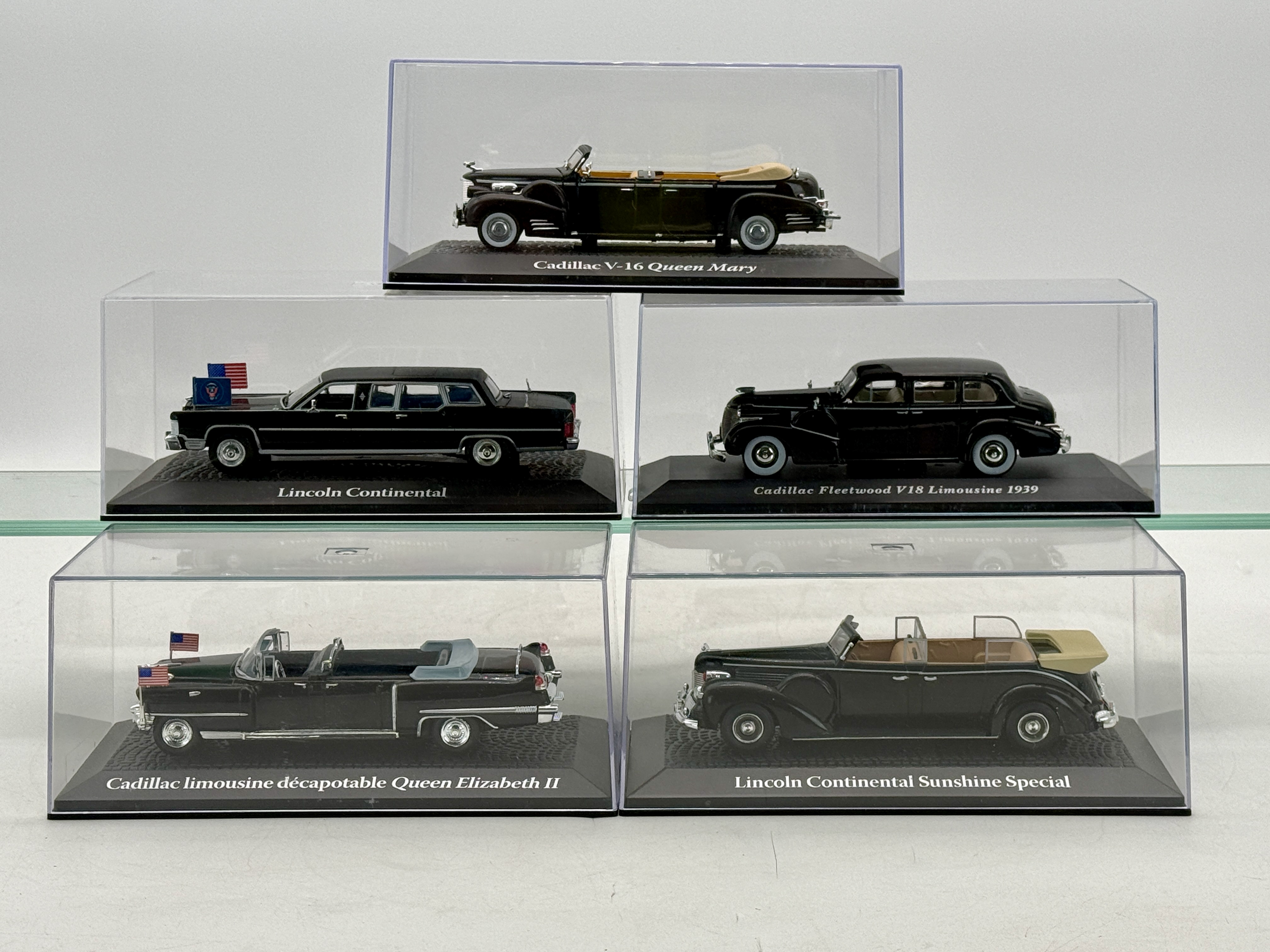A collection of IXO resin black model cars in clear display cases including a Cadillac V-16 Queen Mary, Lincoln Continental, Cadillac Fleetwood V18 Limousine 1939, Cadillac limousine décapotable Queen Elizabeth II, and a Lincoln Continental Sunshine Special. 1:43 scale, missing cardboard sleeves C9