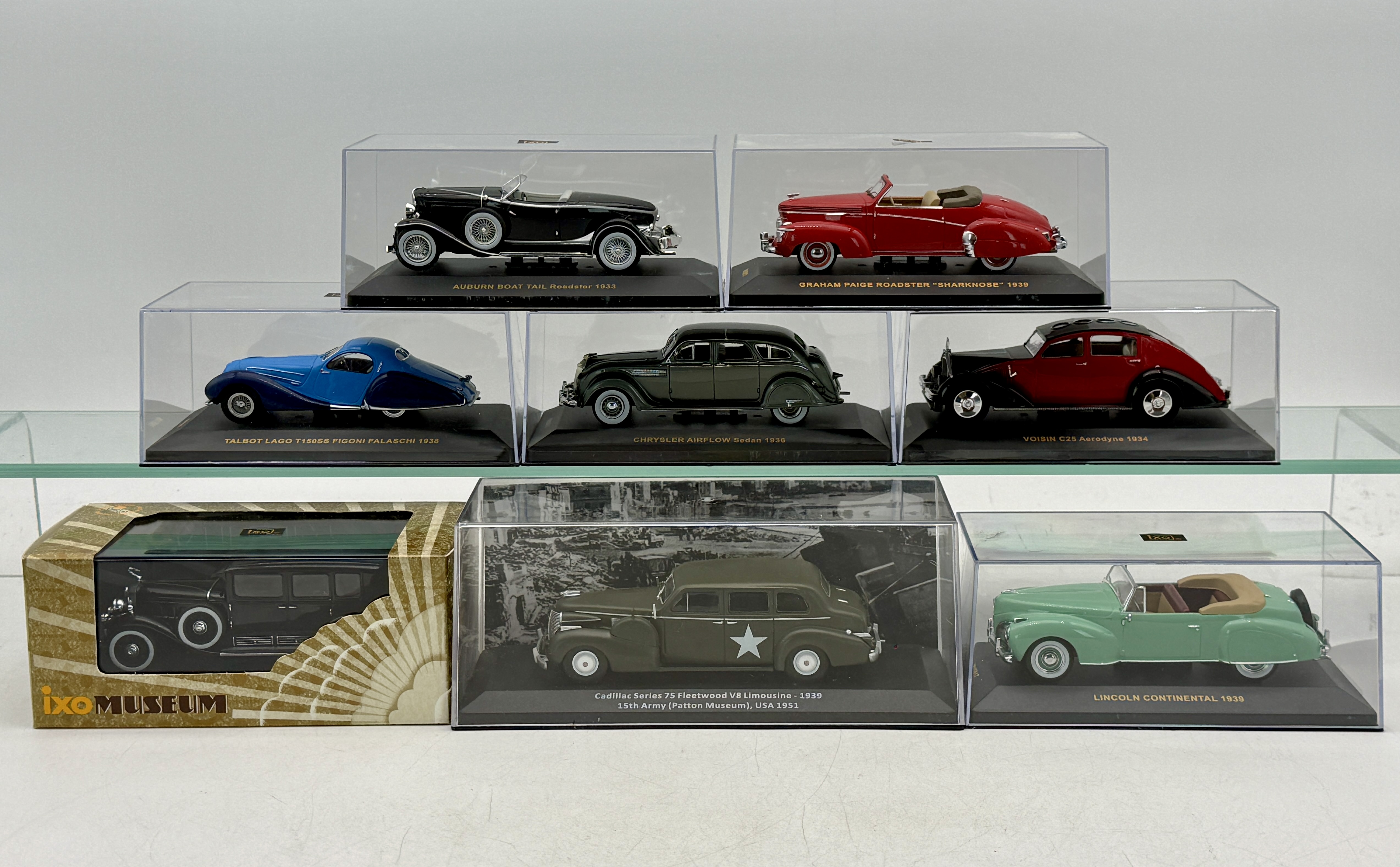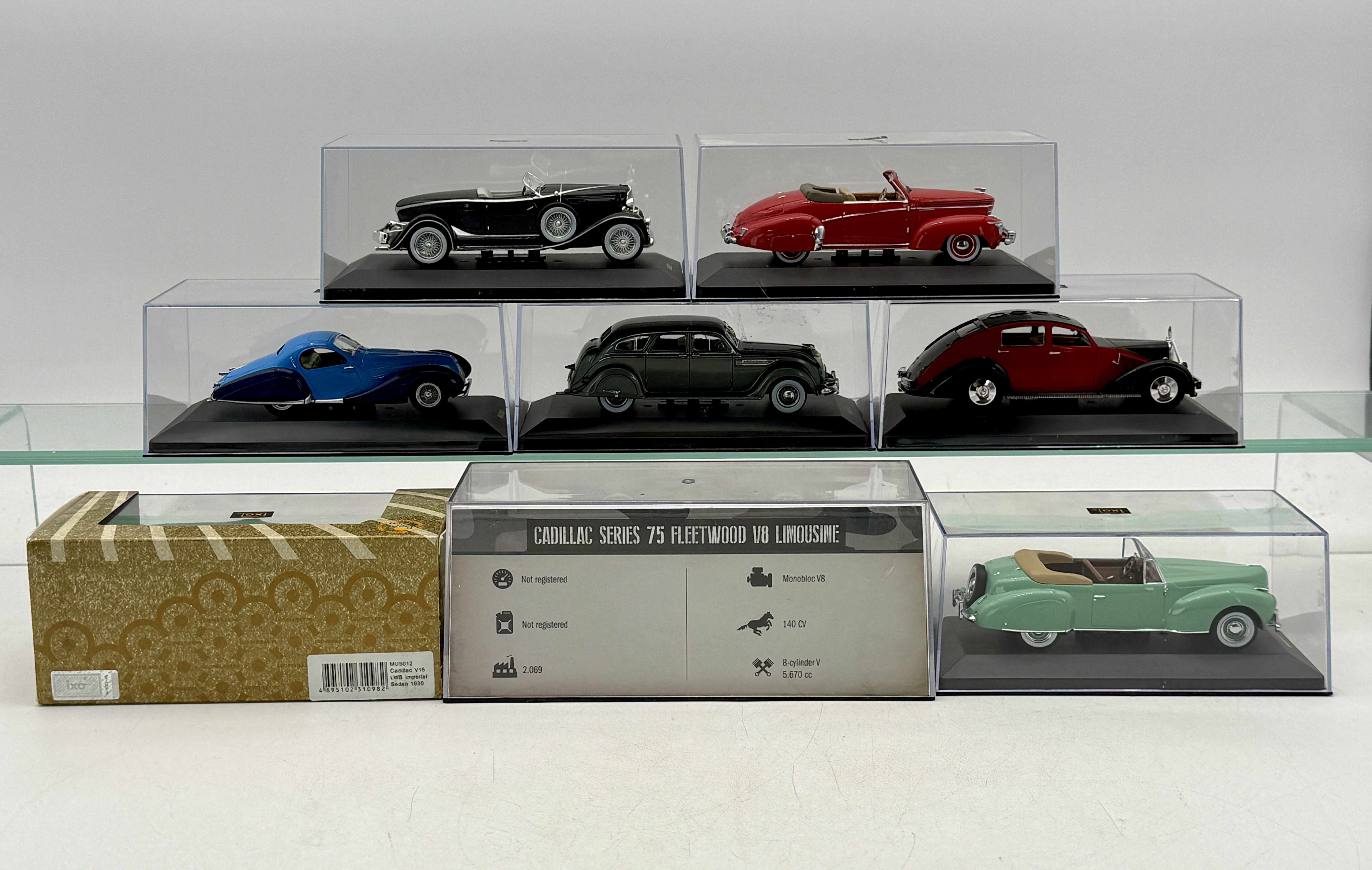 Resin, 1:43 scale, 1939 patent Cadillac, 1939 Lincoln, 1936 Chrysler, 1933 Auburn, 1939 Graham, 1938 Talbot Lago, 1934 Voisin, 1930 Al Capone Cadillac missing cardboard box sleeves, C8–9