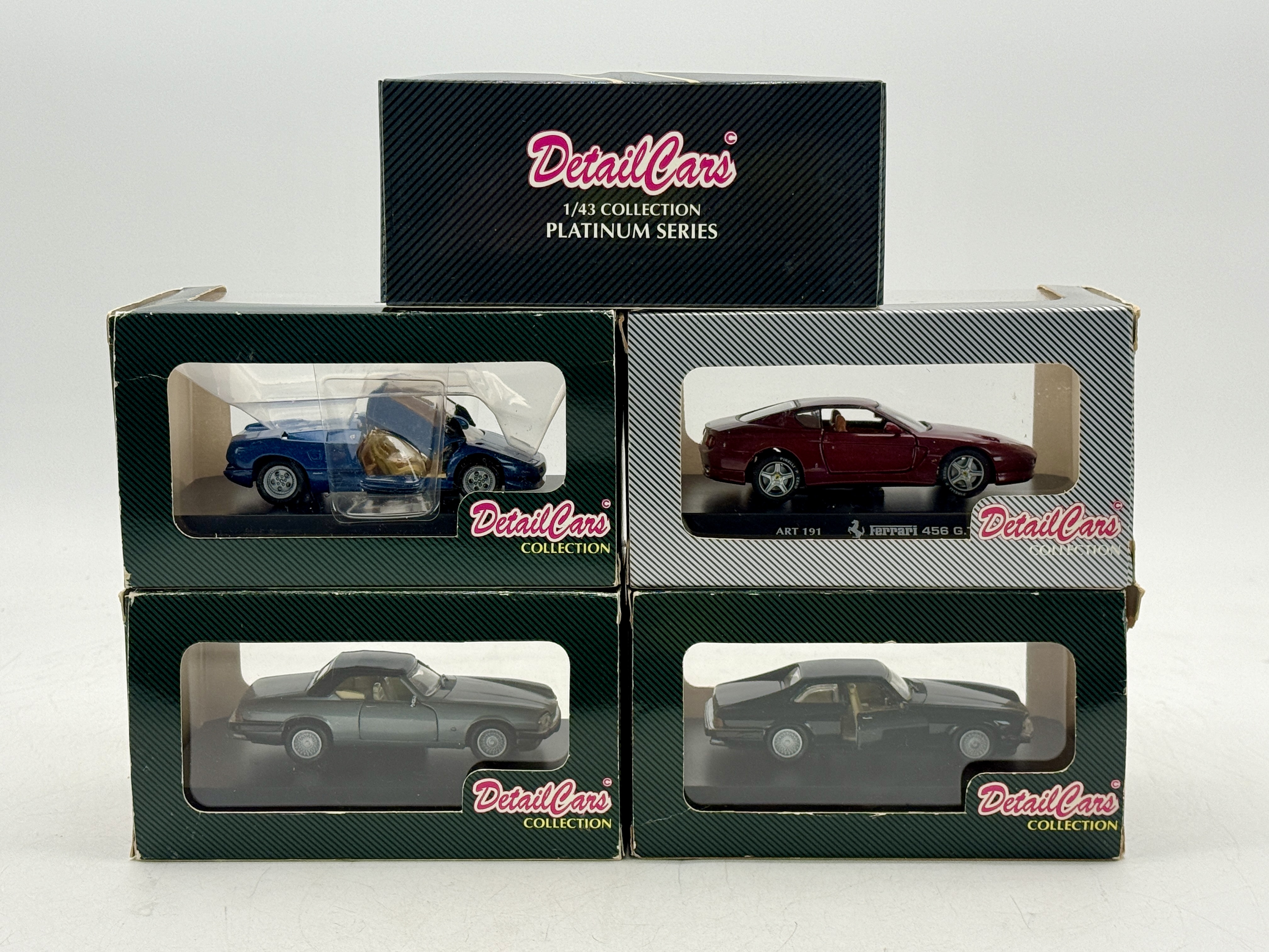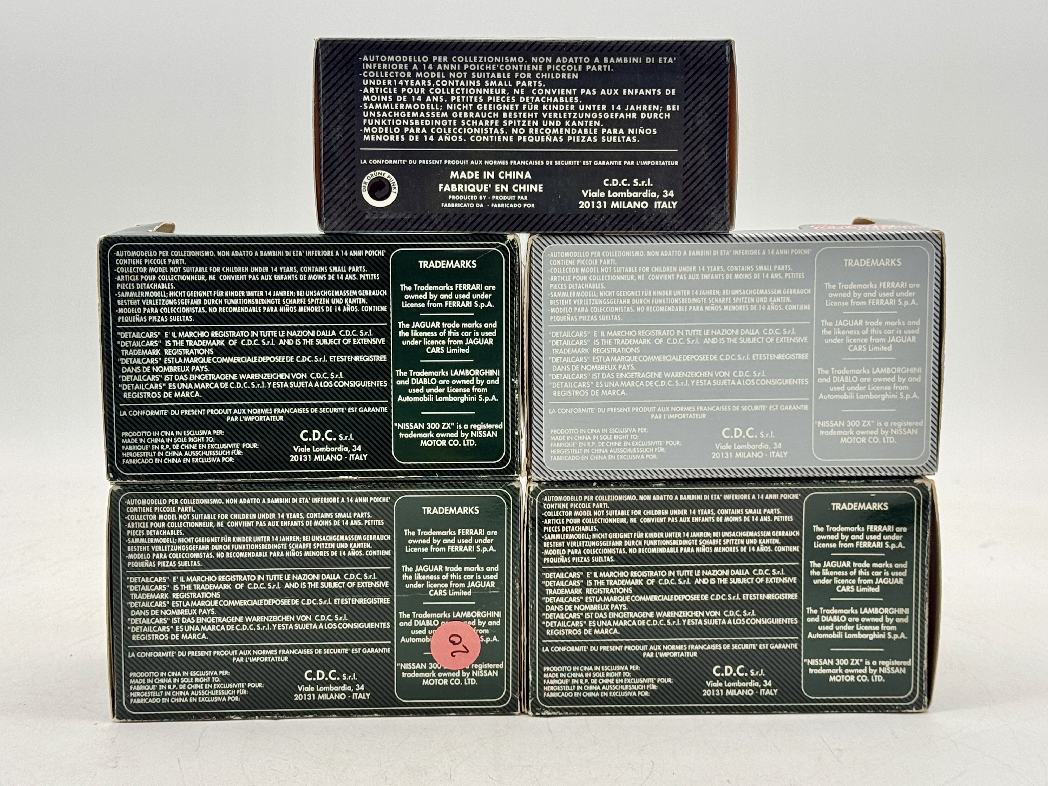 5 1:43 scale die-cast model cars from the Detail Cars Platinum and Collection series by C.D.C. S.r.l., including a 113 Lamborghini, 132 Jaguar, 191 Ferrari, 214 Ferrari OB’s and inserts mw C8-9
