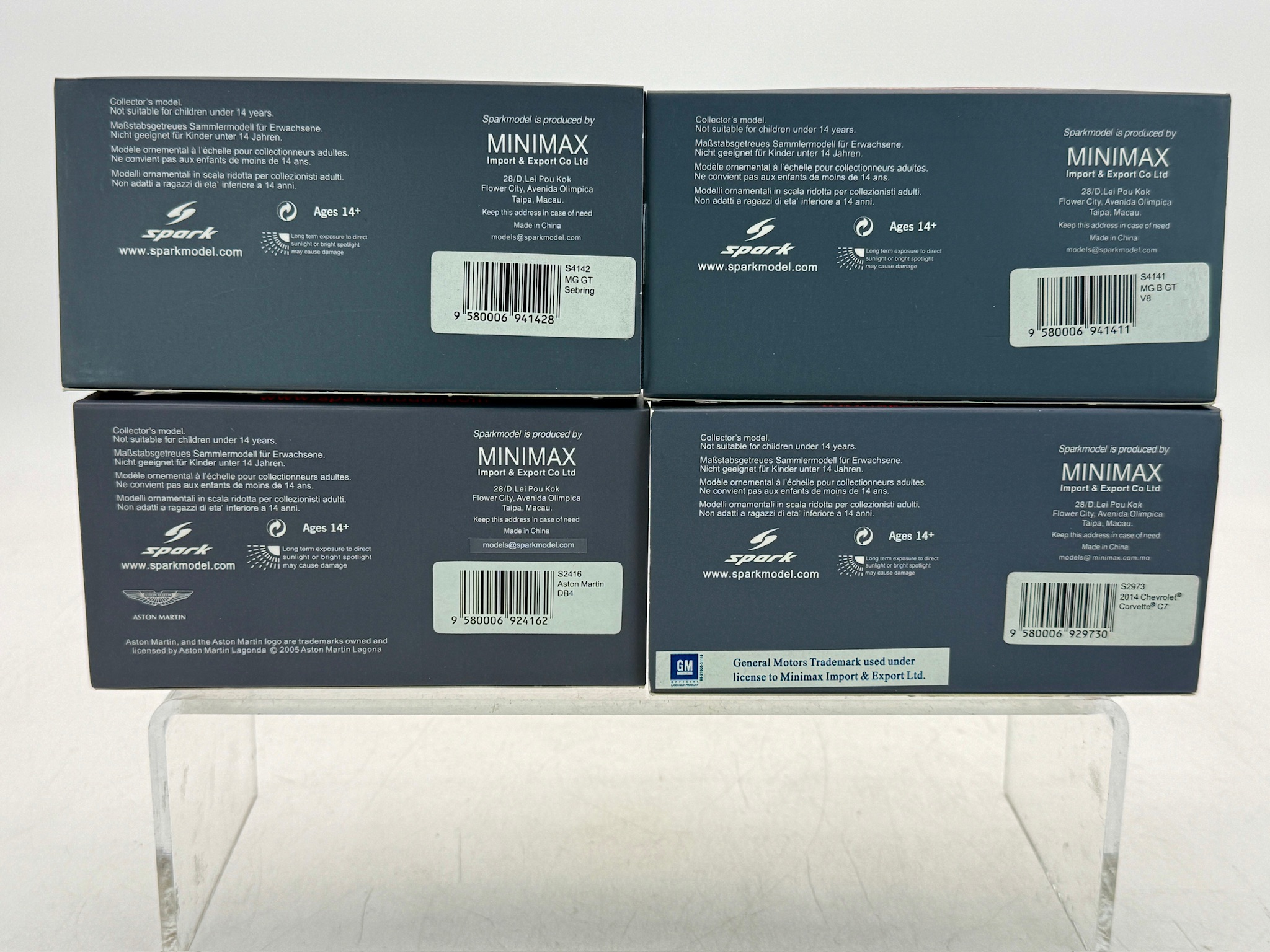 A collection of boxed resin 1:43 Spark model cars by Minimax including an MG GT Sebring 54141, MG B GT V8 54142, Aston Martin DB4 52416, and a 2014 Chevrolet Corvette 52973. Plastic OB, and sleeve, C9.