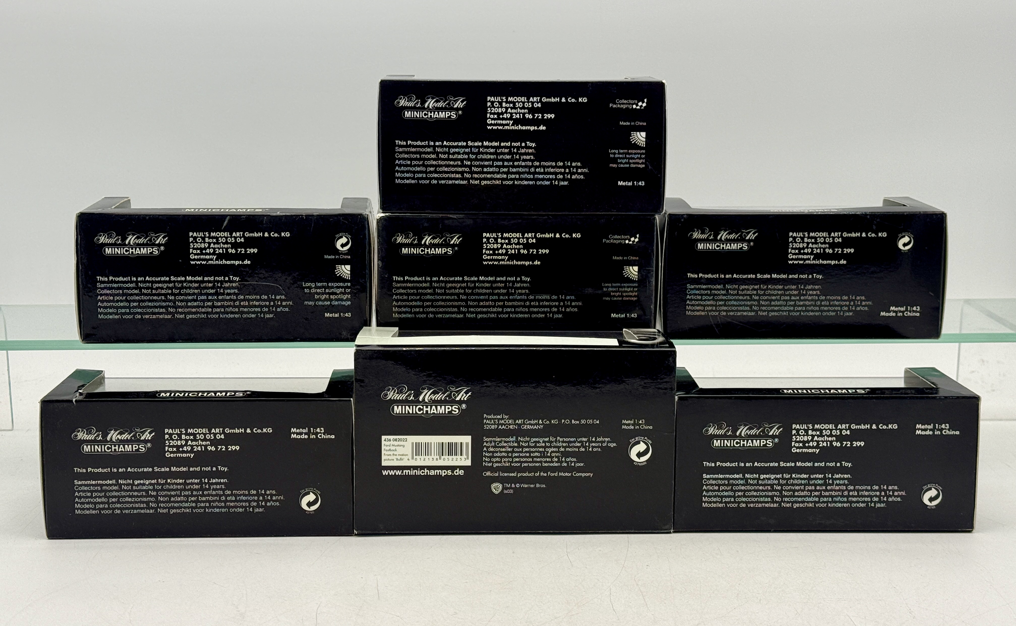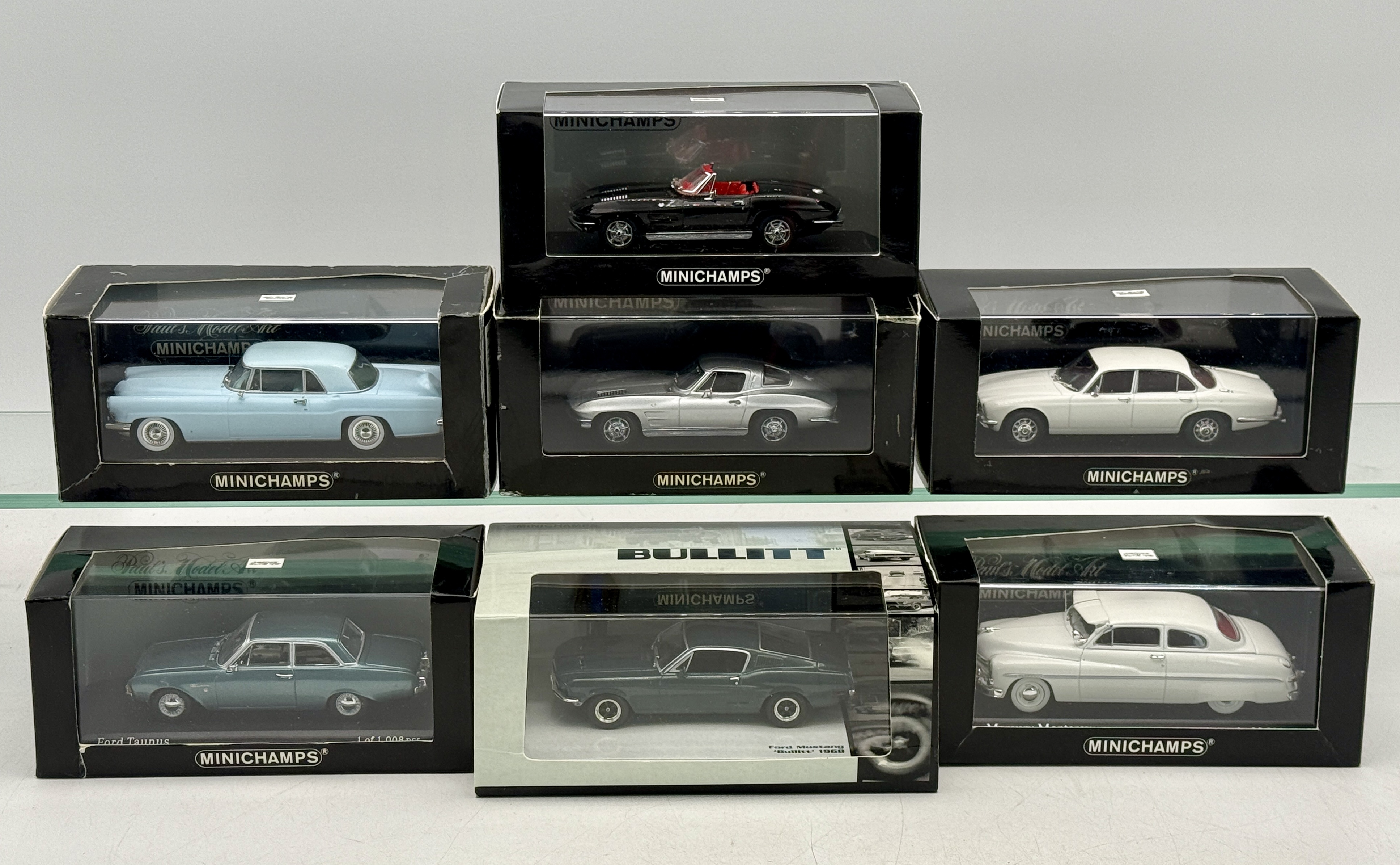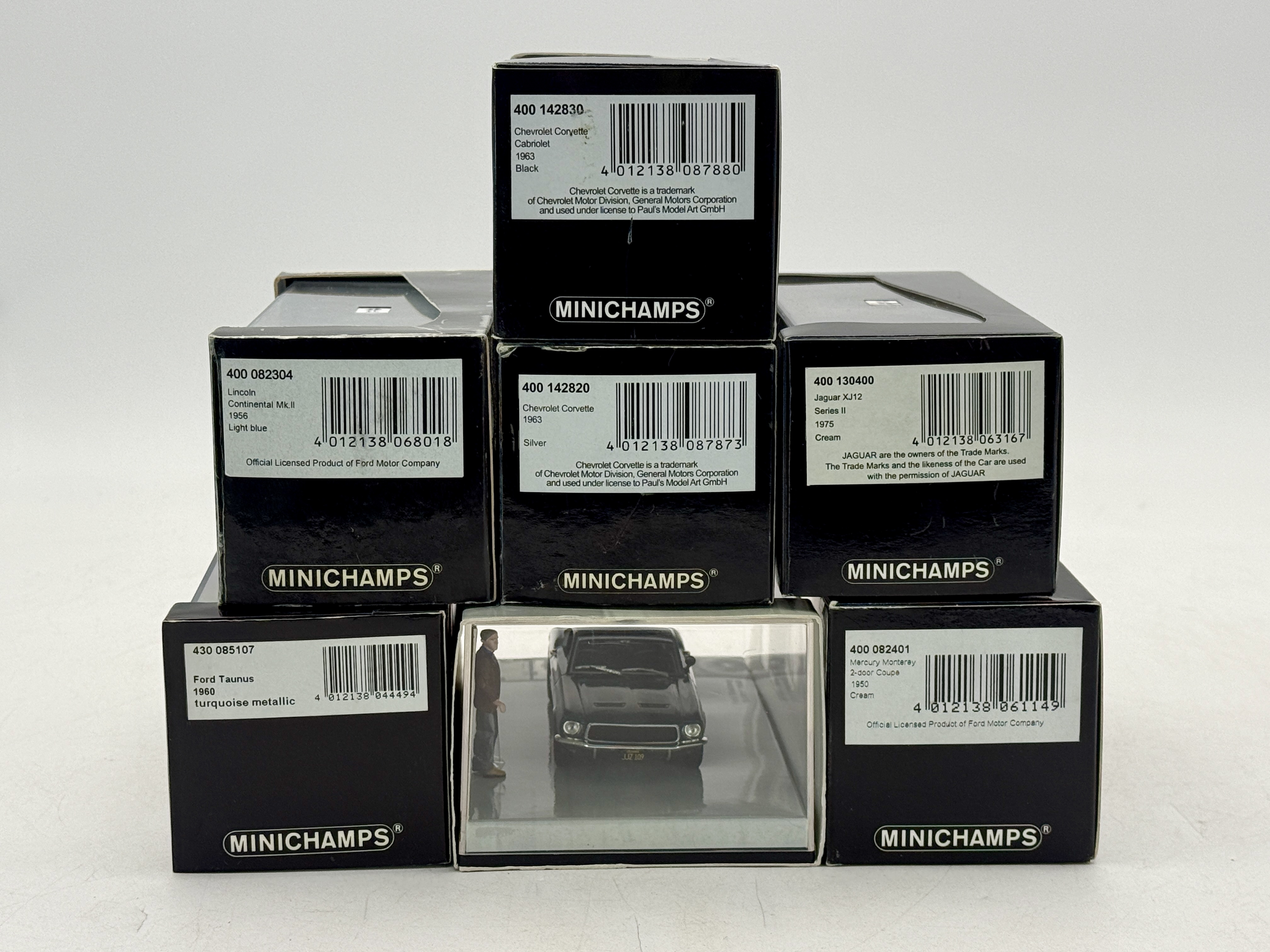 A collection of seven 1:43 scale resin model cars by Paul’s Model Art Minichamps, including a 436-082022 Bullit Mustang, 430–085107 1964 taunus, 400–082 401 1950 Mercury, 400–082304 1956 Lincoln, 400–142820 1963 Corvette, 400–130400 1975 Jaguar, 400–142830 1963 Corvette, OB’s and inserts mw C9