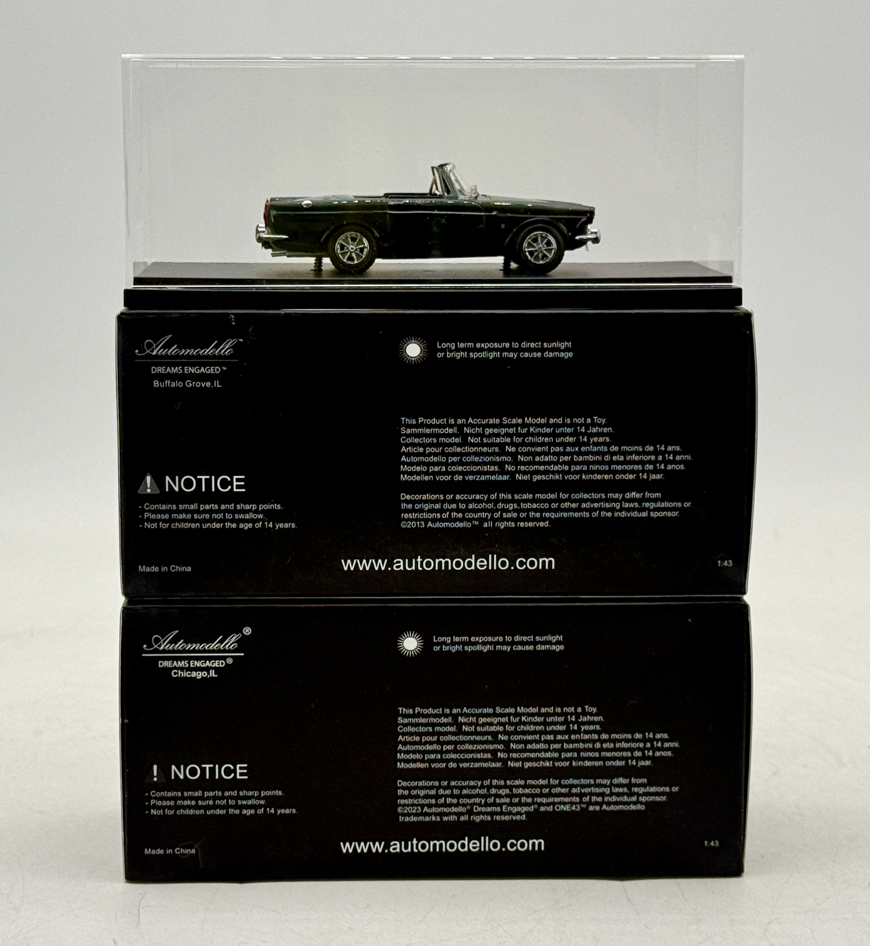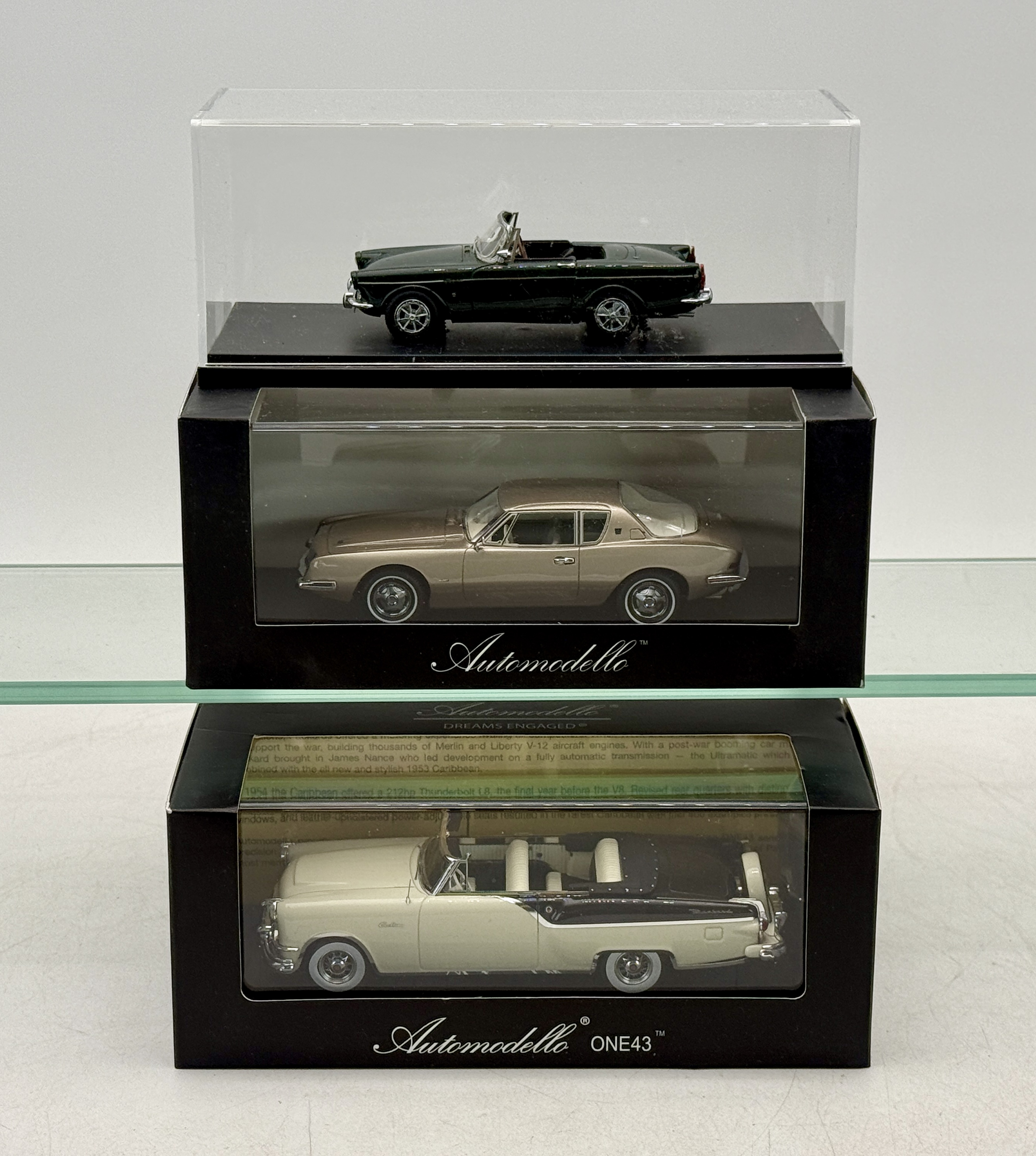 Three 1:43 scale model resin cars by Automodello including: 1963 Studebaker Avanti, 43P 10019 54 Packard Caribbean, Sunbeam tiger, OB’s missing 1 sleeve C8-9