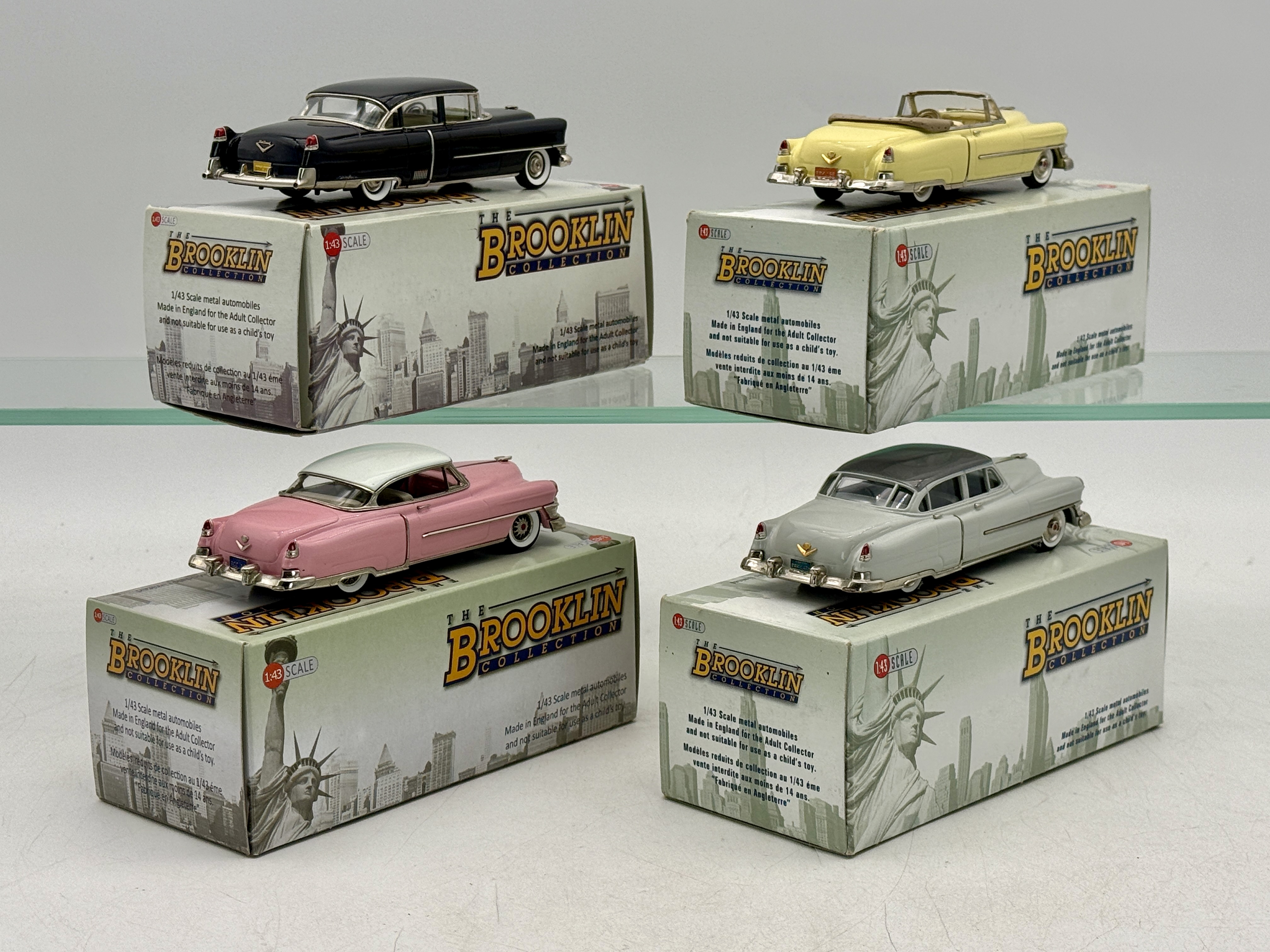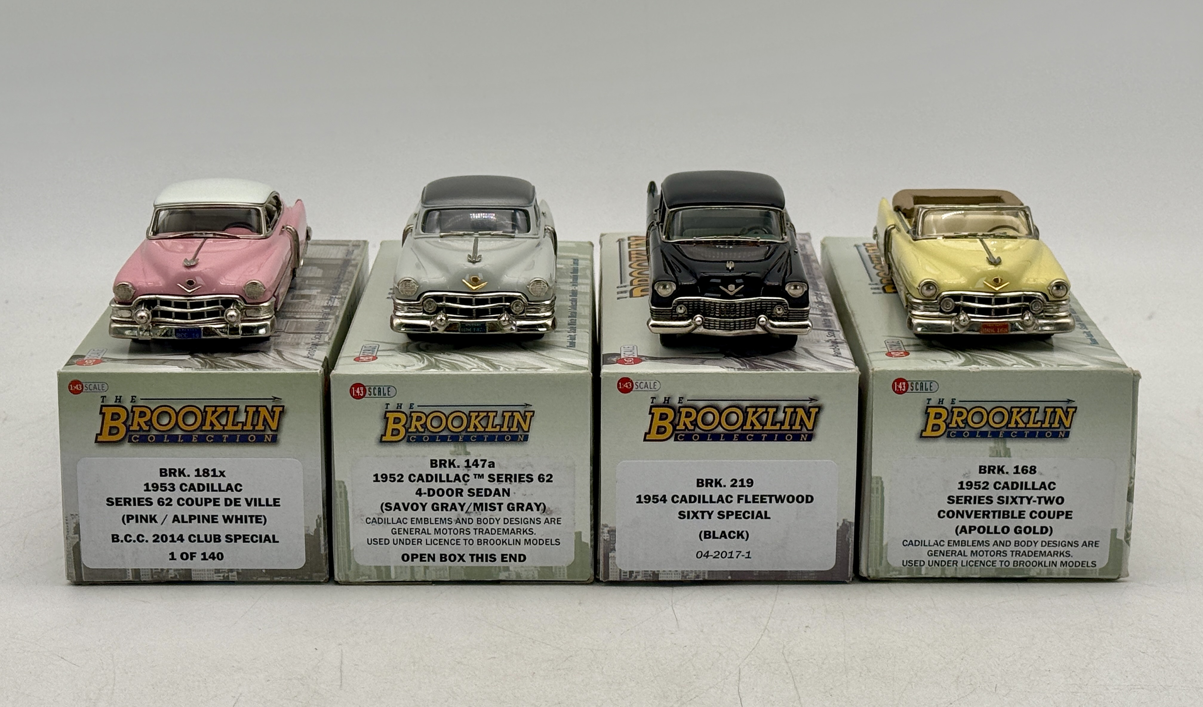 Four 1:43 scale die-cast Cadillac models including: BRK 147A 1952 Cadillac, BRK219 1954 Cadillac, BRK168 1952 Cadillac, BRK181X 1953 Cadillac OB’s and inserts C9