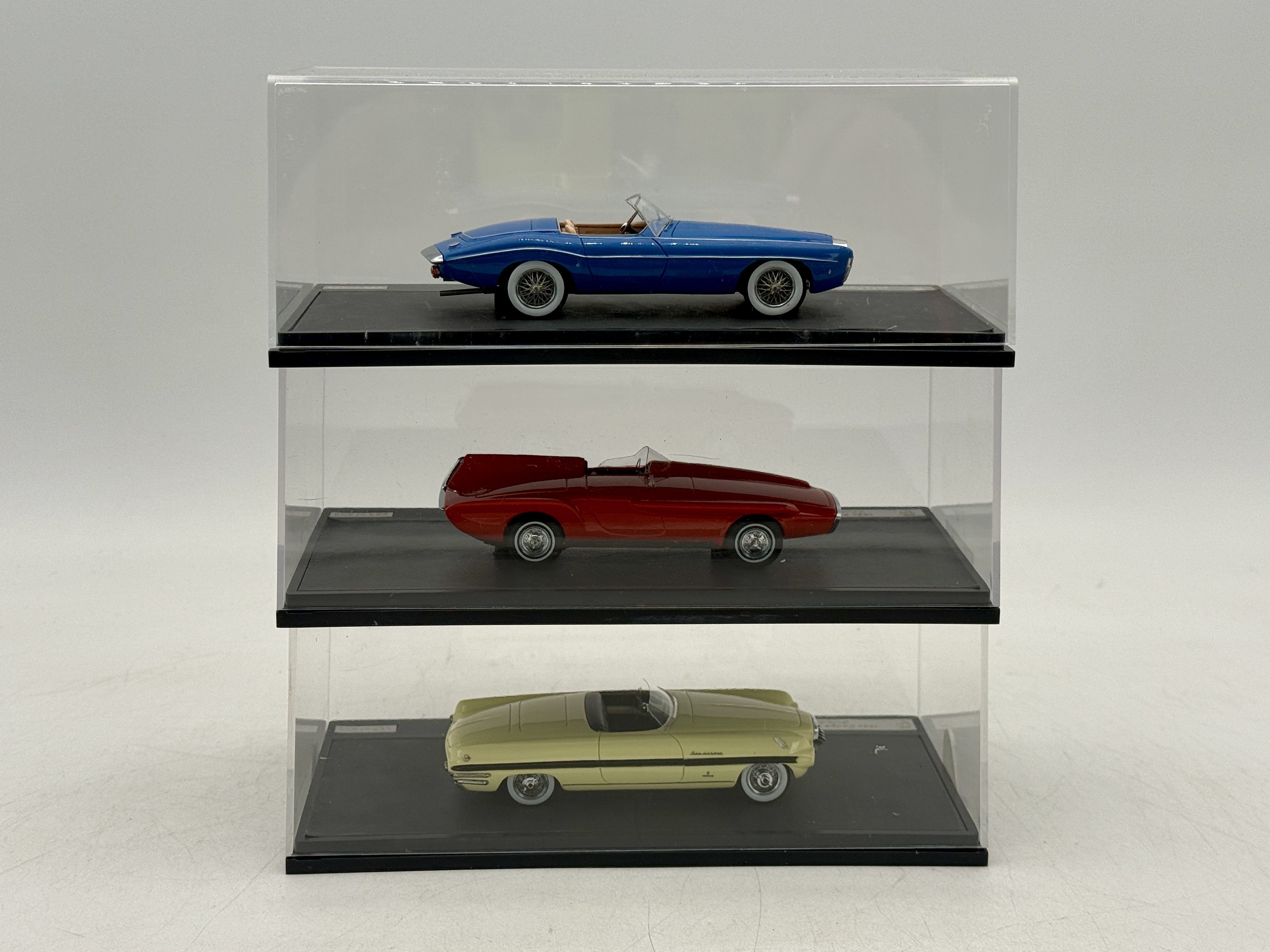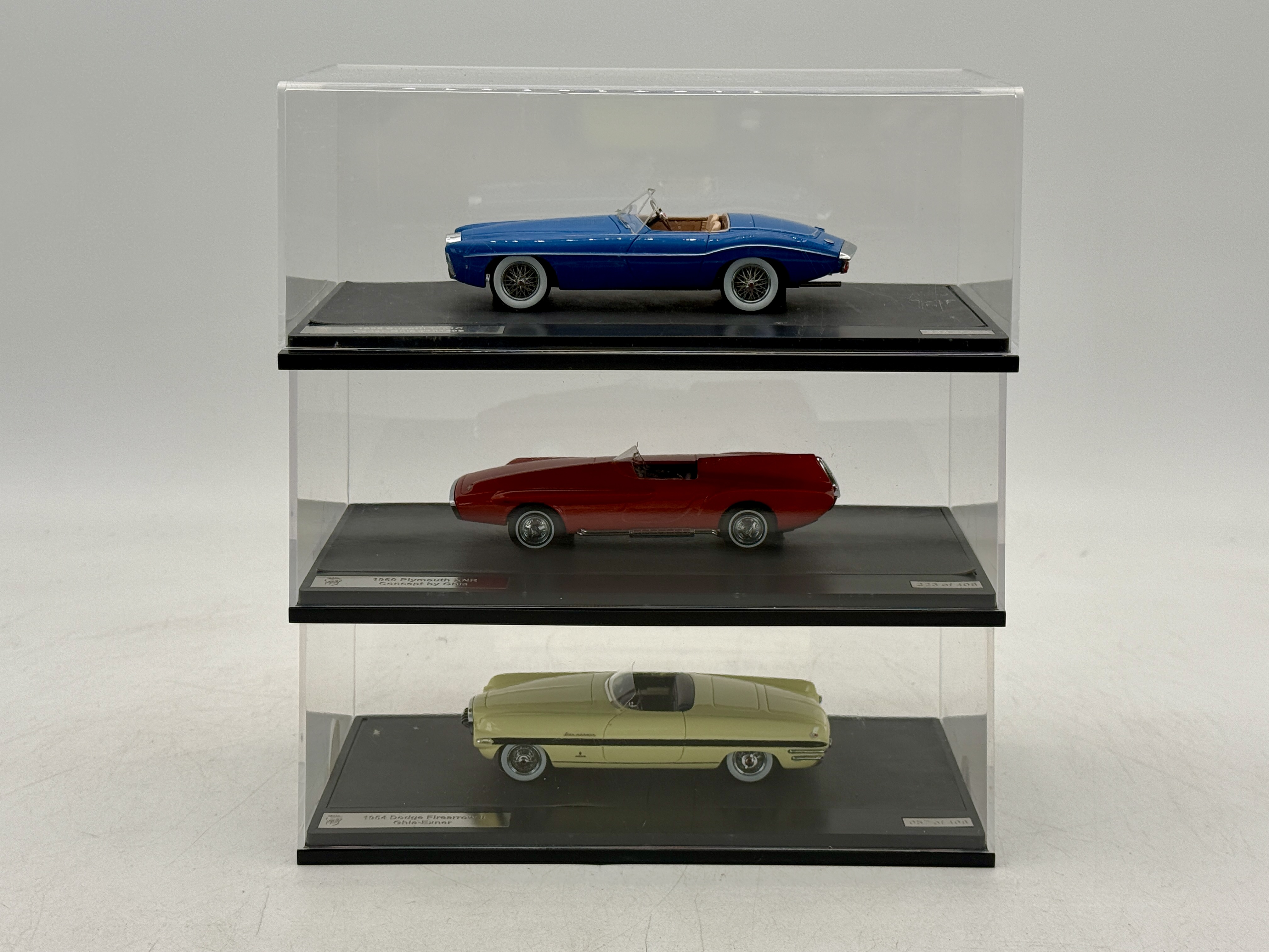 3 scale resin model concept cars including a blue 1966 Bugatti T101C #334 of 408, a red 1960 Plymouth XNR #233 of 408, and a pale yellow 1954 Dodge Firearrow II #57 of 408, each housed in individual acrylic display cases with identifying labels. OB’s missing cardboard, C9.