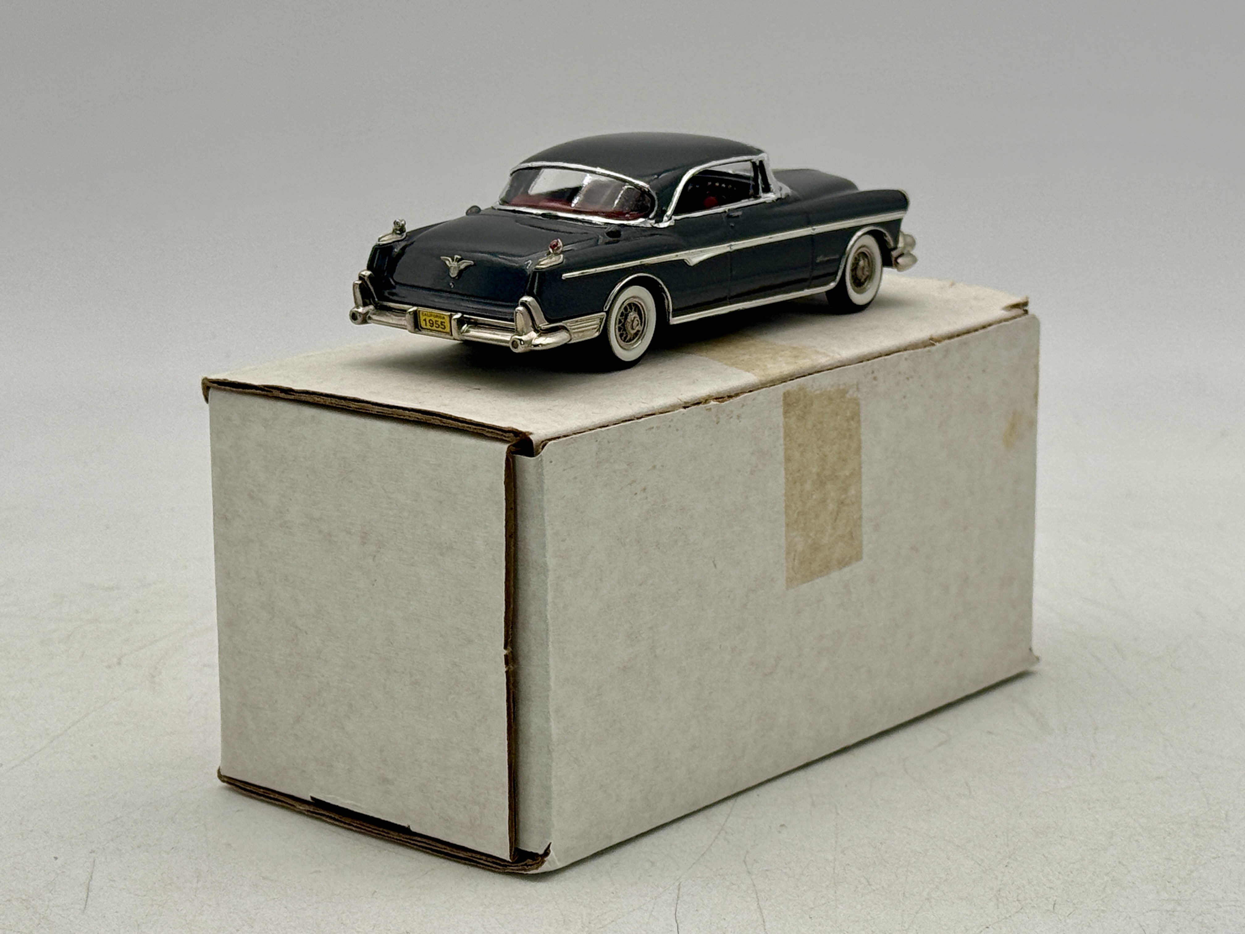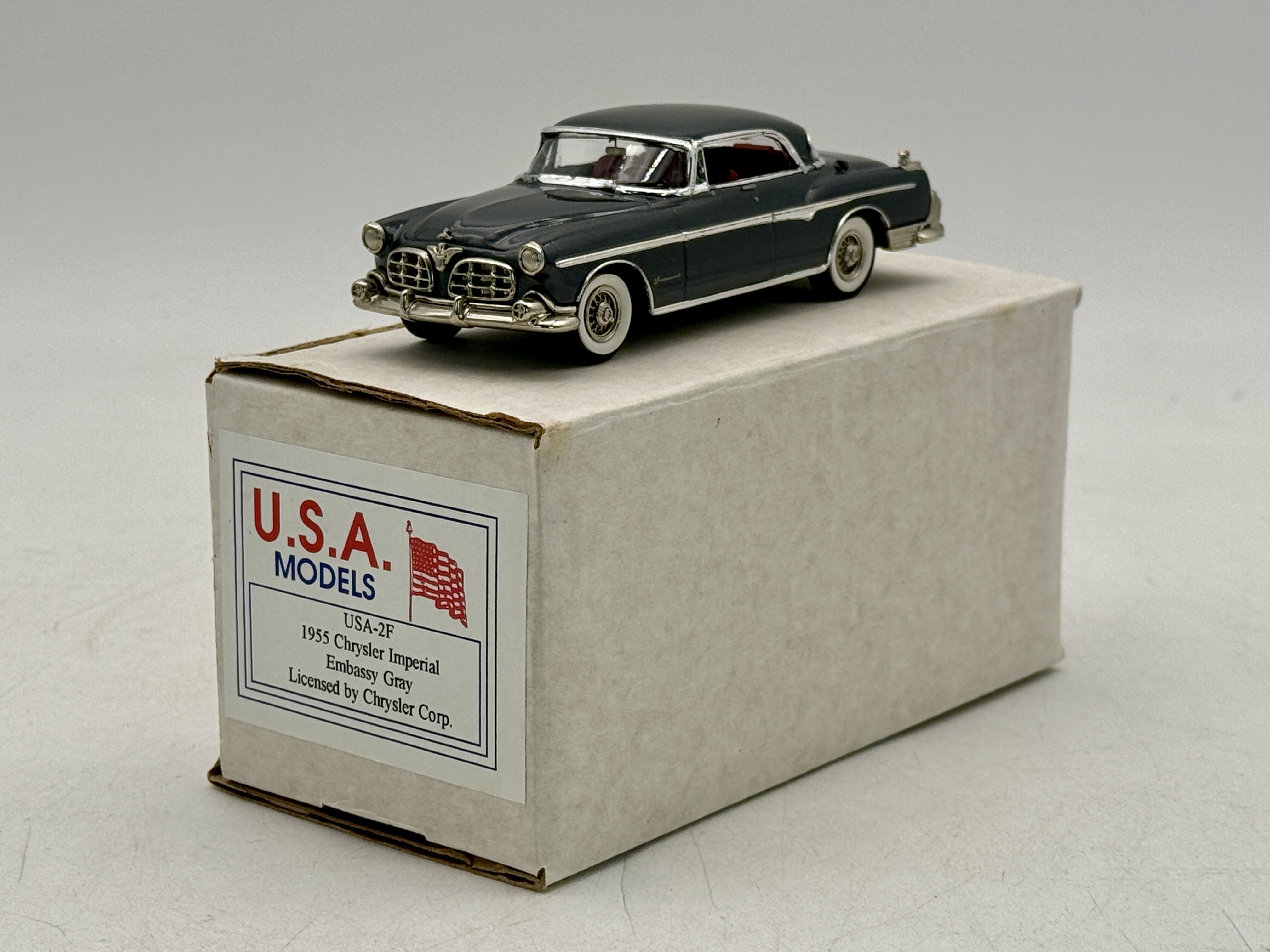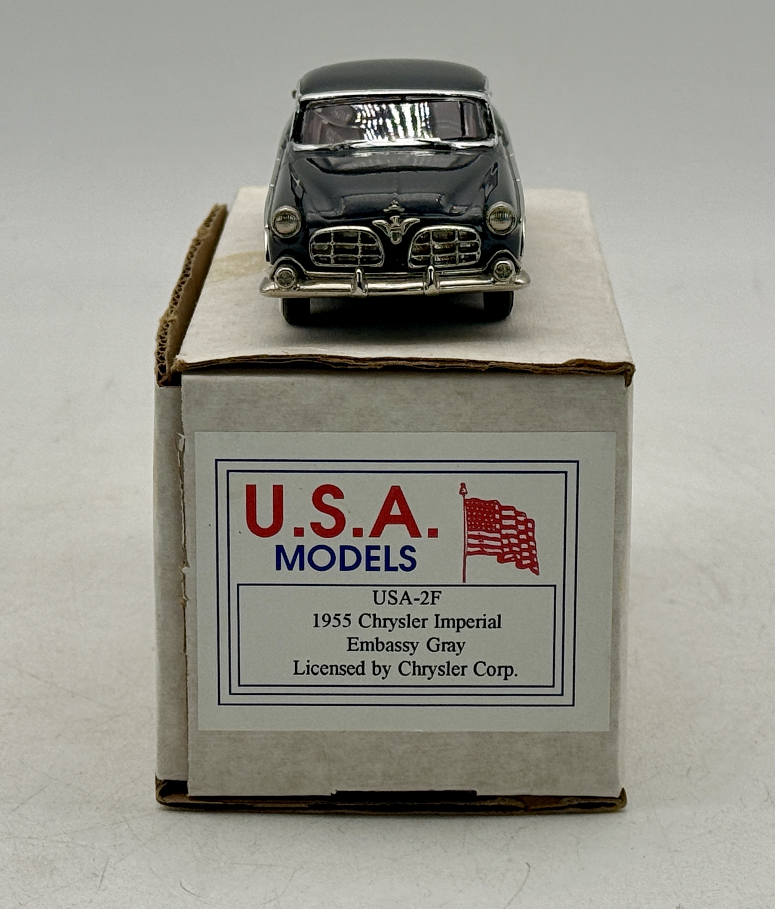A scale model 1955 Chrysler Imperial finished in Embassy Gray with chrome-style trim, whitewall tires, and its original U.S.A. Models box. 1:43 scale, OB C9