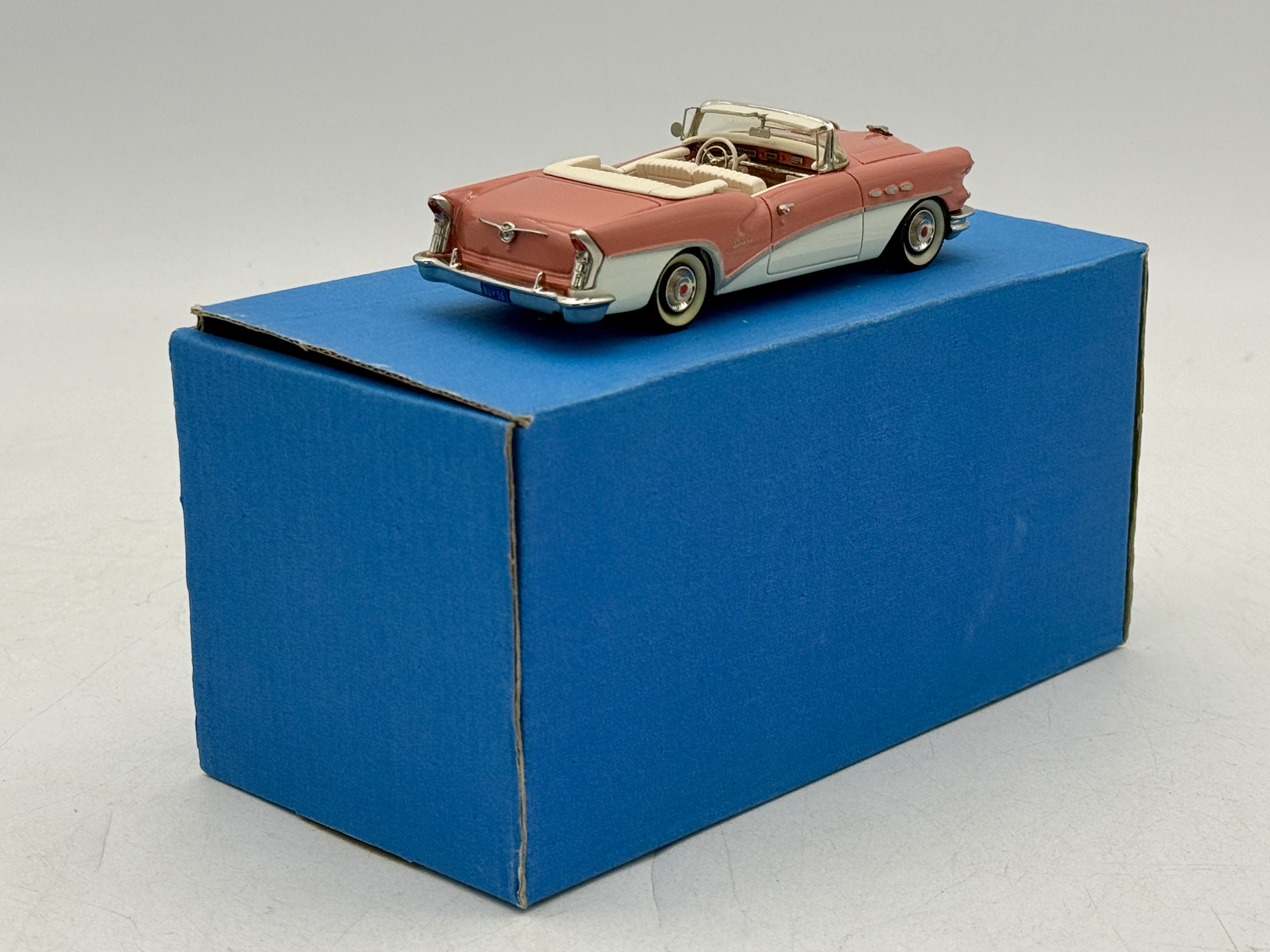 A 1:43 scale white metal model of a 1956 Buick Special convertible finished in Tahiti coral and Dover white, including its original blue box. OB C9