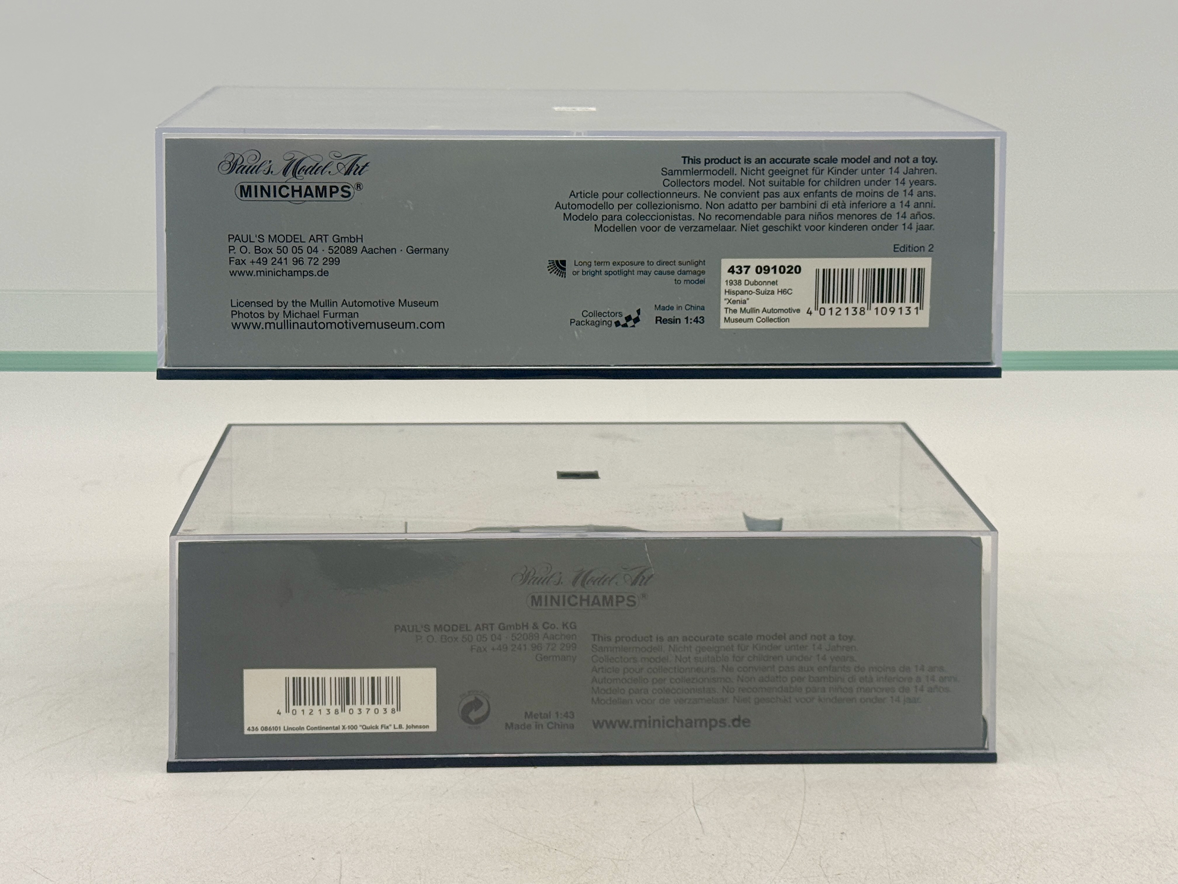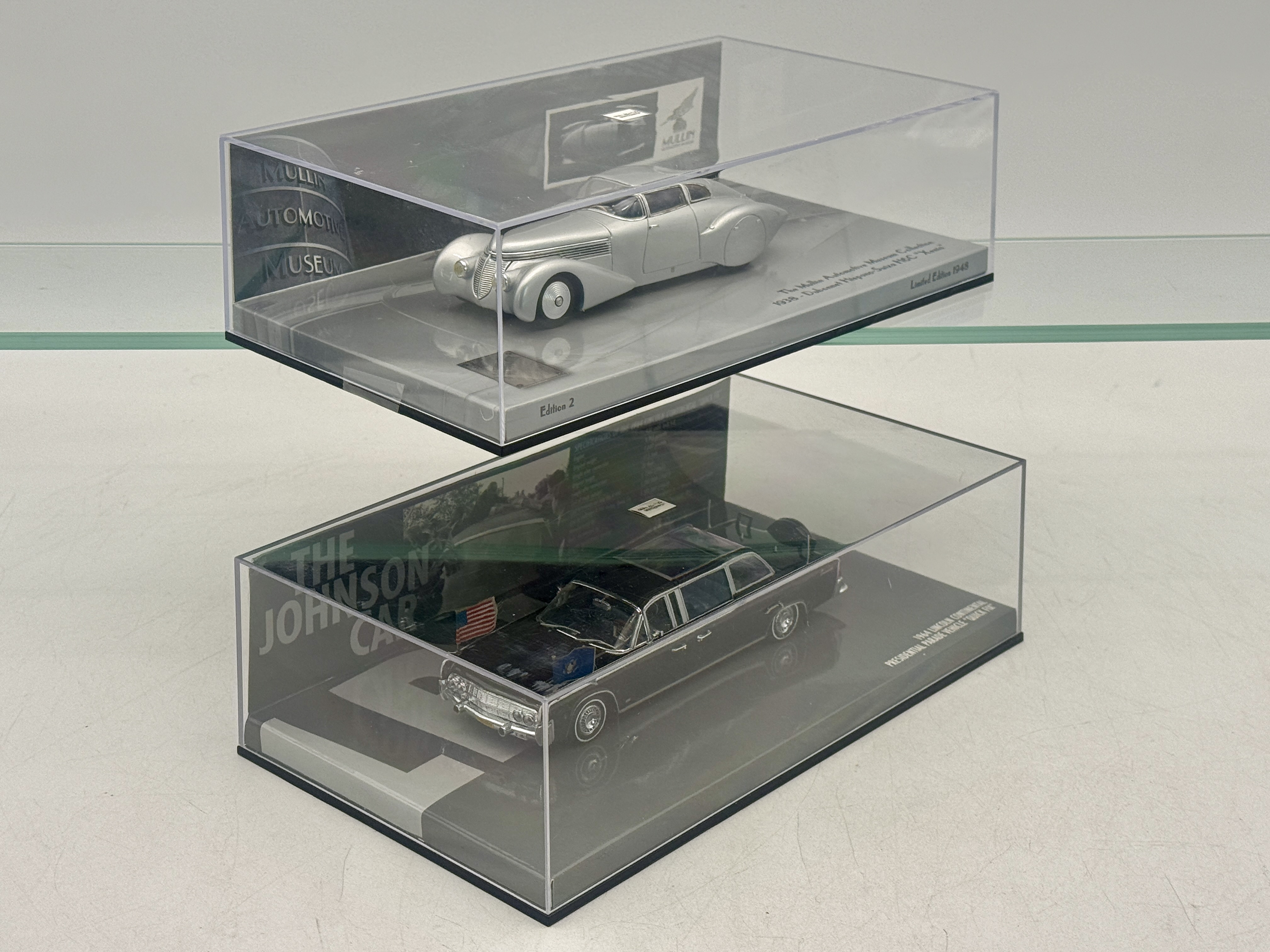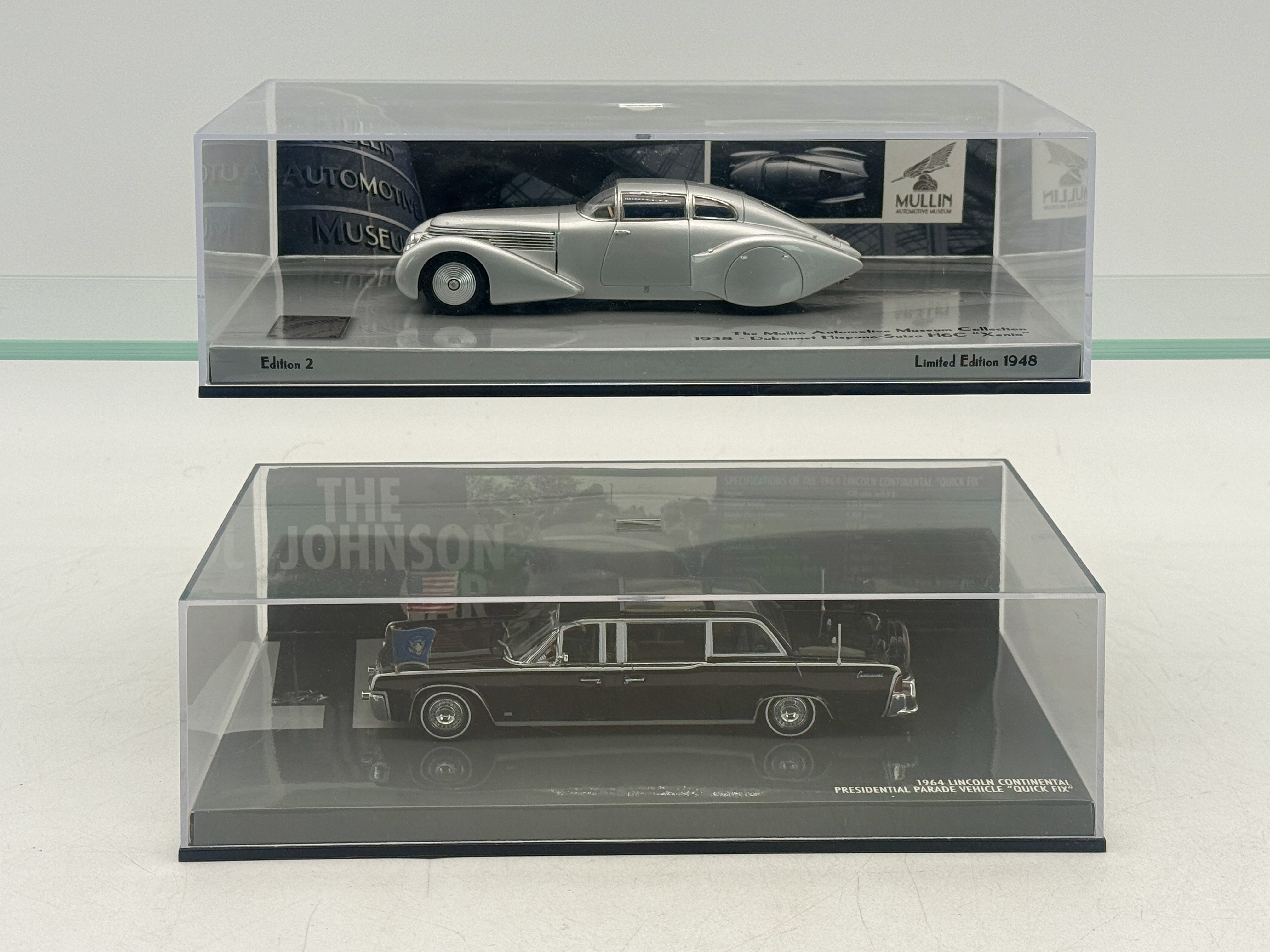 2 1:43 scale model cars including a 1938 Dubonnet Hispano-Suiza H6C Xenia 437-091020 and a 1964 Lincoln Continental Presidential Parade Vehicle Quick Fix 436-086101 in display cases. OB’s C9