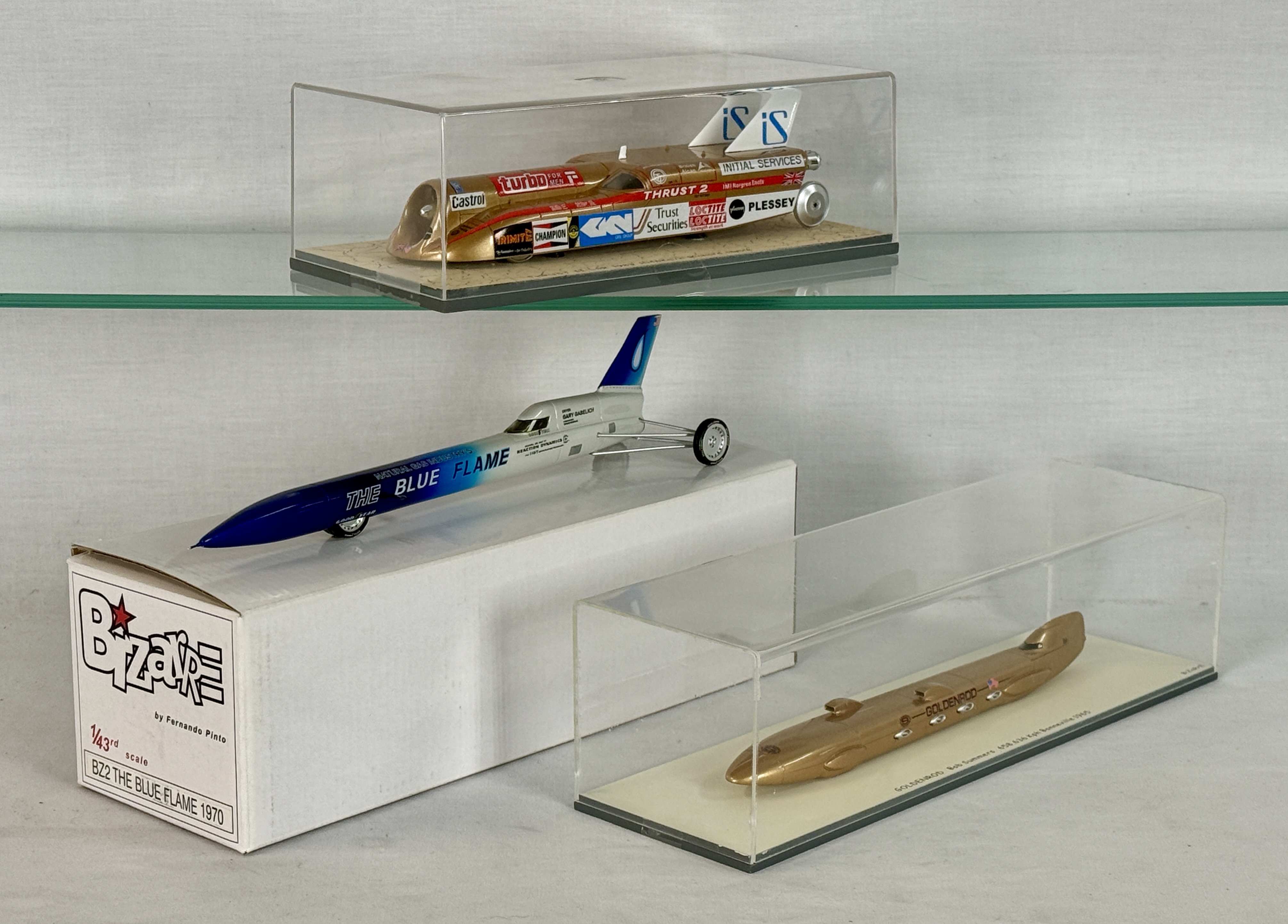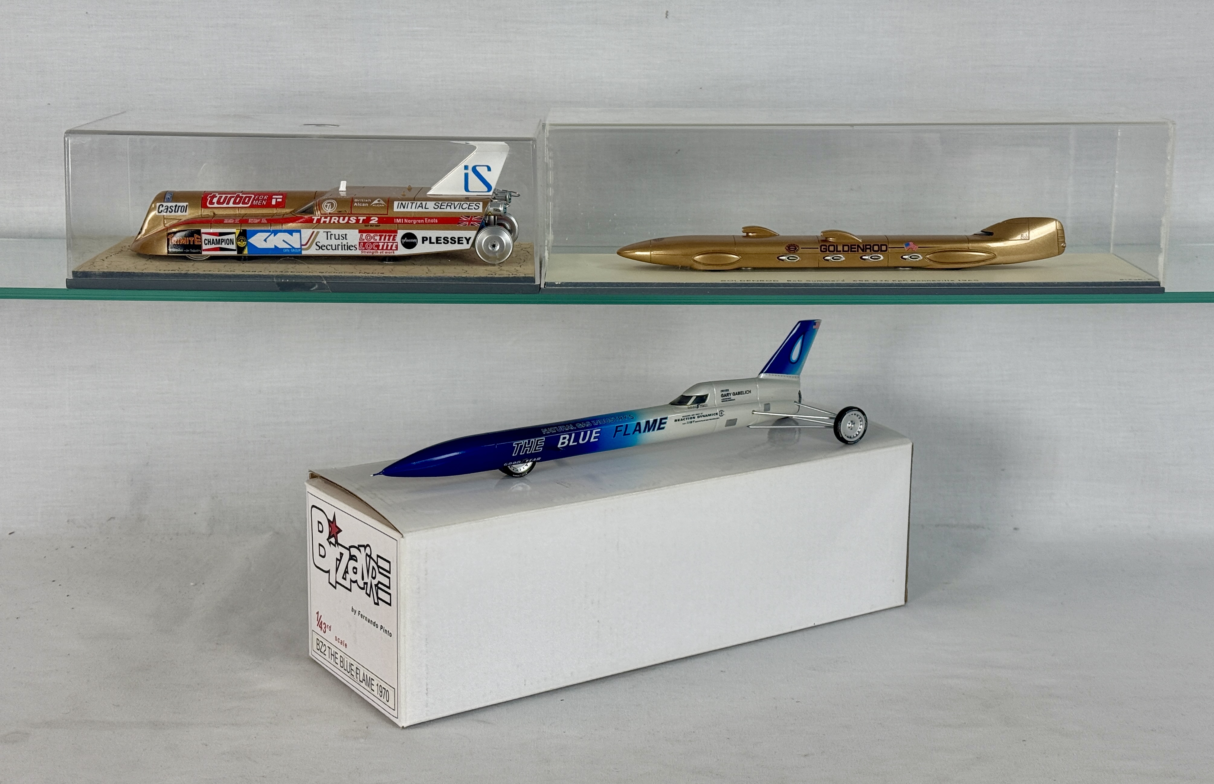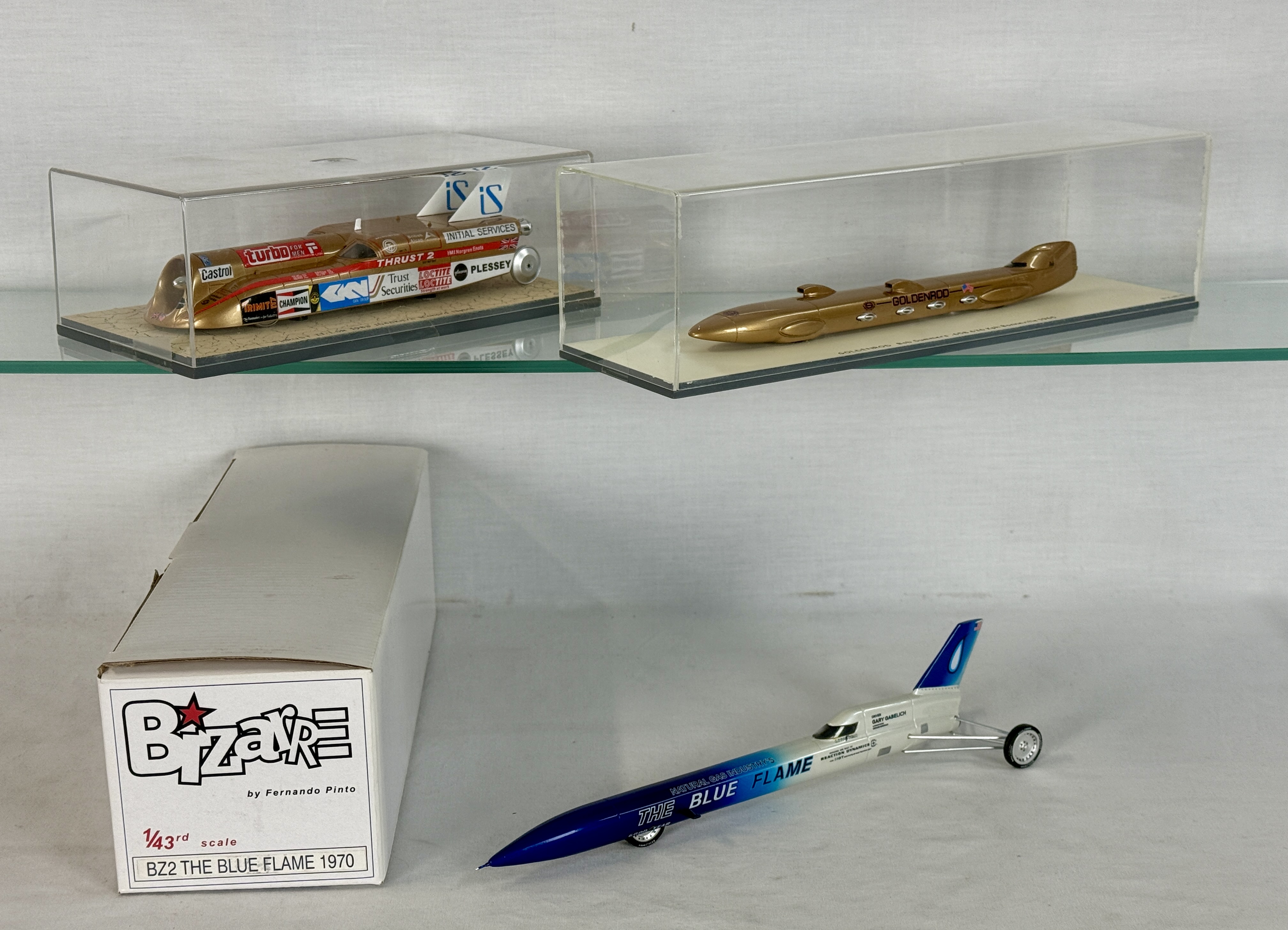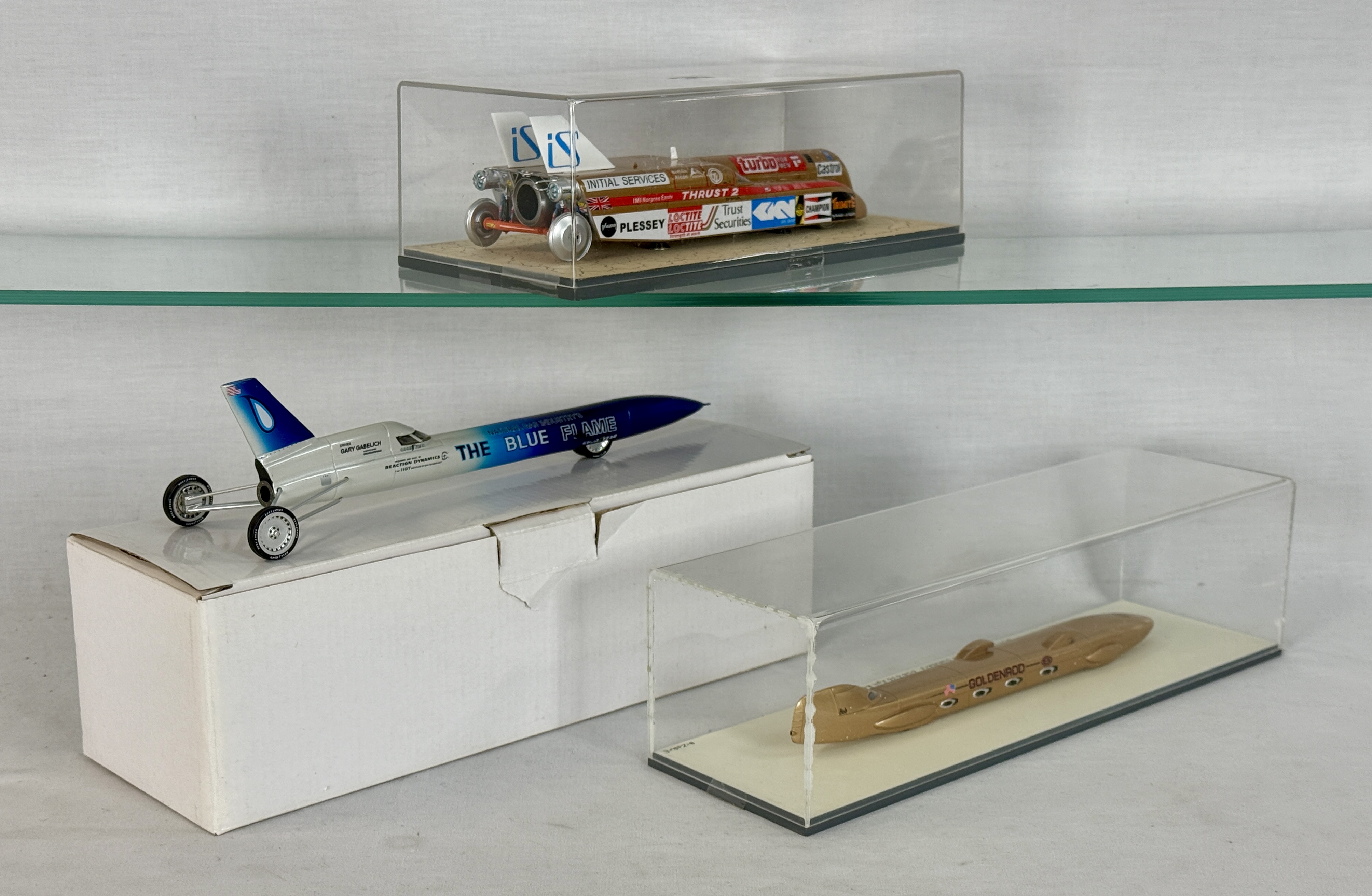 3 1/43 scale model land speed record cars including the 1965 Goldenrod and Thrust 2 in clear display cases with one Bizarre 1970 "the Blue Flame" w/ OB.
