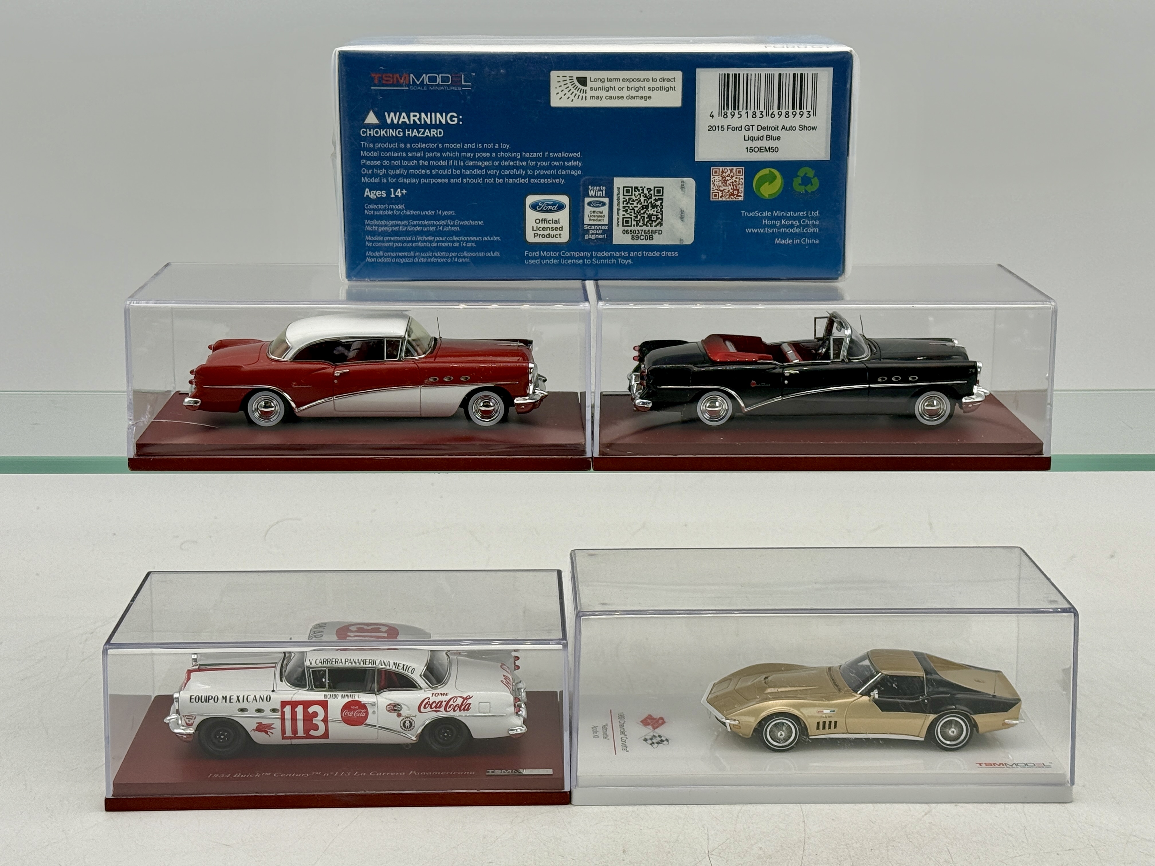A collection of resin model cars featuring a blue 2015 Ford GT, a gold and black 1969 Chevrolet Corvette, and three 1954 Buick Century models including a Coca-Cola racing livery. one is sealed C9-10