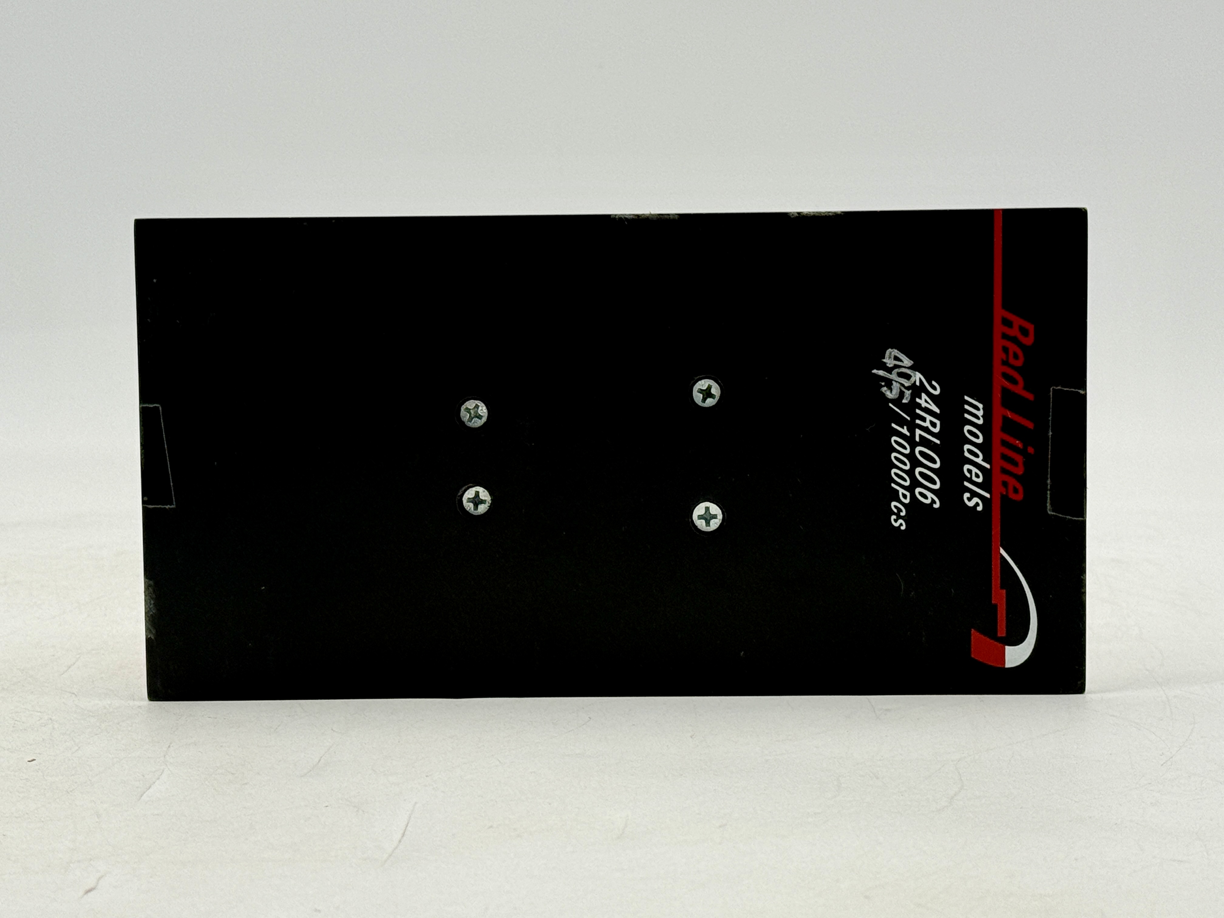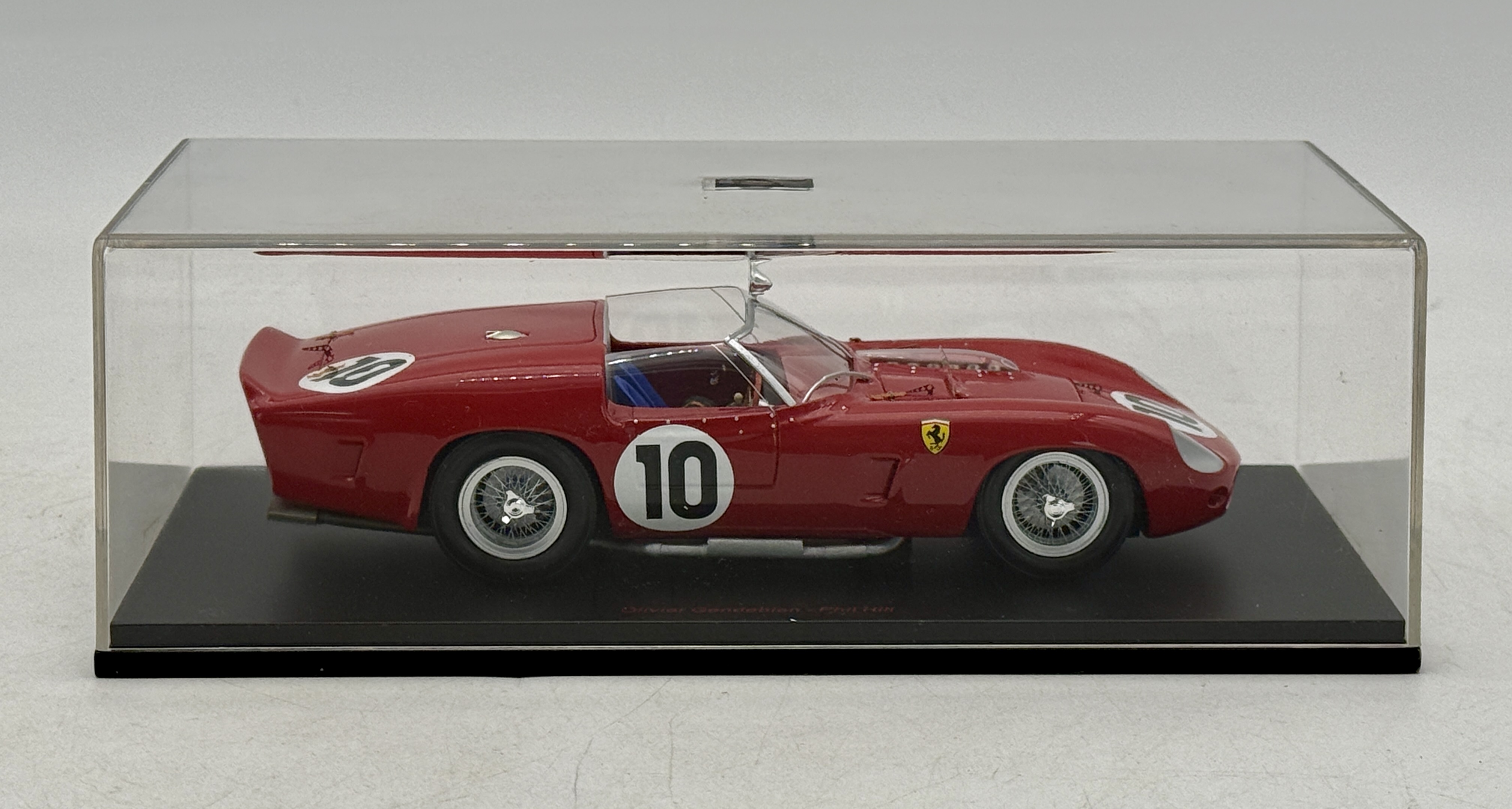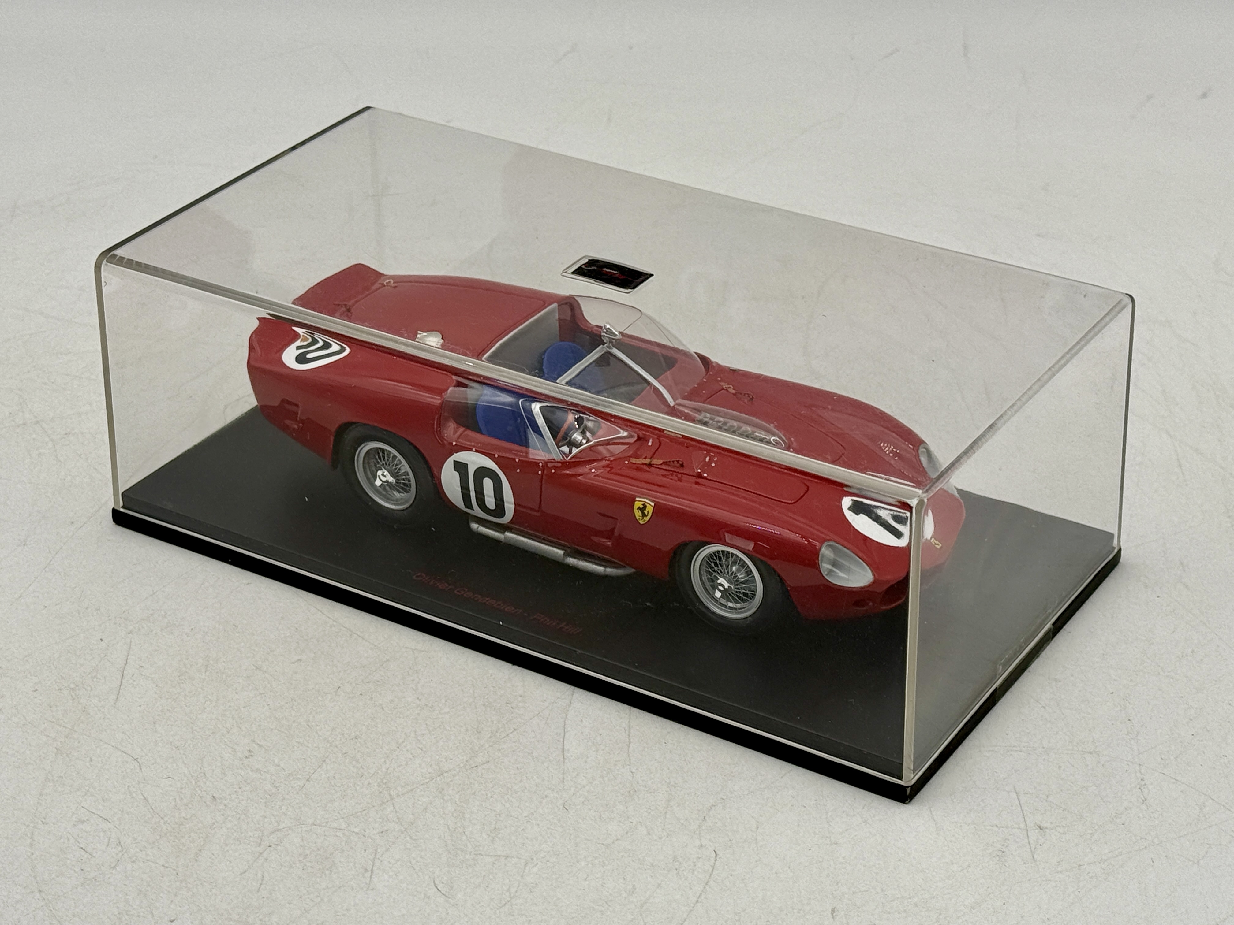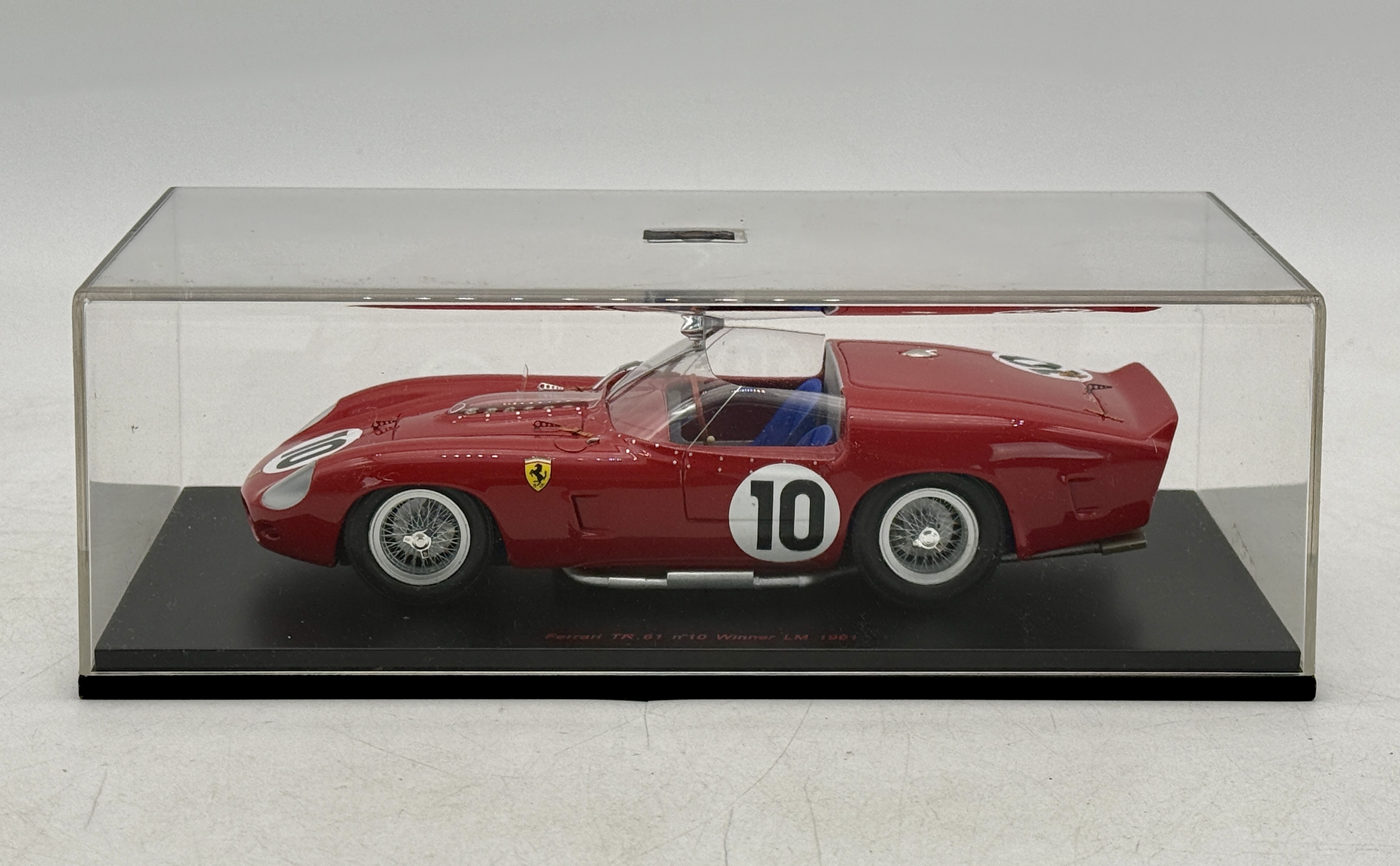 A red Red Line models Ferrari TR 61 n°10 Winner LM 1961 model racing car in a clear display case featuring markings for drivers Olivier Gendebien and Phil Hill and a label on the base identifying it as model 24RL006, number 495 of 1000 pieces. 7″ long, OB C9