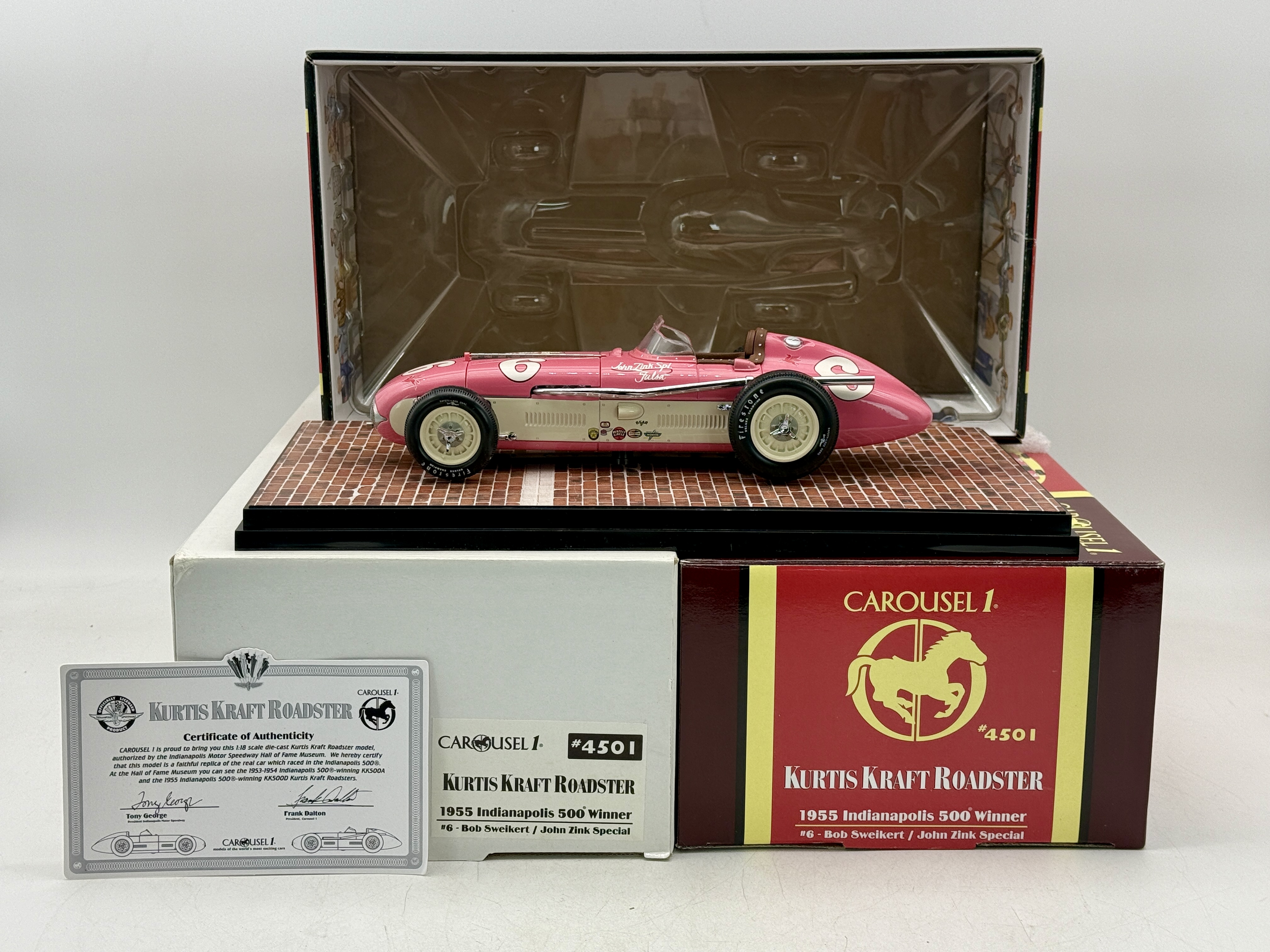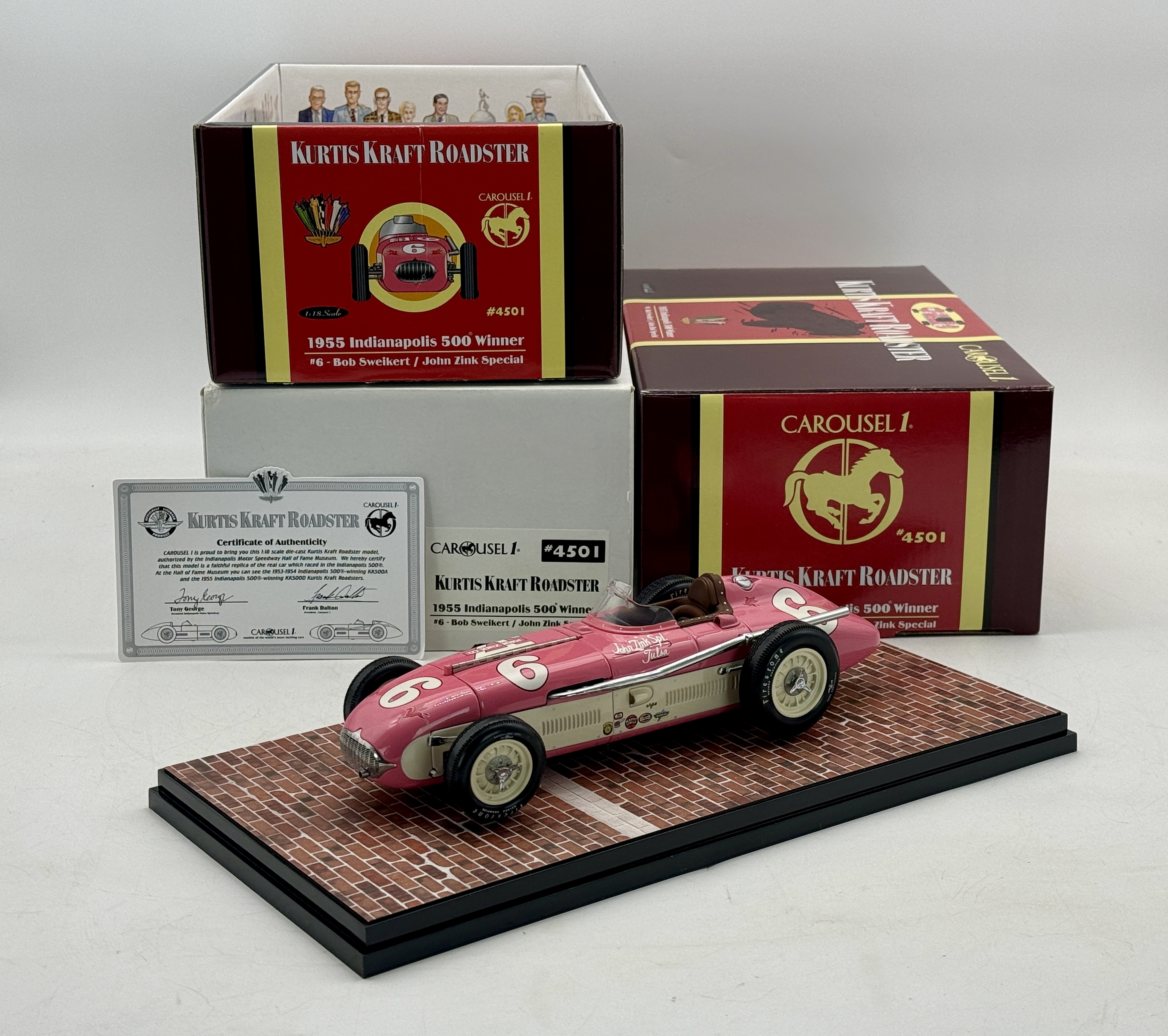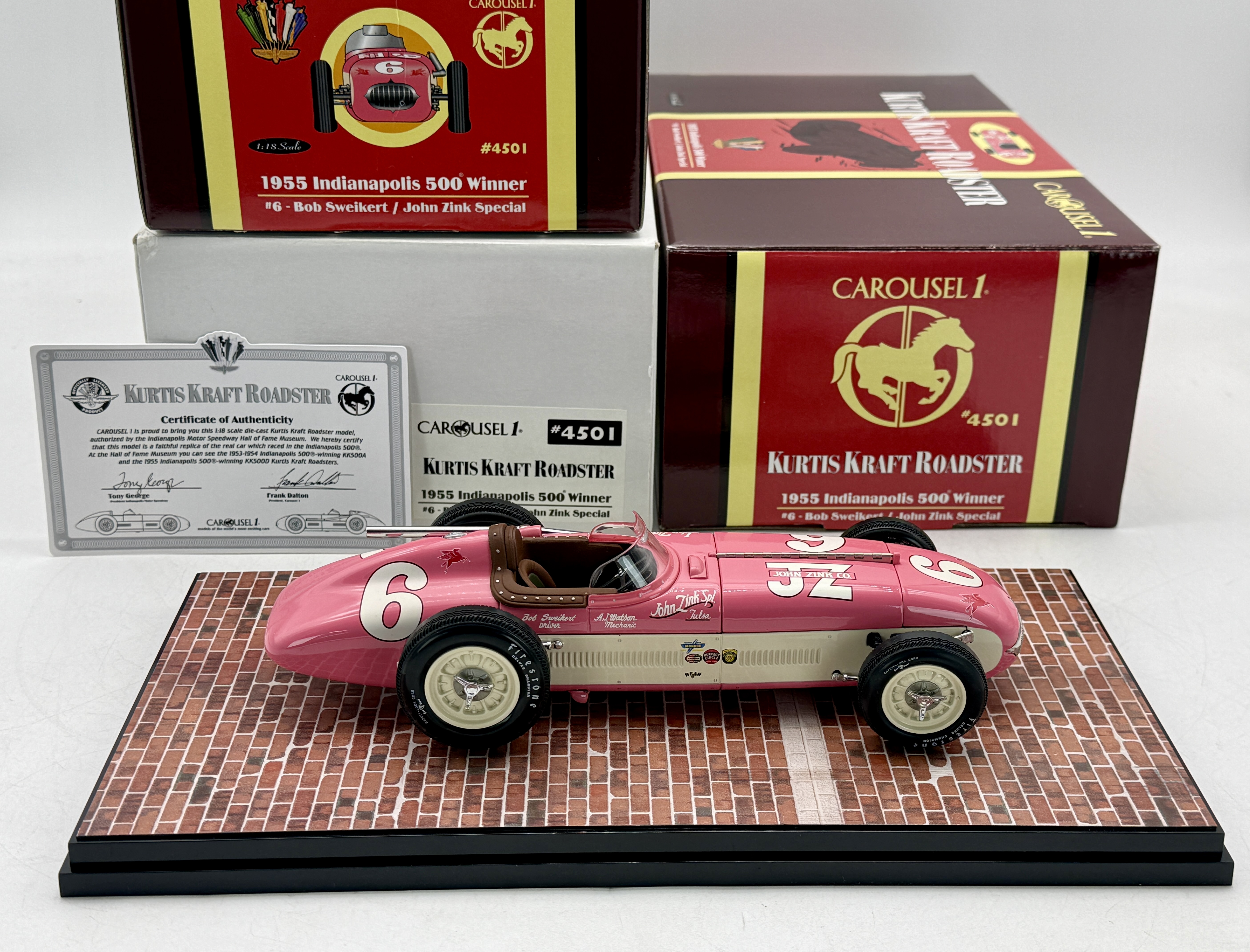 A pink and cream 1/18 scale Carousel 1 #4501 Kurtis Kraft Roadster die-cast model of the 1955 Indianapolis 500 winner driven by Bob Sweikert, including several original boxes and a certificate of authenticity. 9 inches long with shipping box, OB and inserts and certificate, C9