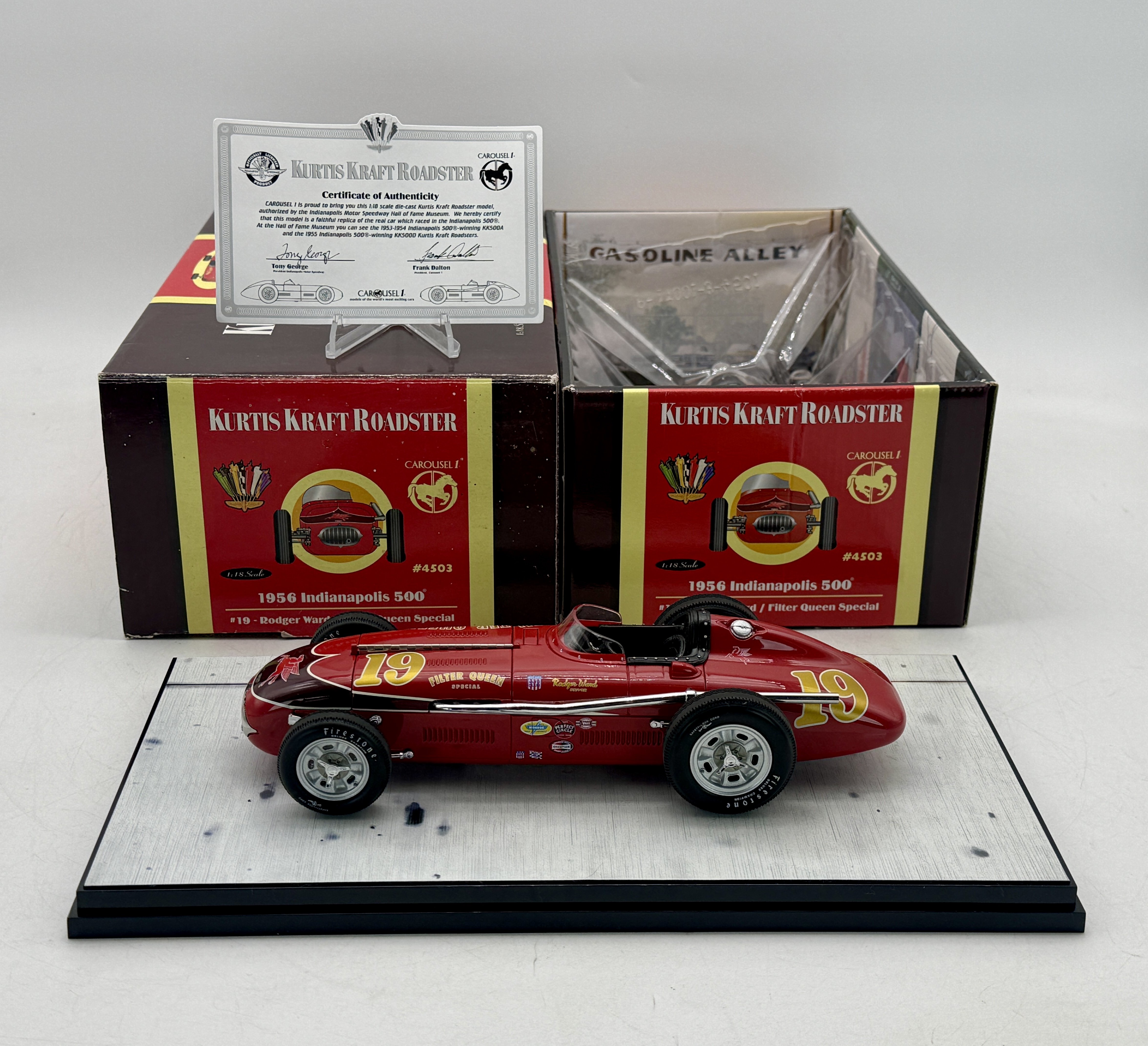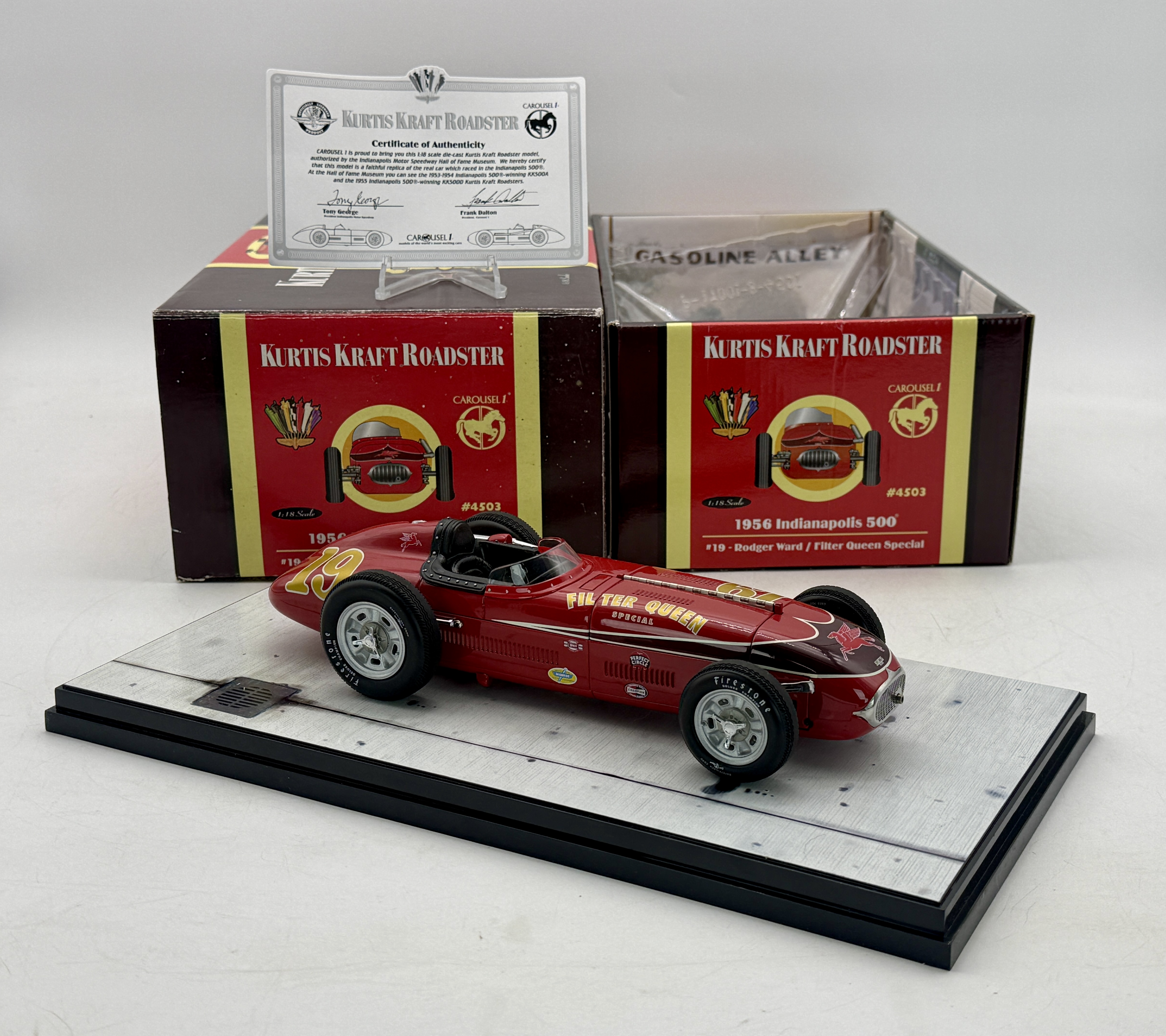 A 1:18 scale die-cast Kurtis Kraft Roadster #19 Filter Queen Special driven by Rodger Ward in the 1956 Indianapolis 500, including original packaging and certificate of authenticity. 9 inches long, OB and insert and certificate C9.