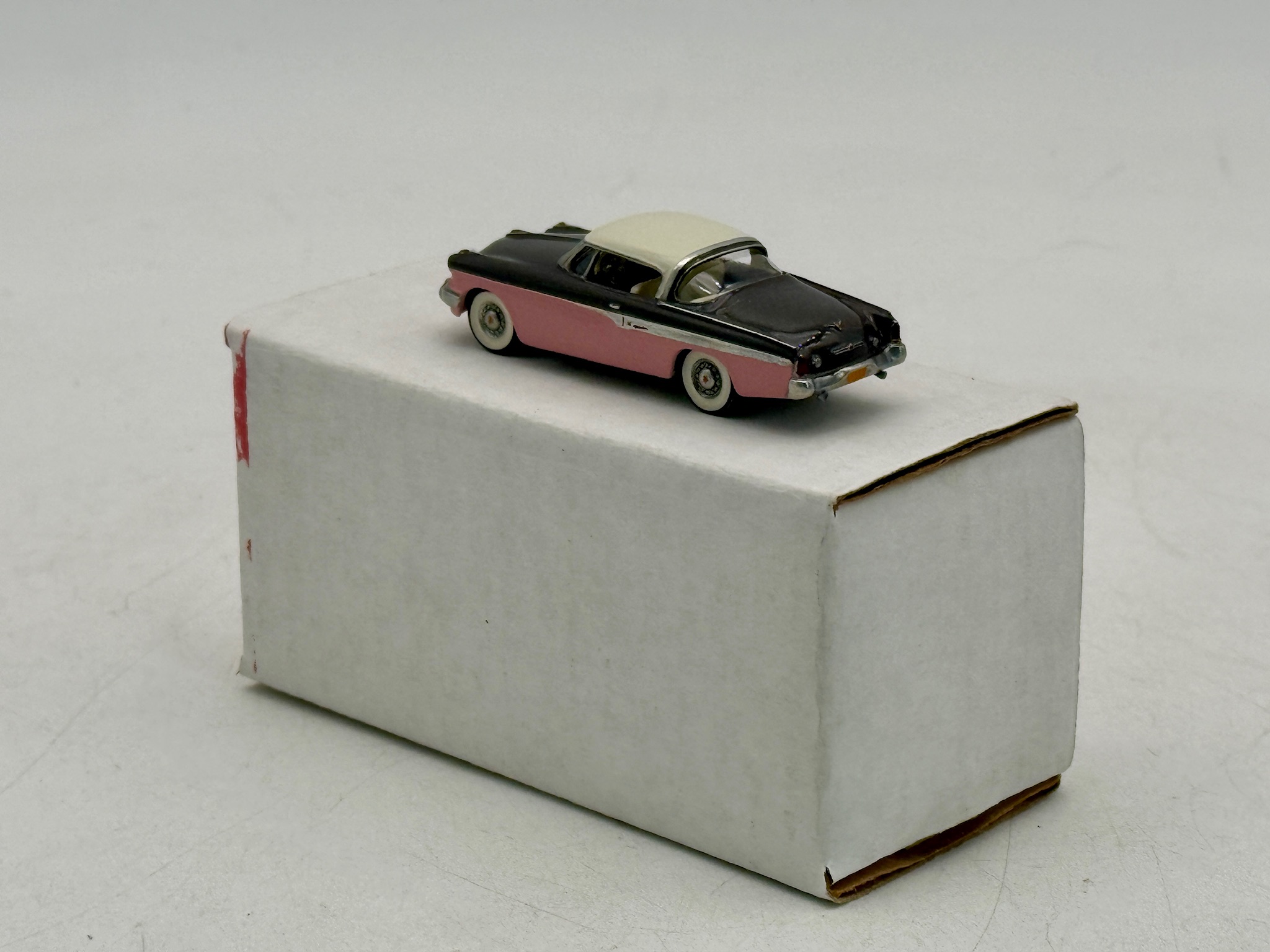A 1:72 scale model of a 1955 Studebaker President Speedster finished in Congo Ivory, Pimlico Grey, and Coraltone with its original labeled box. C9