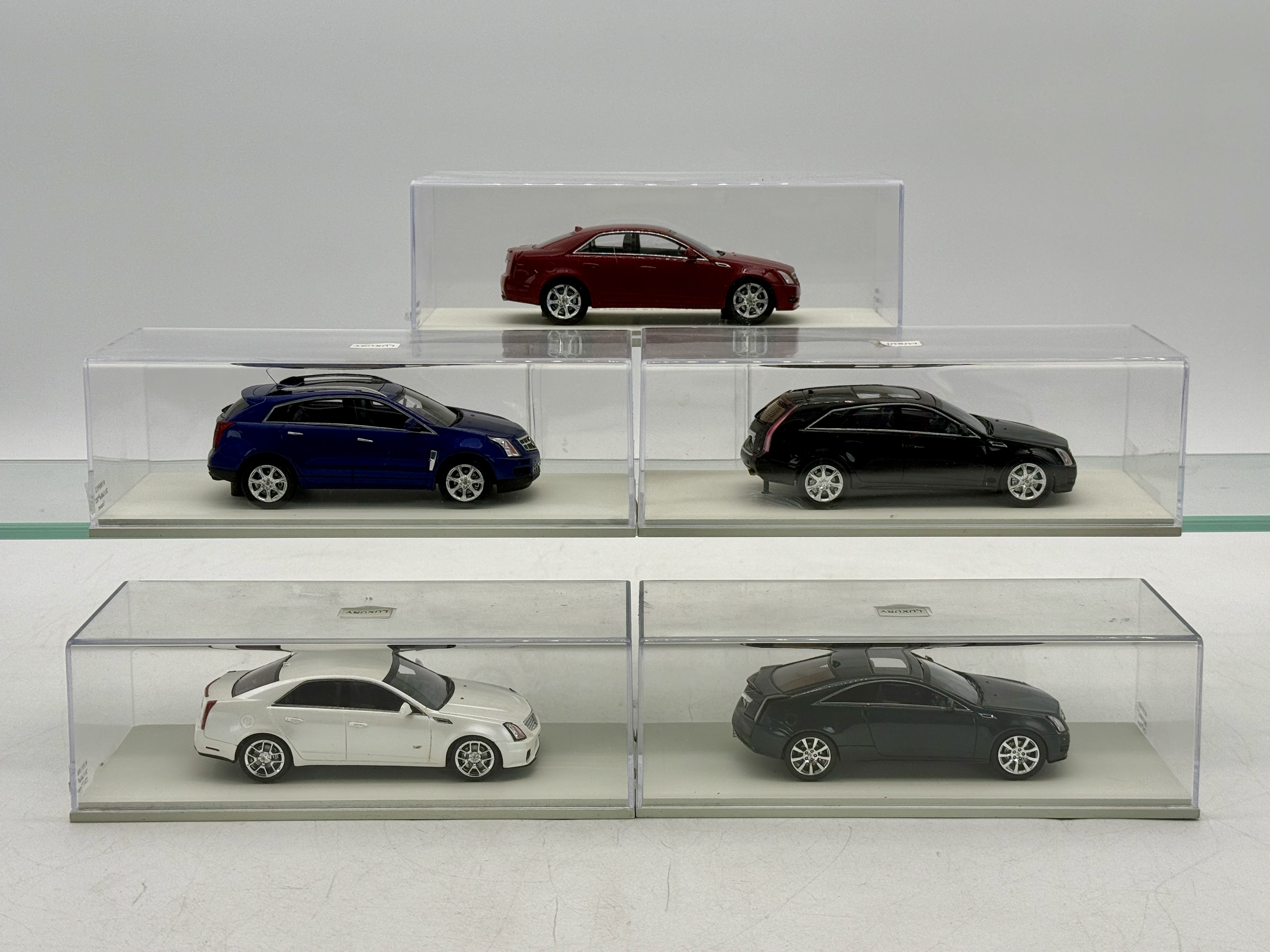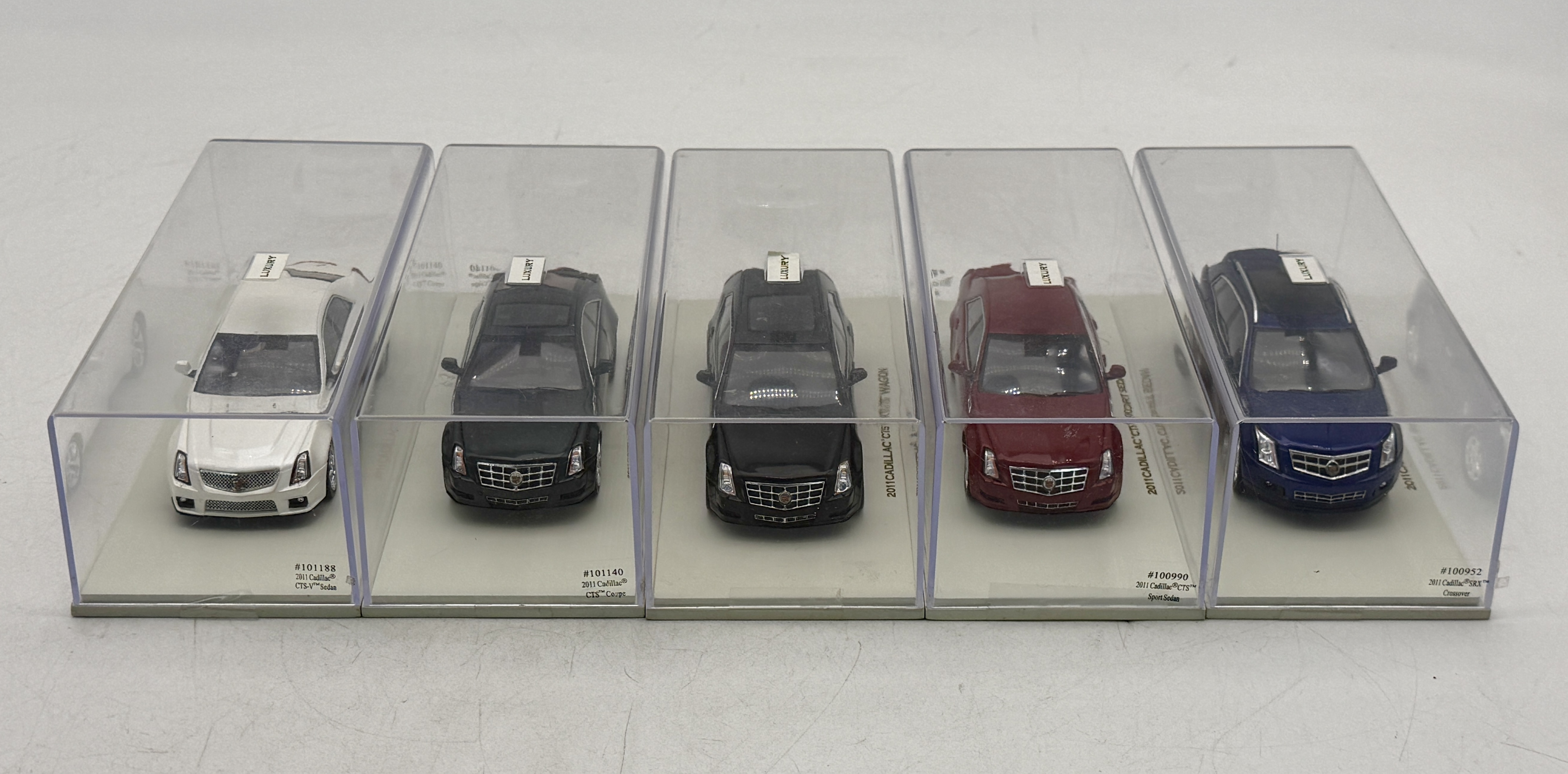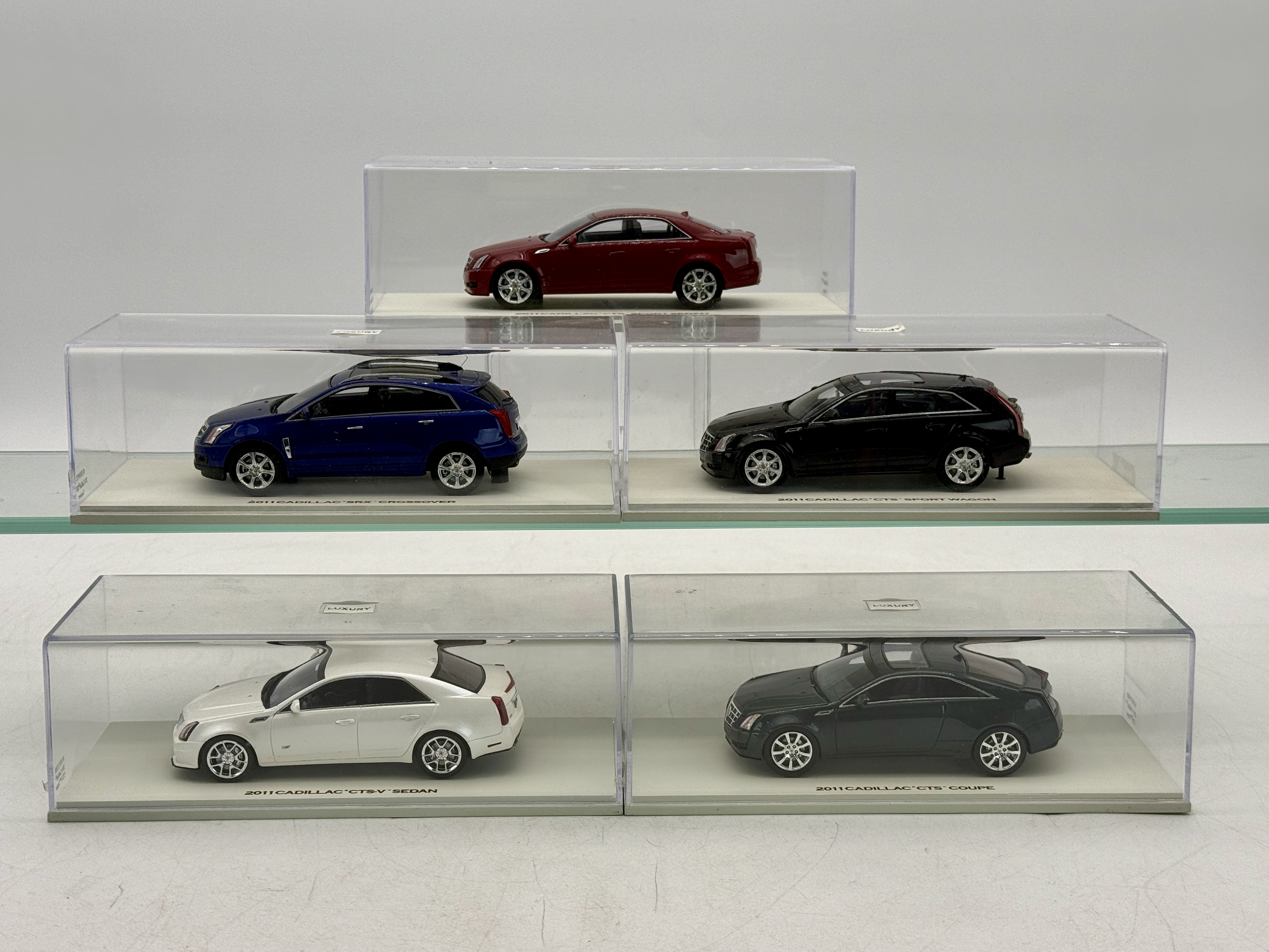 5 1:43 scale resin 2011 Cadillac model cars including a white CTS-V Sedan, dark grey CTS Coupe, black CTS Sport Wagon, blue SRX Crossover, and red CTS Sport Sedan in clear display cases. OB missing cardboard sleeves. C9