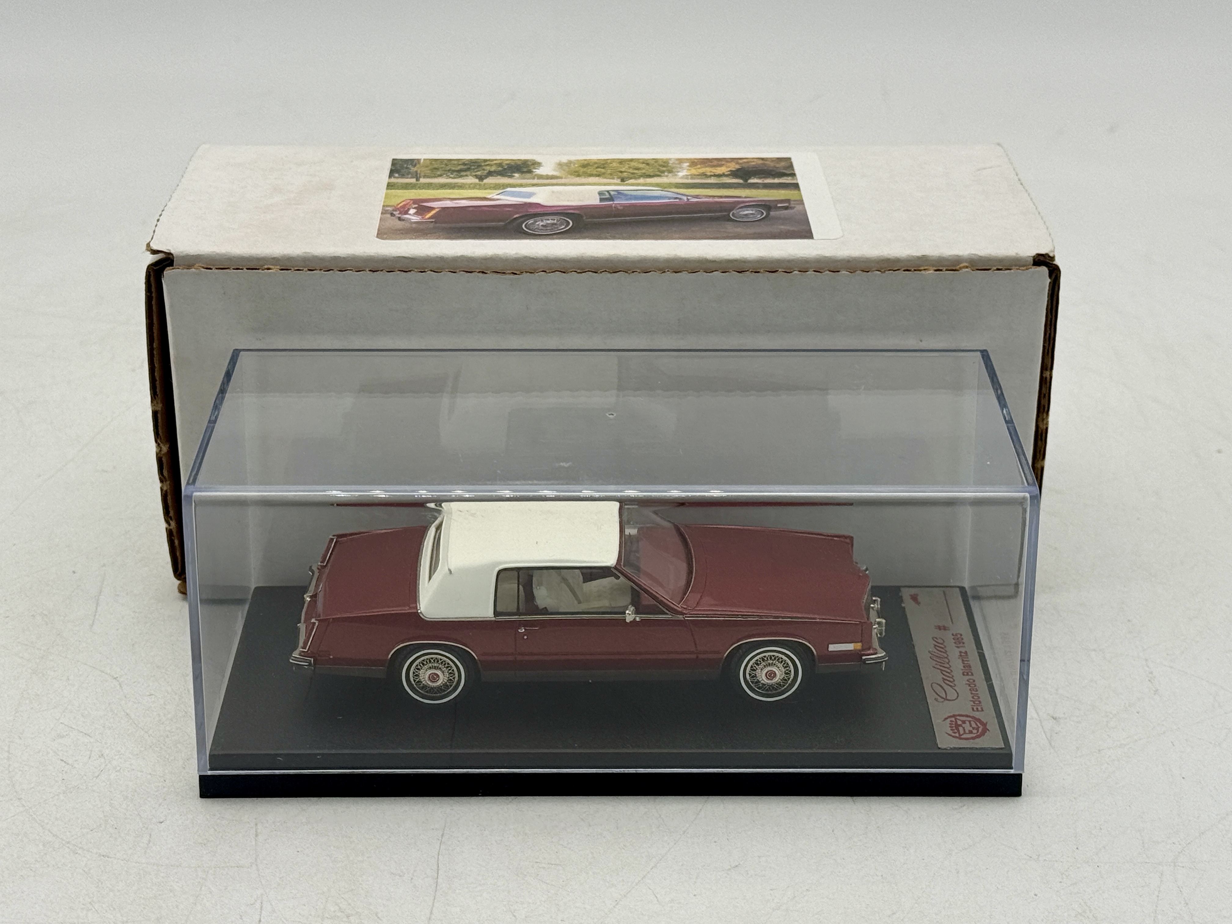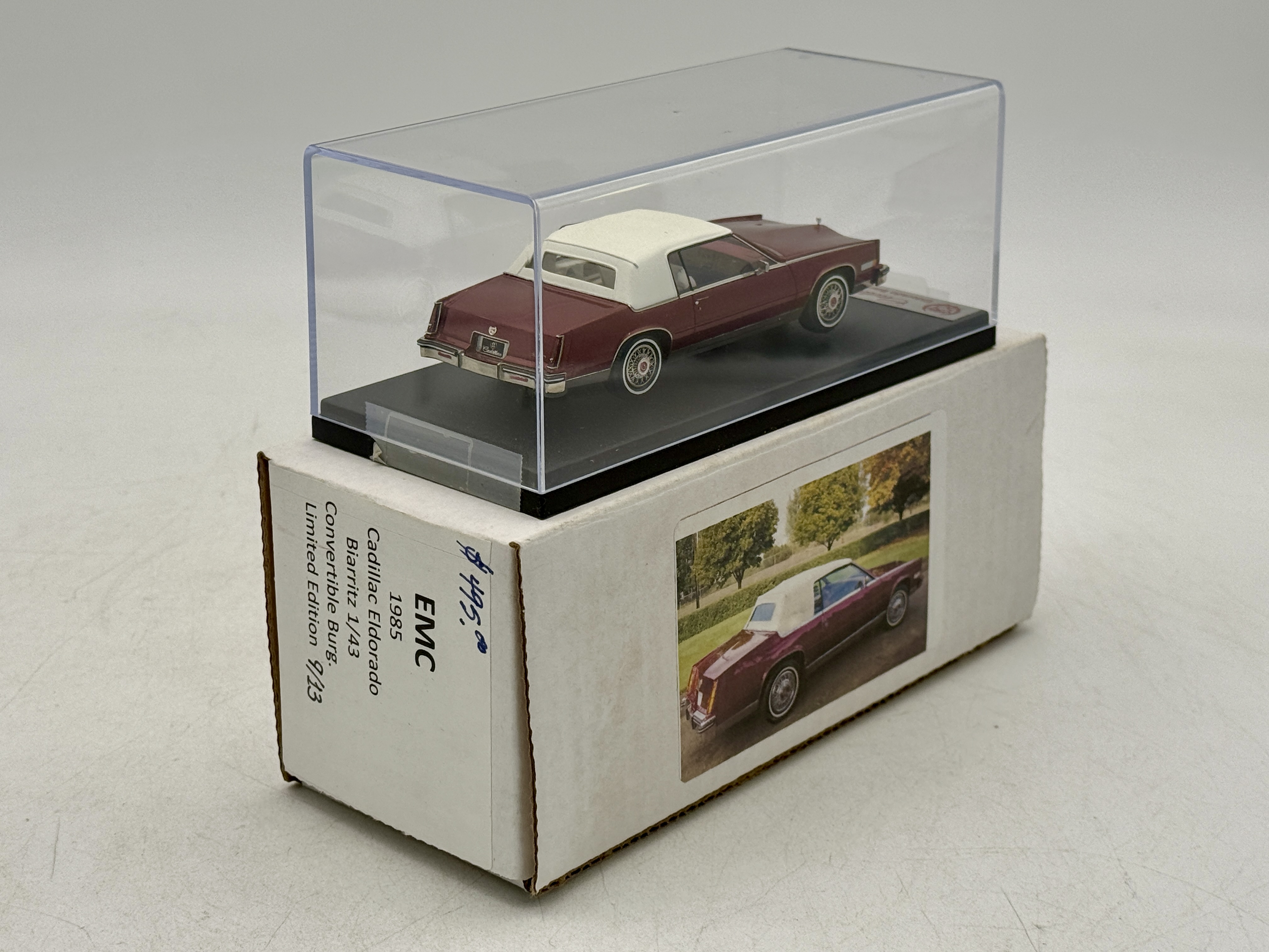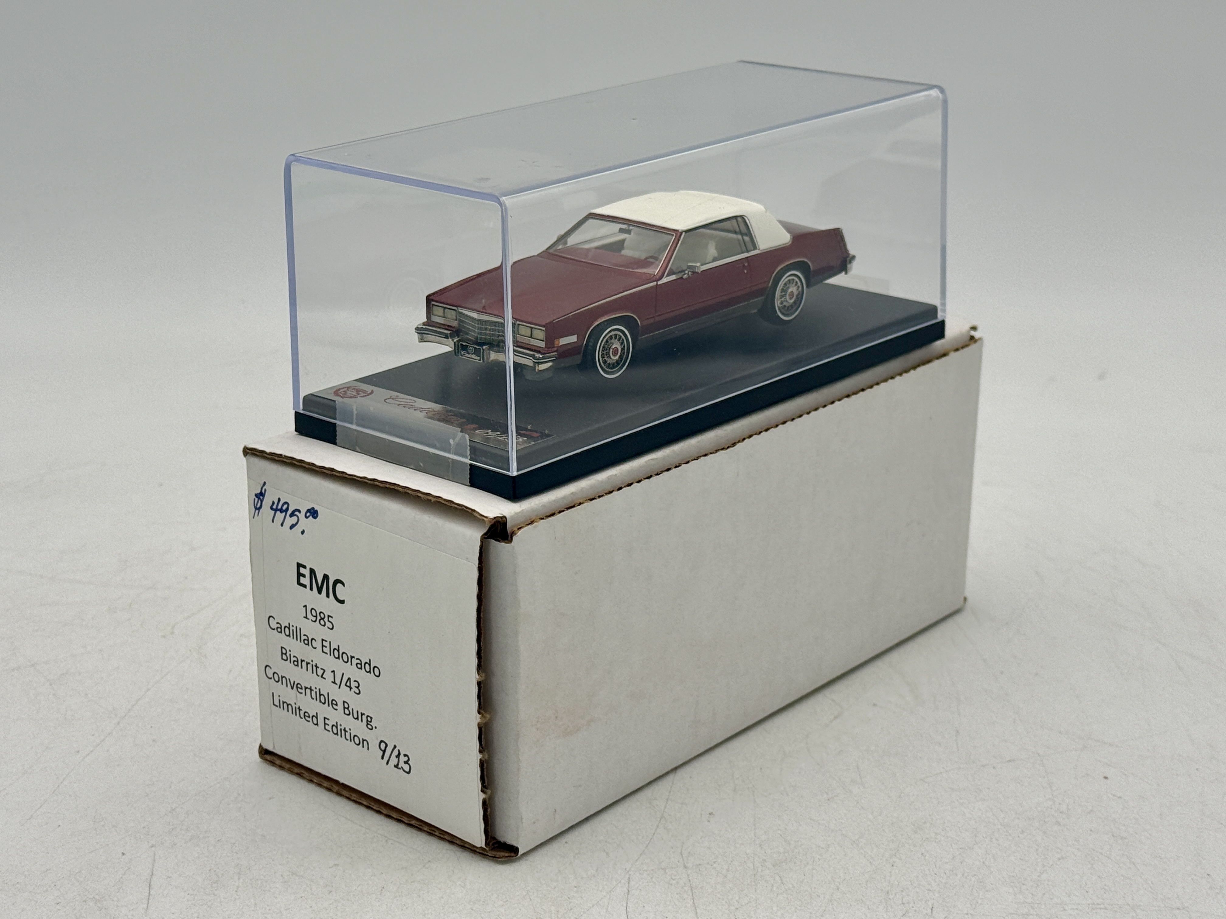 A burgundy and white 1/43 scale EMC 1985 Cadillac Eldorado Biarritz limited edition model numbered 9 of 13 in its original box and display case. 1:43 scale, OB and insert C9.