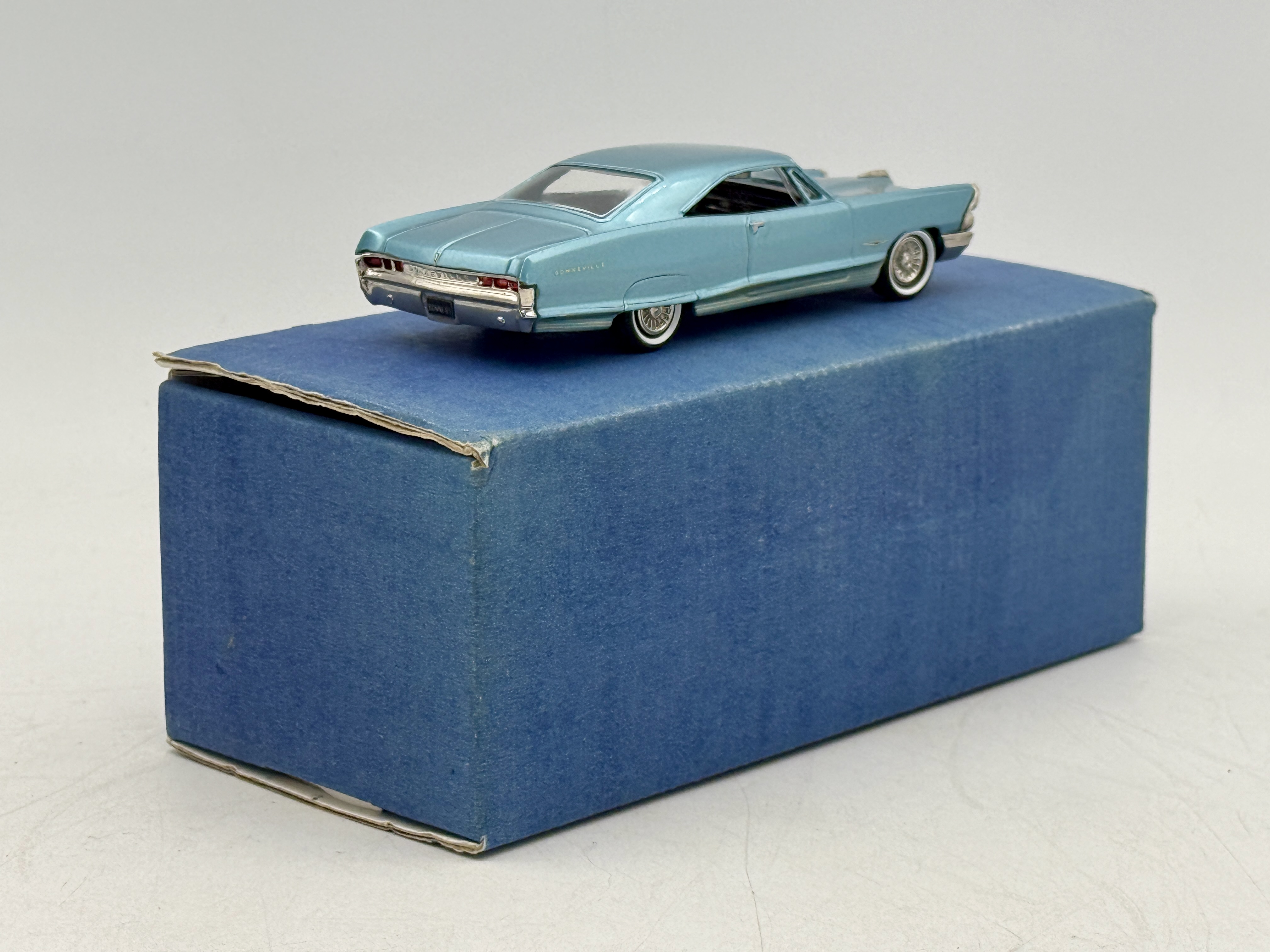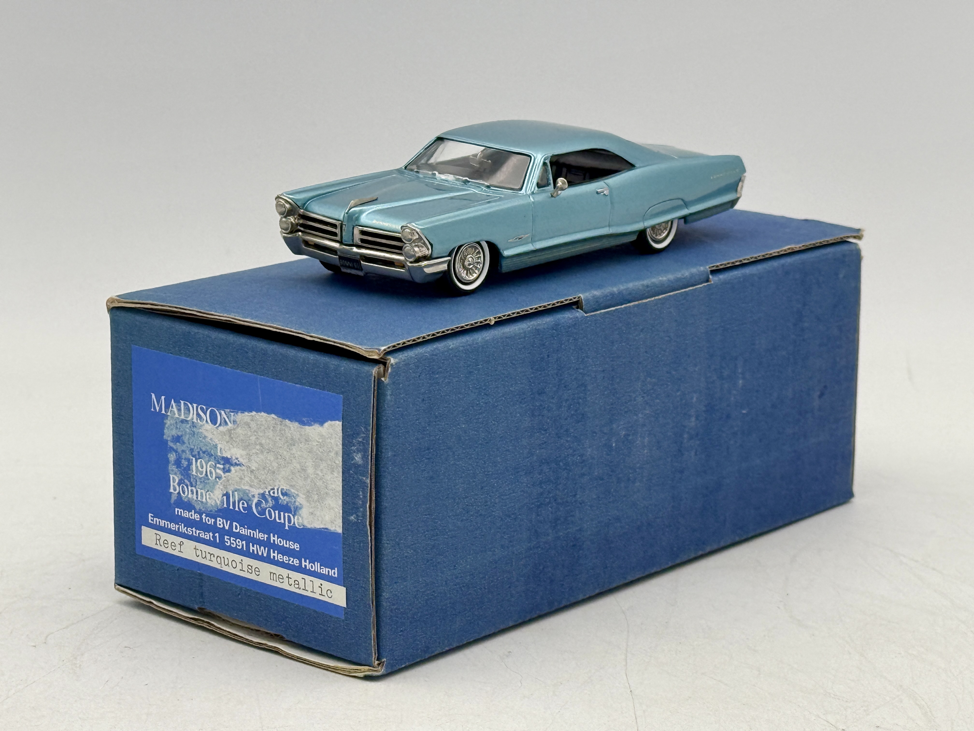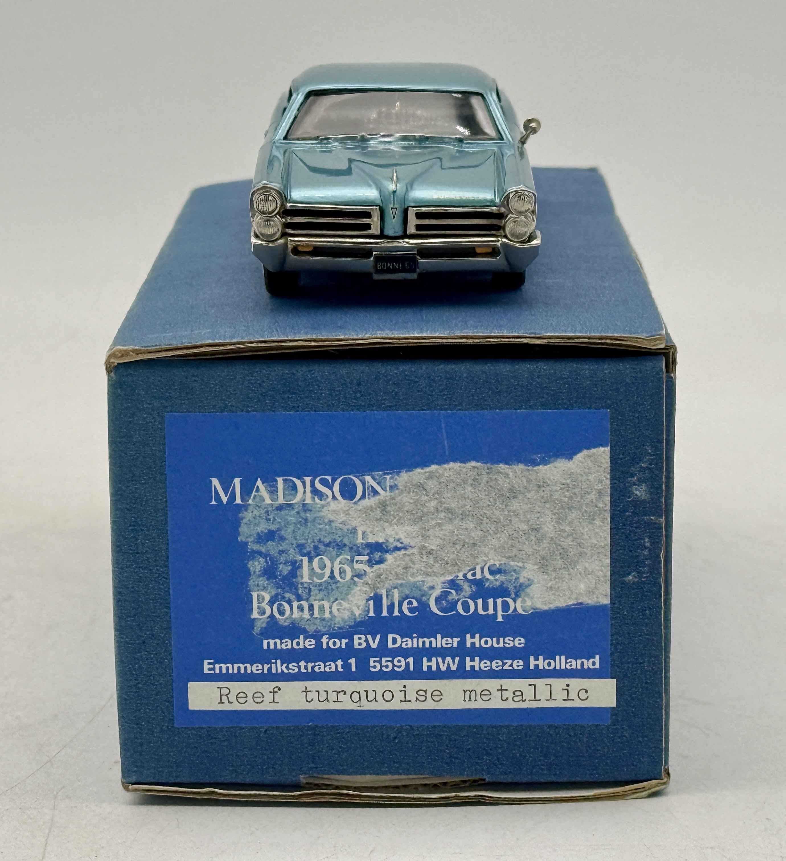 A 1/43 scale, white metal, Madison model of a 1965 Pontiac Bonneville Coupe in reef turquoise metallic with its original blue box labeled for BV Daimler House. OB mw C9.