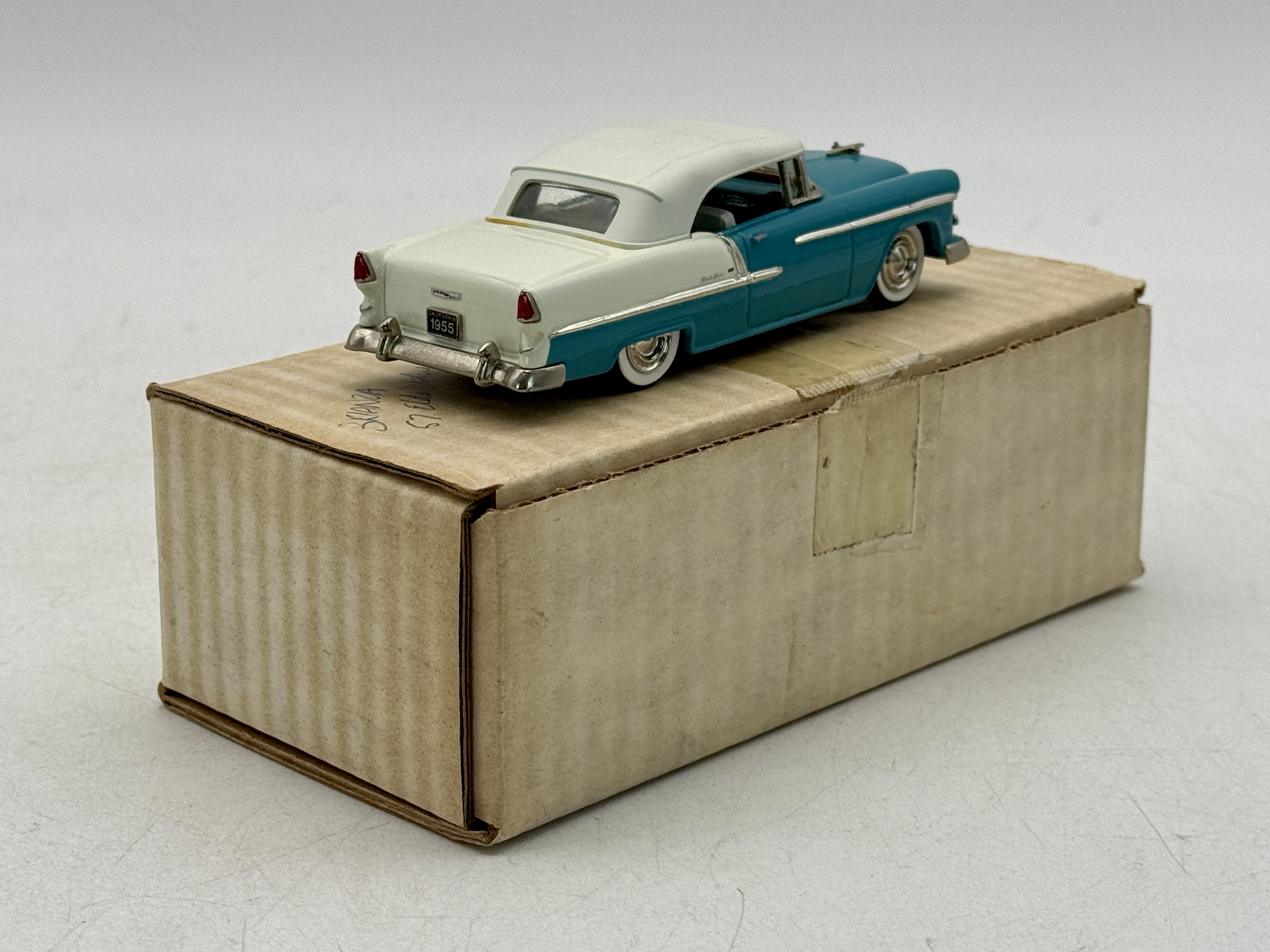 A teal and white 1955 Chevrolet Bel Air convertible model car in the top up configuration with its original box. 1:43 scale, white metal, OB C9.