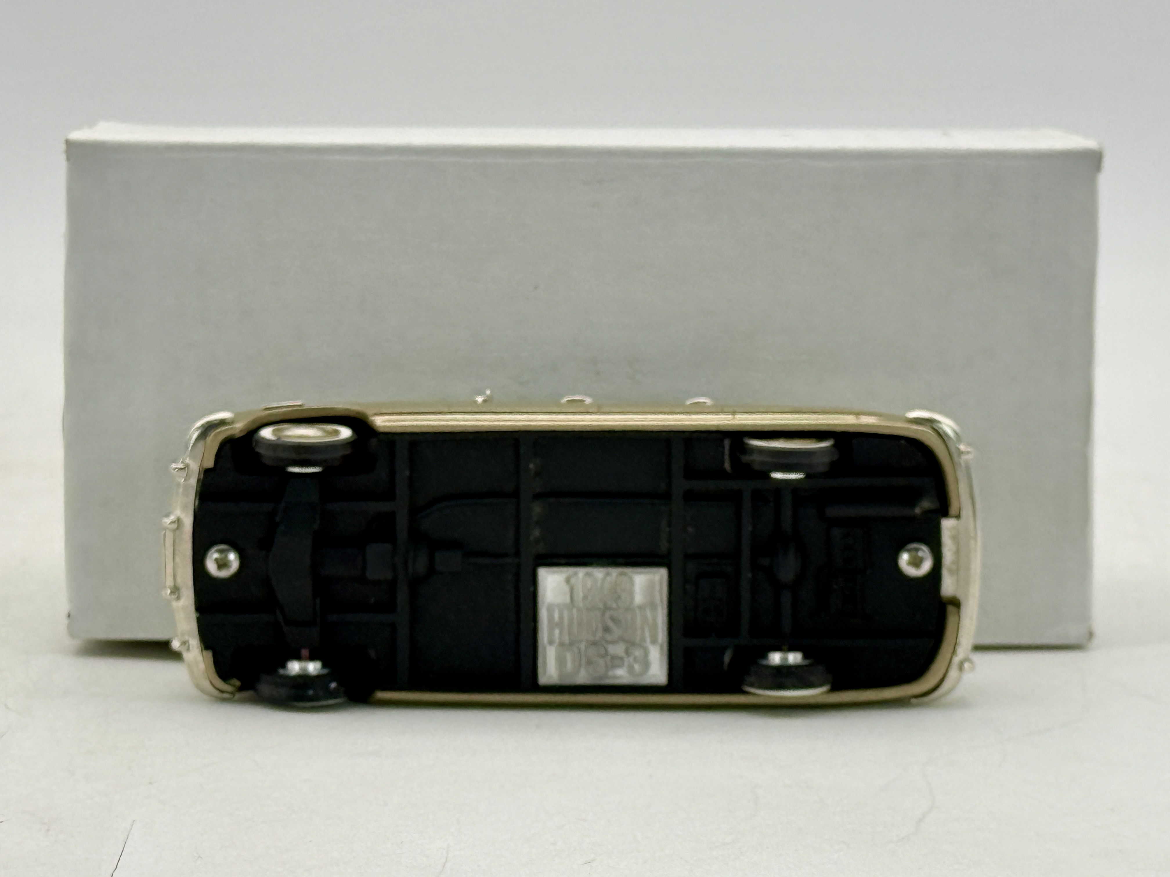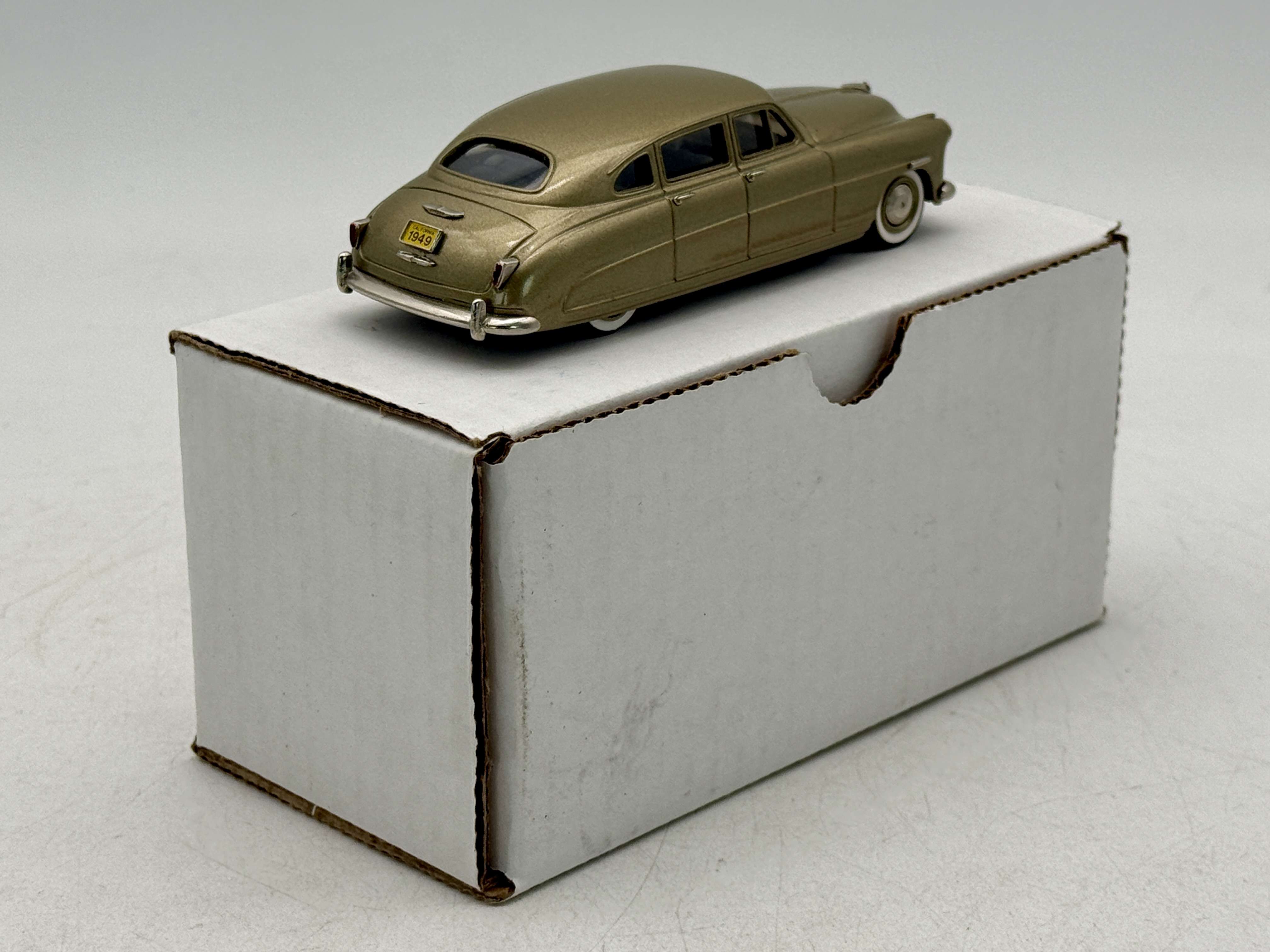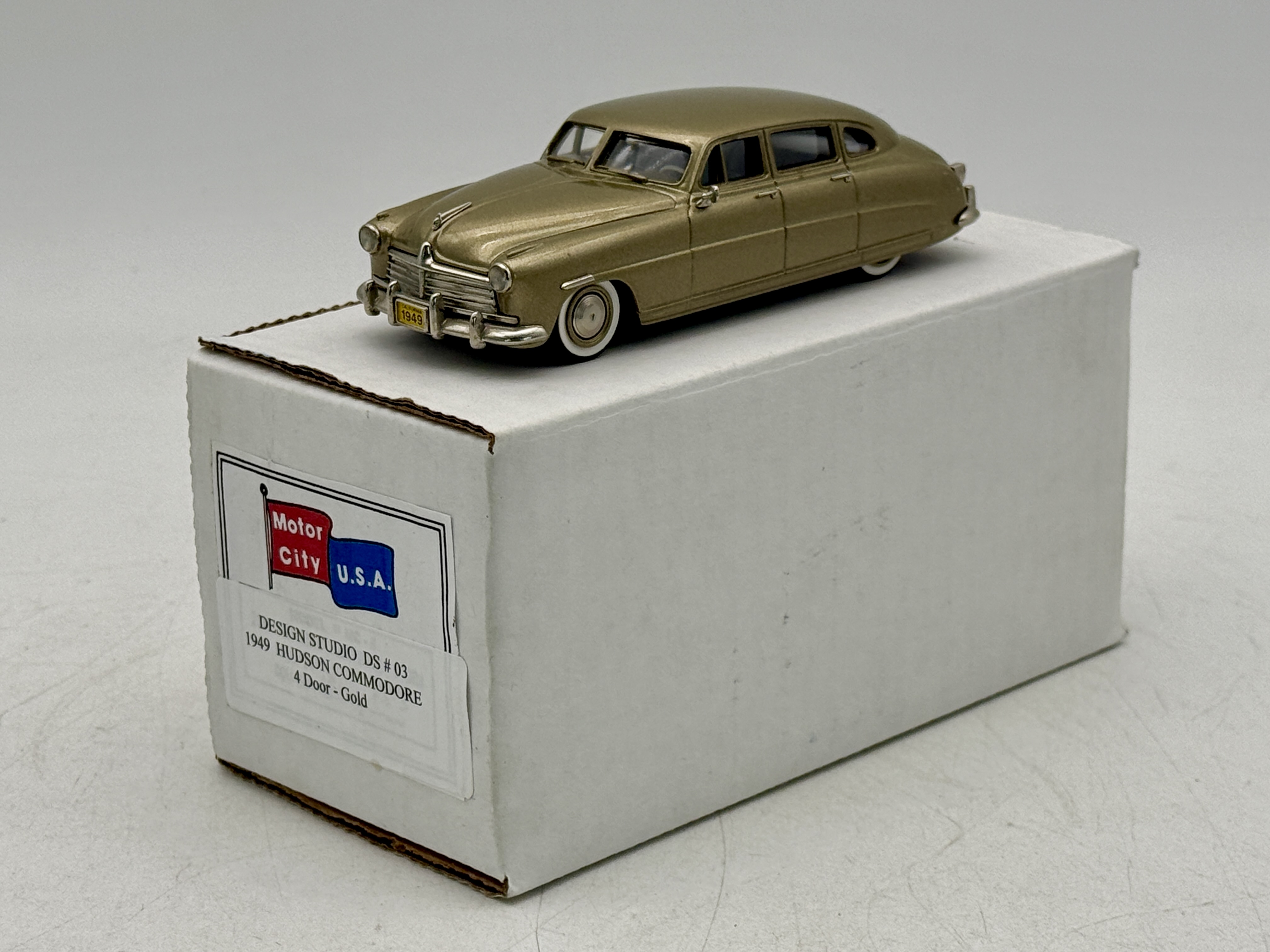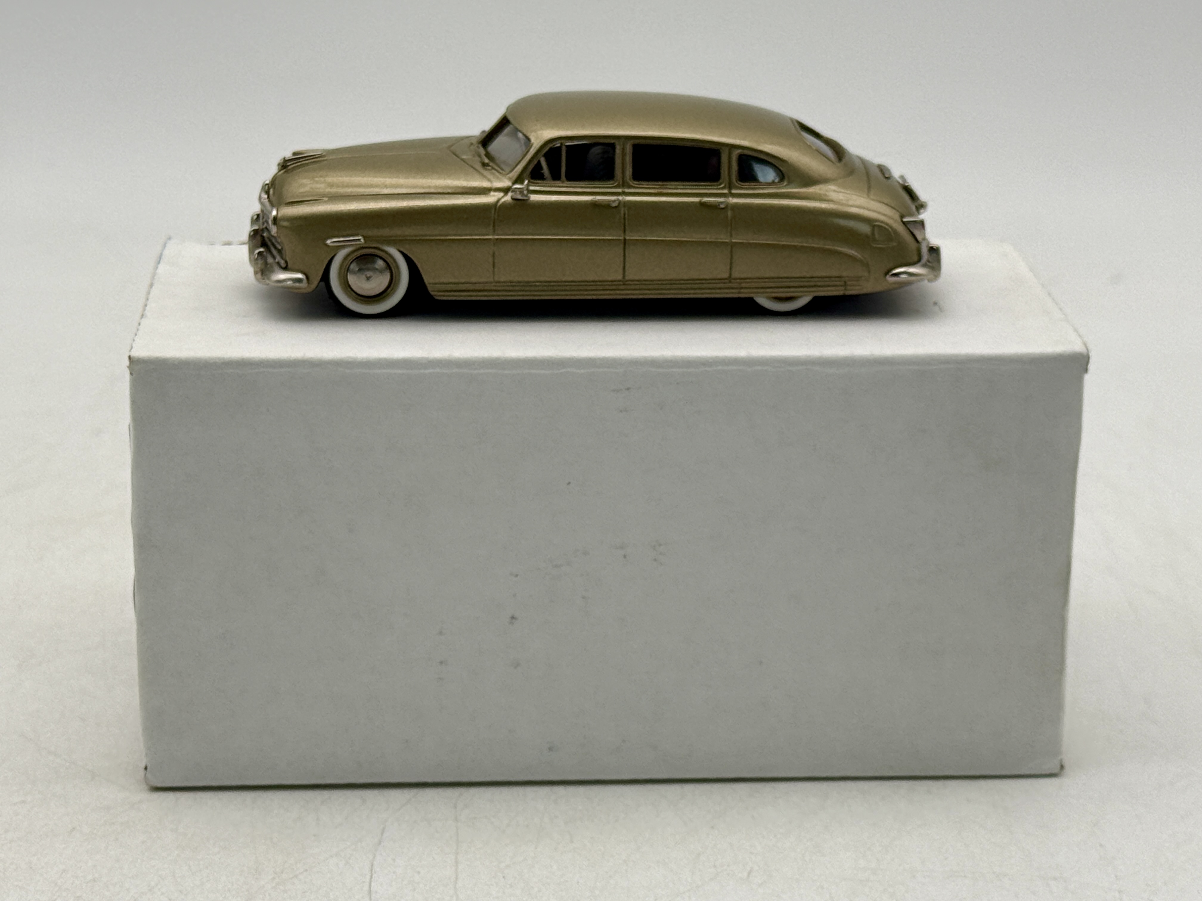 A gold-colored 1/43 scale die-cast 1949 Hudson Commodore 4-door sedan model by Motor City U.S.A. Design Studio DS # 03 with original box. white metal OB C9.