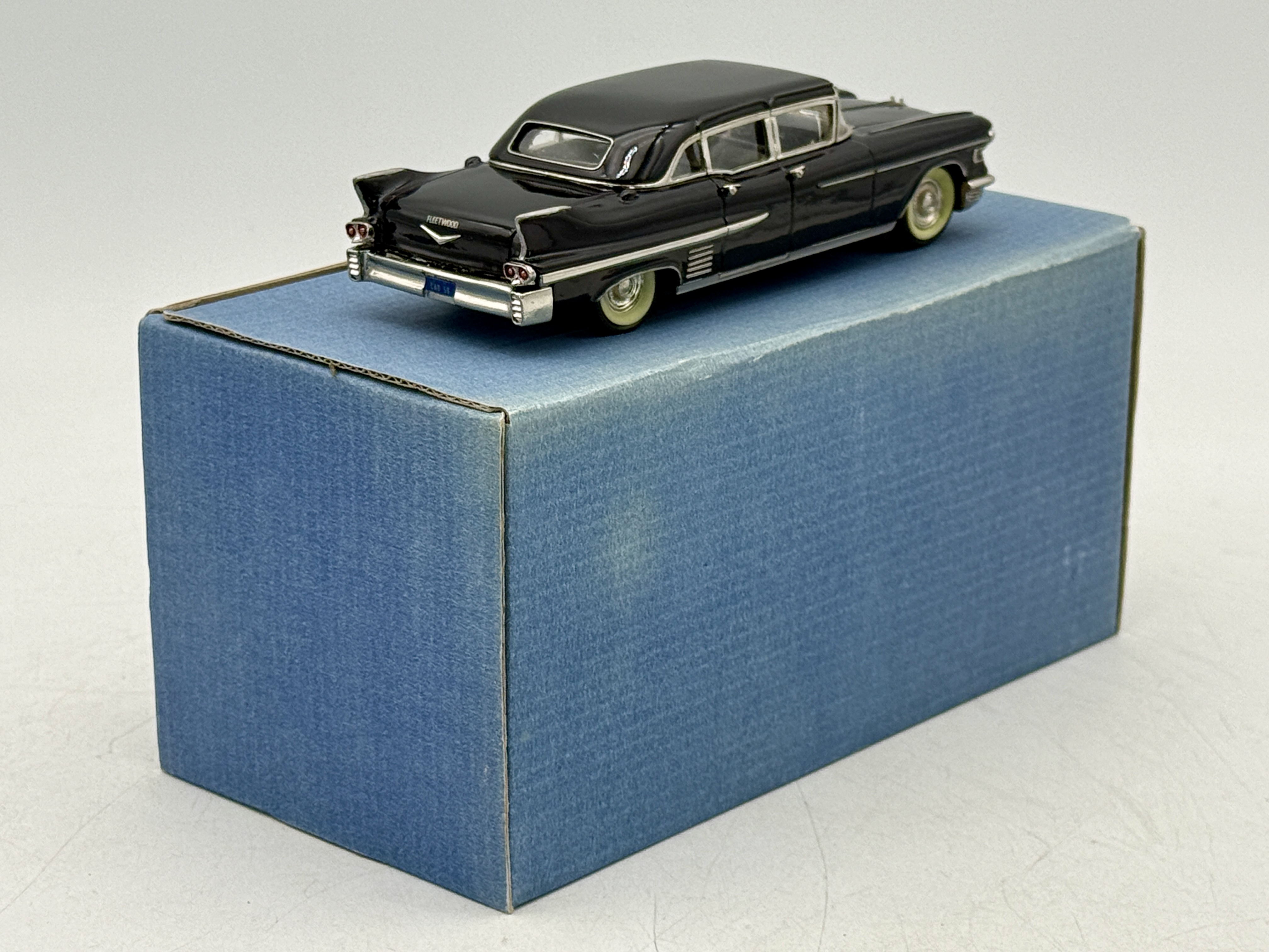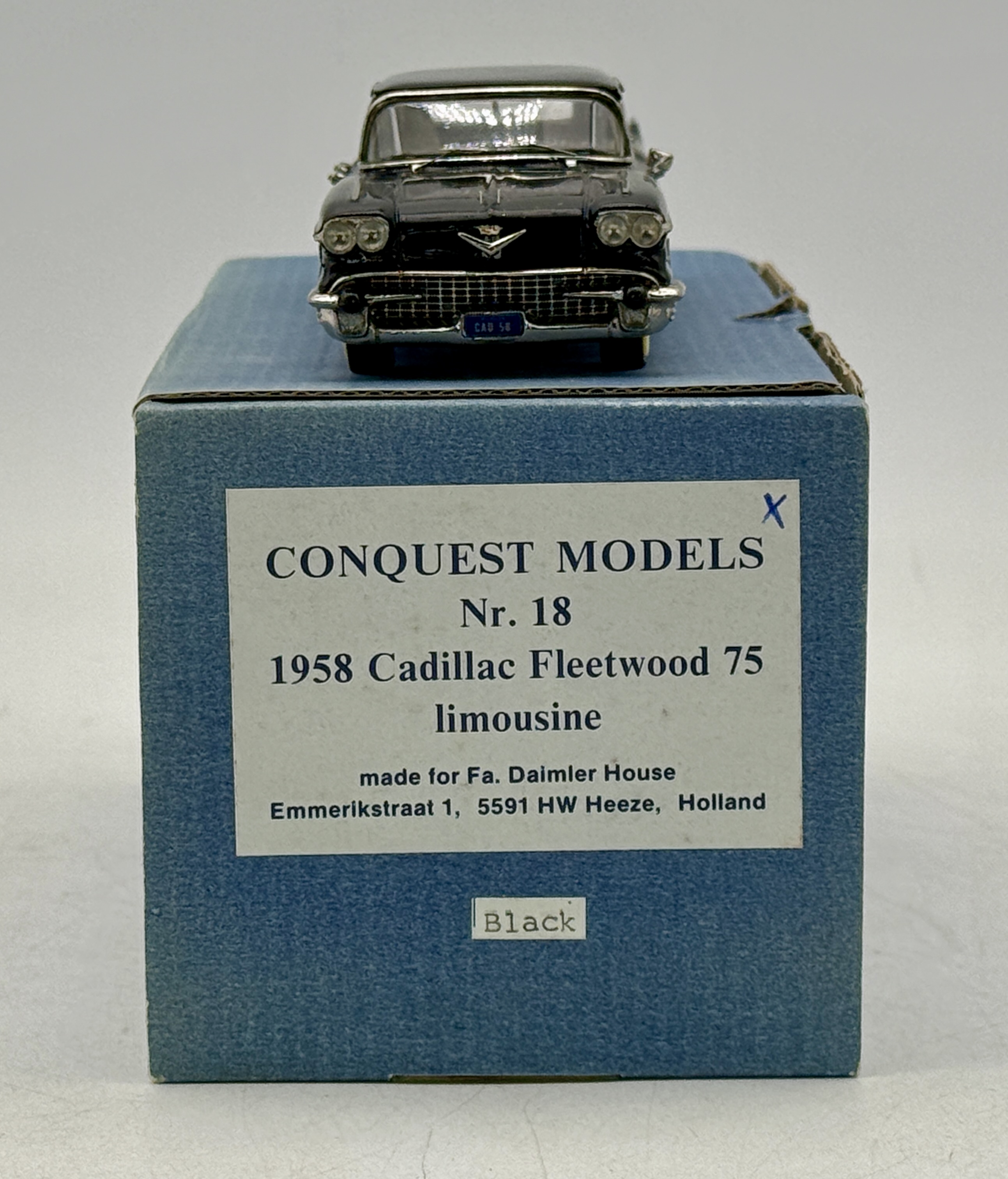 A black Conquest Models Nr. 18 1958 Cadillac Fleetwood 75 limousine featuring CAD 58 license plates and its original blue box. white metal. OB C9